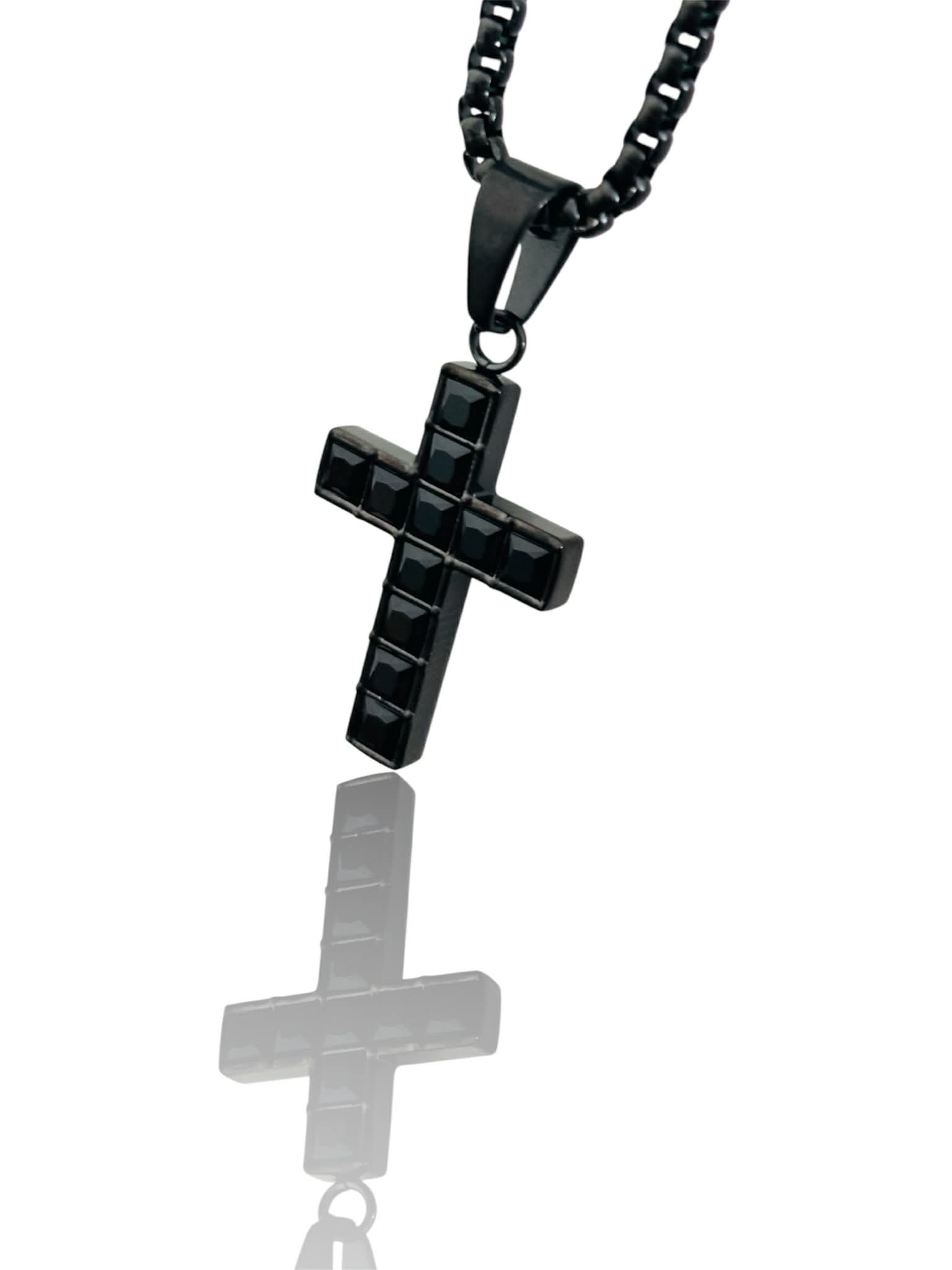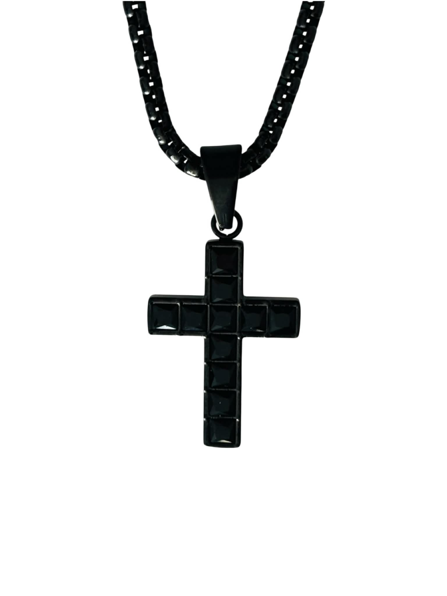 Αντρικό κολιέ απο ανοξείδωτο ατσάλι , με μάυρη πατίνα. Αλυσίδα τύπου φίδι με μάυρο τετράγωνο σταυρό.
