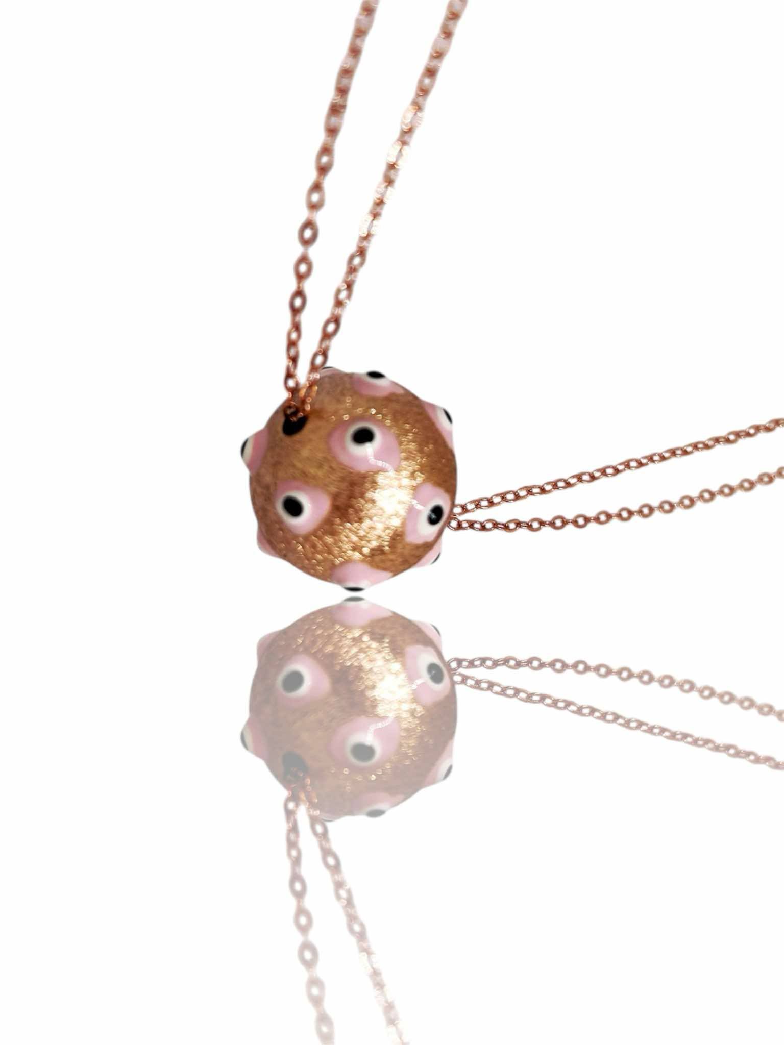Χειροποιήτο κολιέ απο οικολογικό ορύχαλκο με ρόζ χρύσωμα. Κλασική λεπτή αλυσίδα , περασμένη διπλά σε μια στρογγυλή μπάλα σαγρέ με ρόζ μάτια απο σμάλτο.