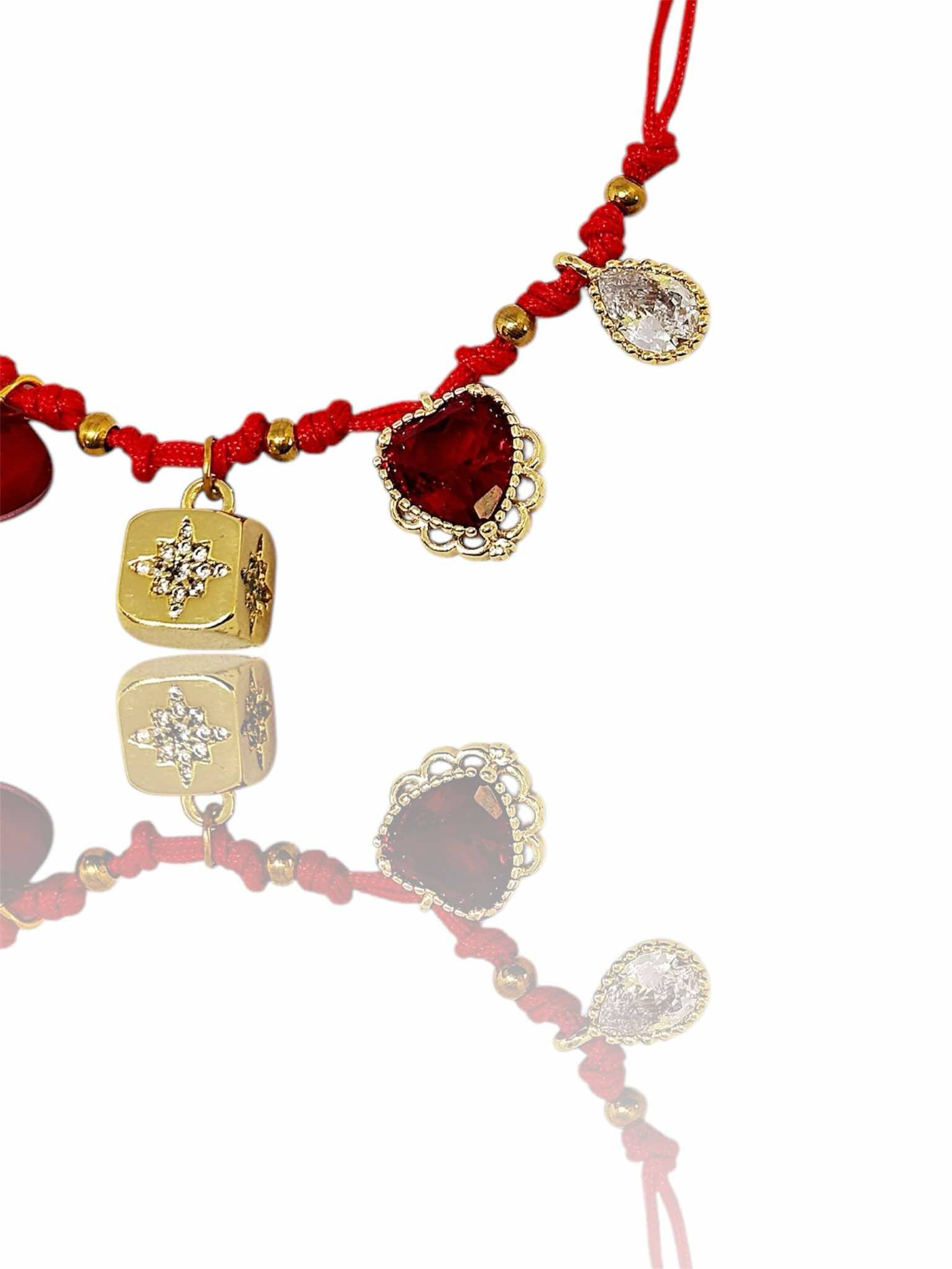 Χειροποιήτο βραχιόλι . Charm bracelet με κόκκινο κορδόνι κρέμονται 5 διαφορετικά μενταγιόν.Κούμπωμα μακράμε, αυξομειώνει.
