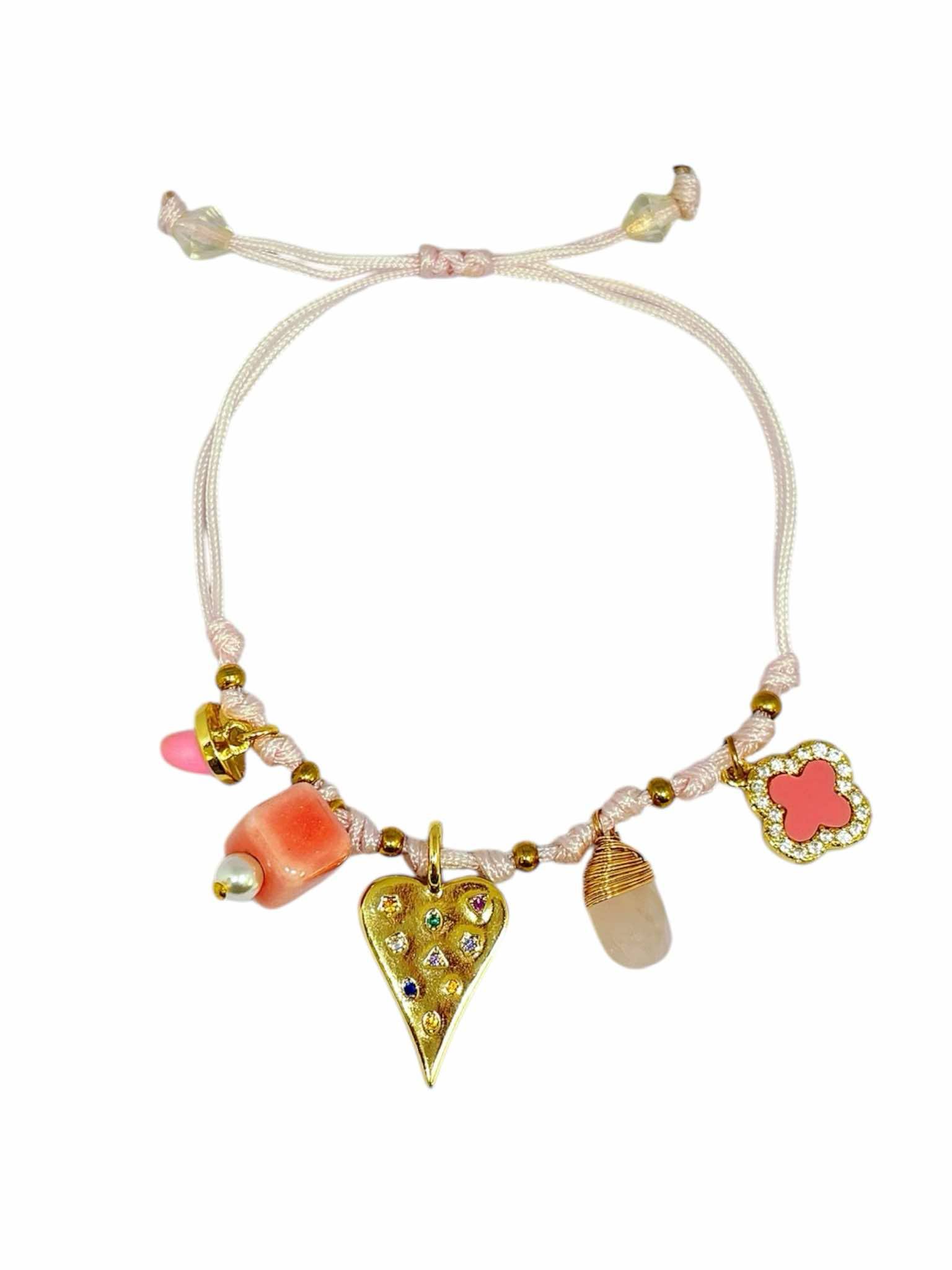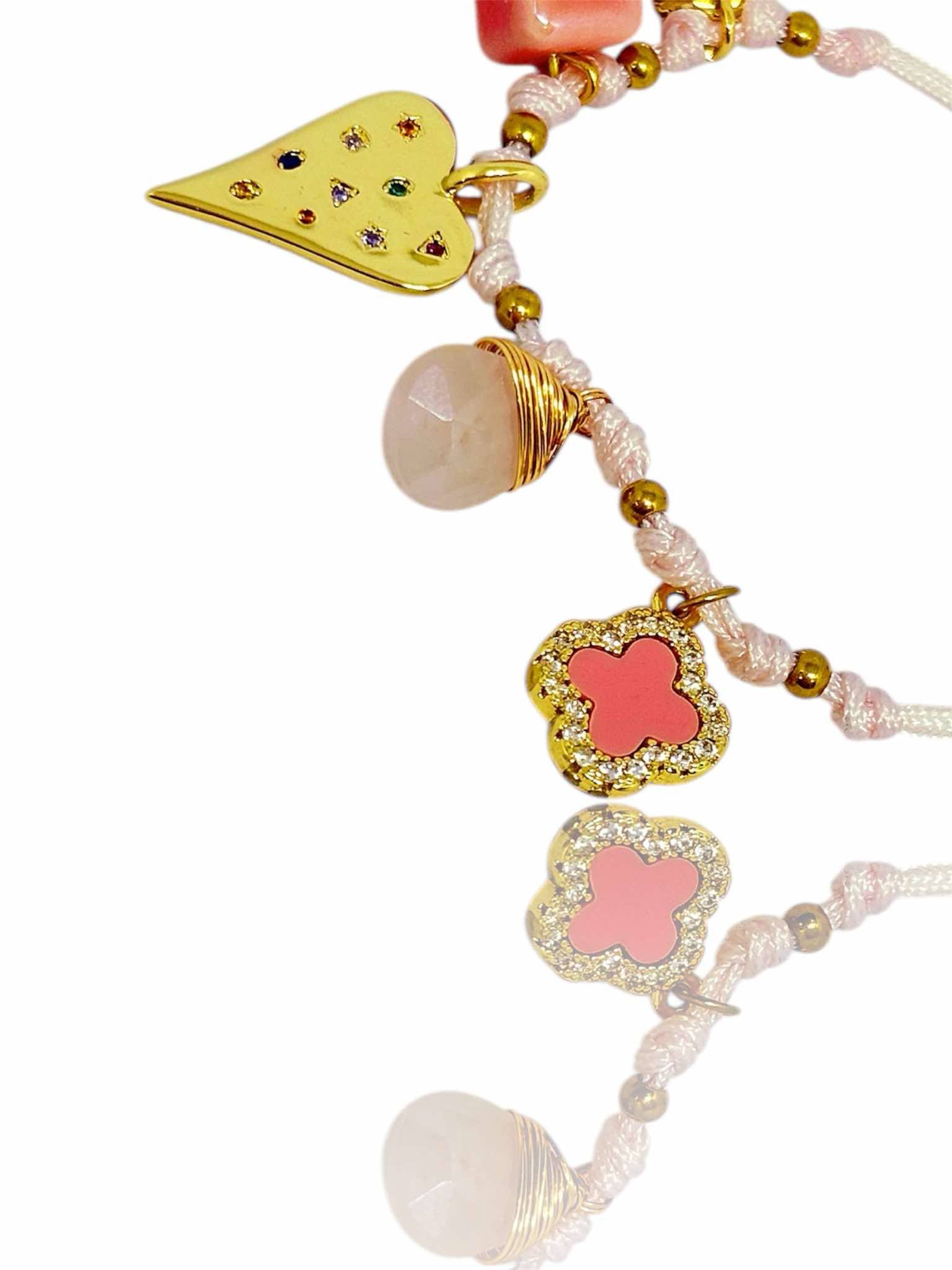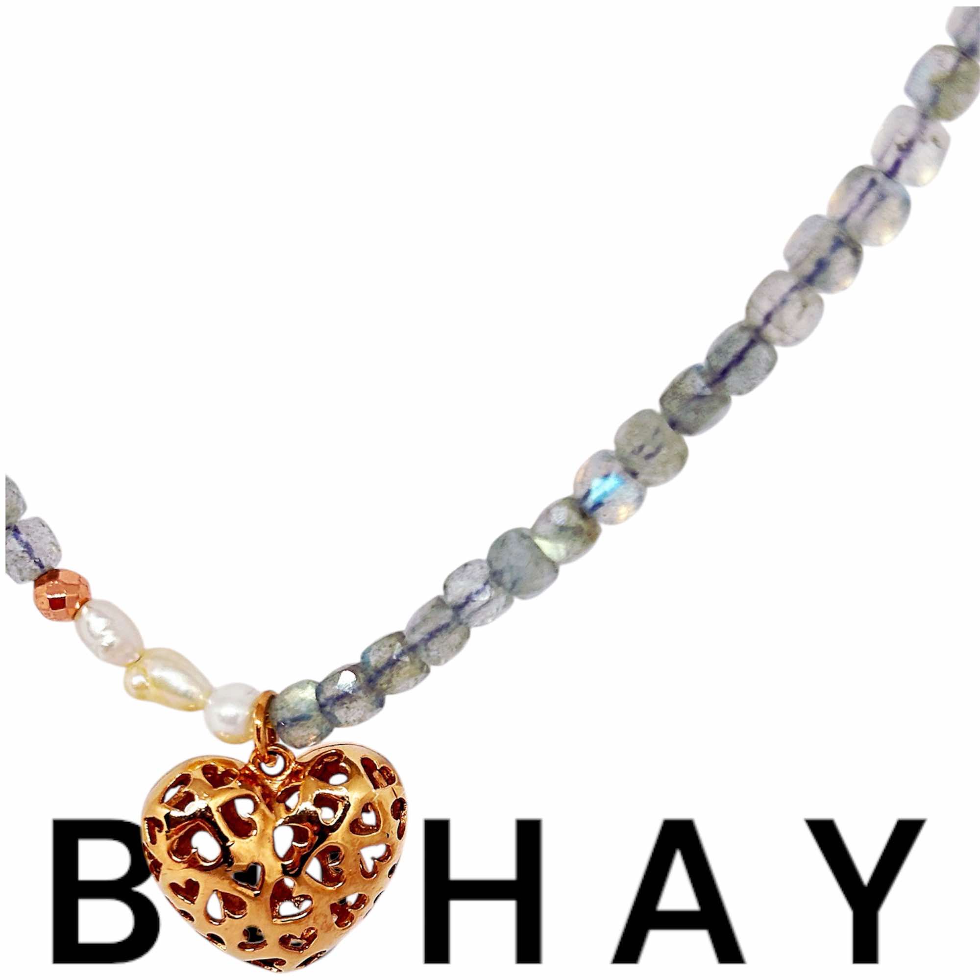 €80.00Χειροποιήτο κολιέ , με ορυκτό λαβραδορίτη σε ημιδιάφανο μώβ ηριδίζον χρώμα.Κυβάκια με διαμαντέ κοπή, περασμένα σε μώβ μεταξοκλωστή. Στη μια πλευρά είναι τριά μαργαριτάρια γλυκού νερού (καλλιέργειας) και ένας αμέθυστος, ρόζ επιχρυσωμένος. Κρέμεται μια ιδιαιτερή καρδιά μπούλ διάτριτη, απο καθαρό ασήμι 925* με ρόζ χρύσωμα και ειναι δεμένο με ασημένιο κούμπωμα και άκρες.