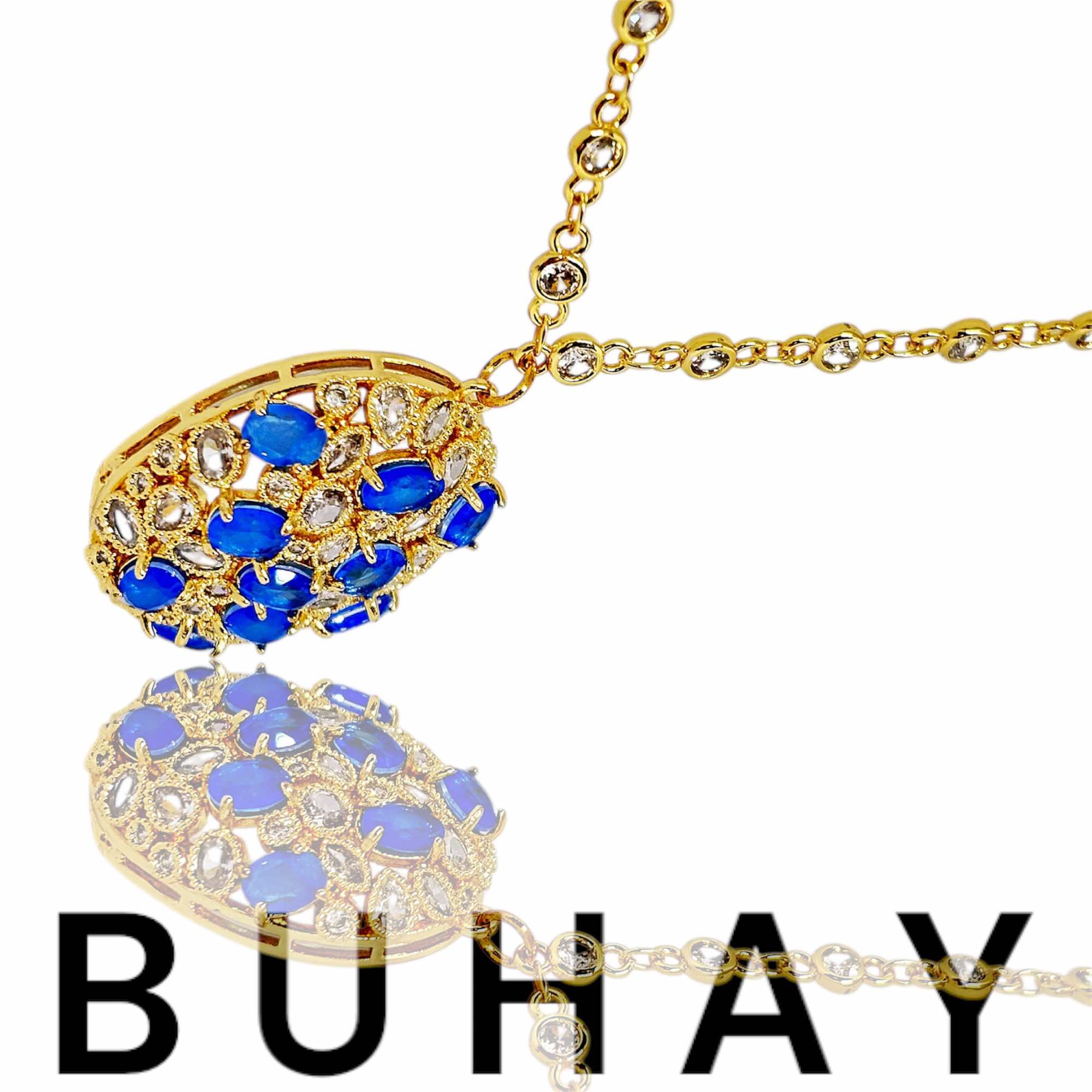 Χειροποιήτο κολιέ απο οικολογικό ορύχαλκο , επιχρυσωμένο. Οβάλ μοτίφ με καρφωμένα μπλέ και γκρί ζιργκόν. Κρεμασμένο σε αλυσίδα τύπου ριβιέρα με ζιργκόν.
