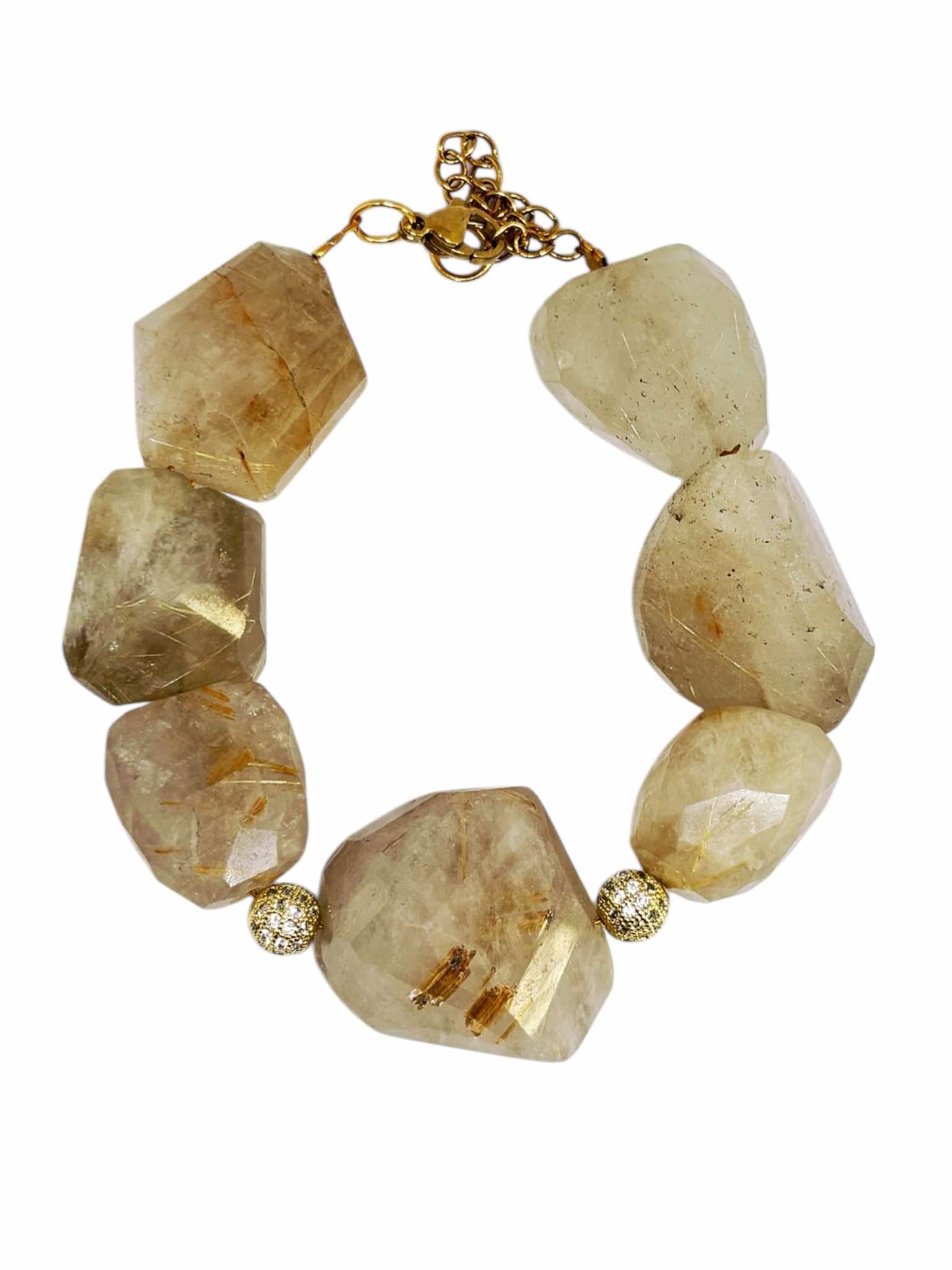 Χειροποιήτο βραχιόλι με ακατέργαστο ορυκτό χαλαζία ρουτίλιο. Δεμένο σε ανοξείδωτο ατσάλι με δυο χρυσές μπίλιες με ζιργκόν απο οικολογικό ορύχαλκο.