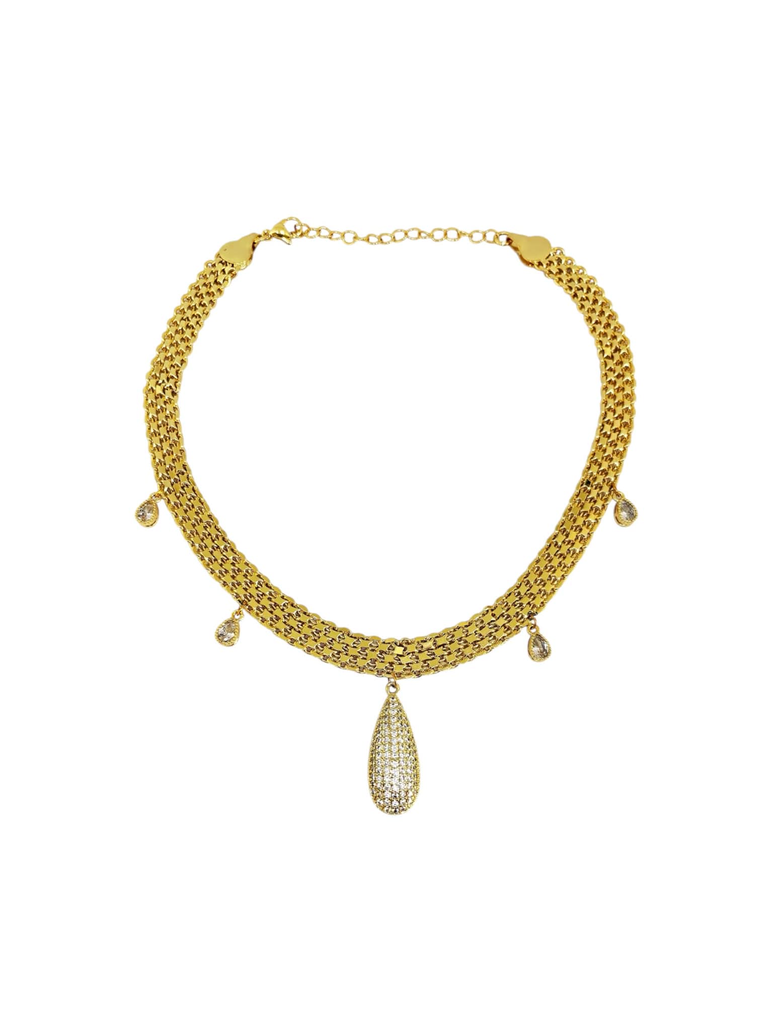 Χειροποιήτο κολιέ απο οικολογικό ορύχαλκο , επιχρυσωμένο. Τσόκερ με μεγάλο μοτίφ σχήμα δάκρυ, με ζιργκόν στο κέντρο και μικρά μοτίφ σε σχήμα δάκρυ με ζιργκόν.