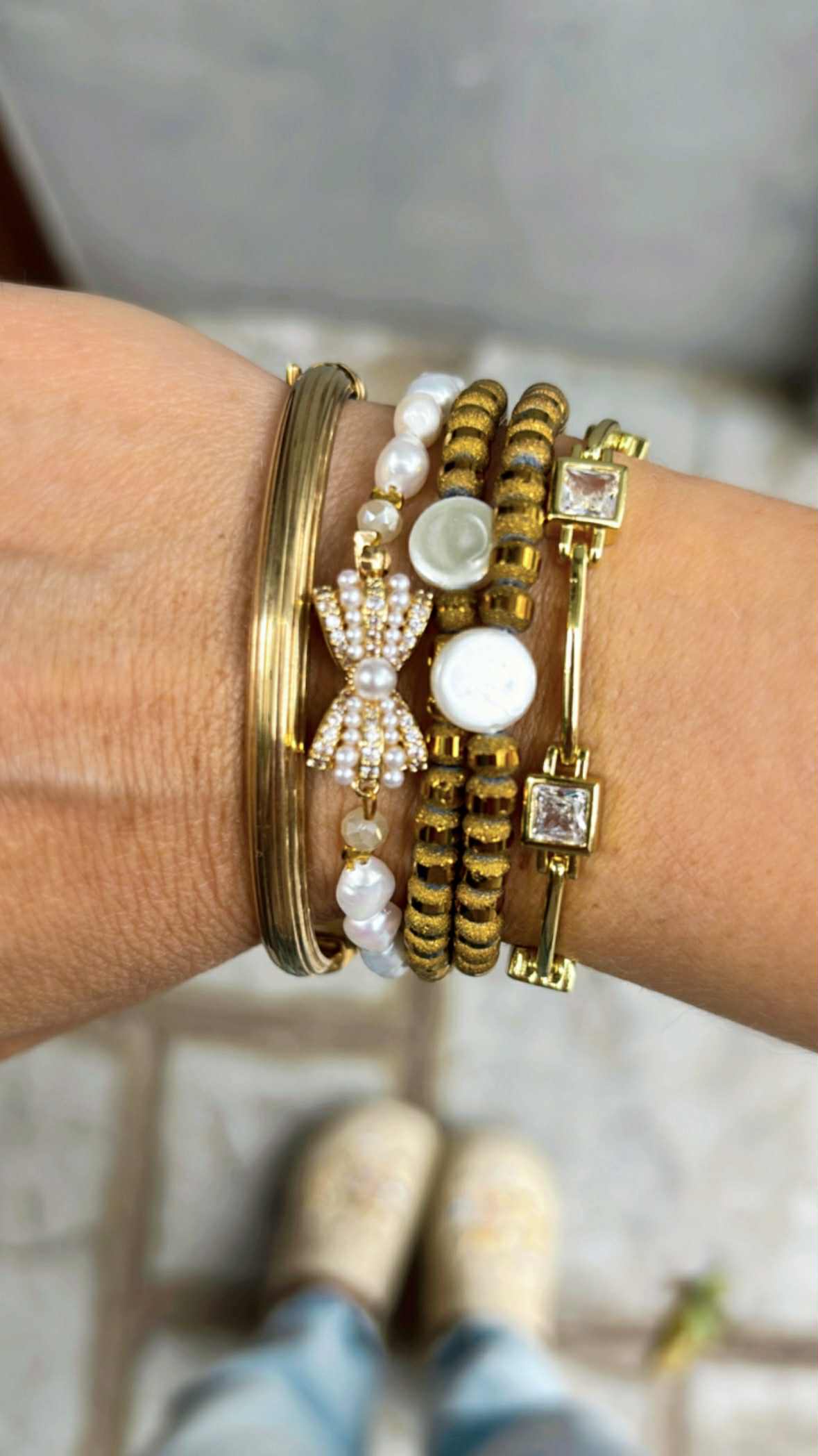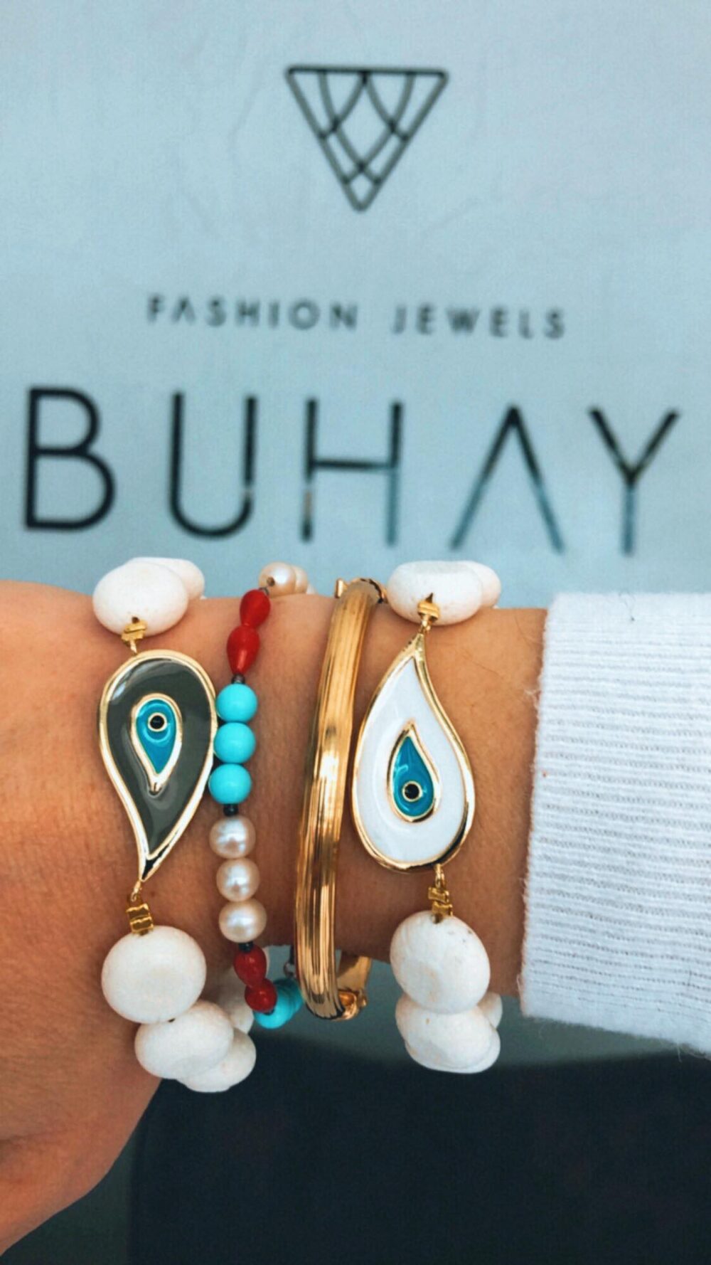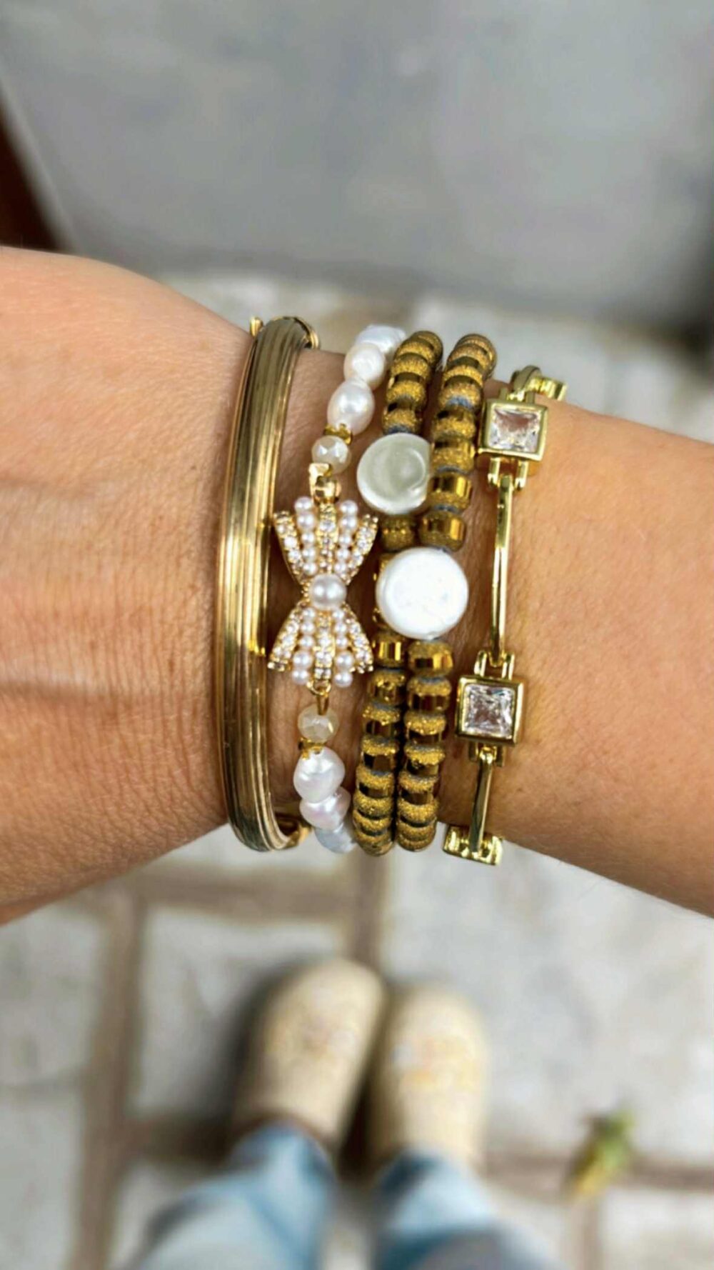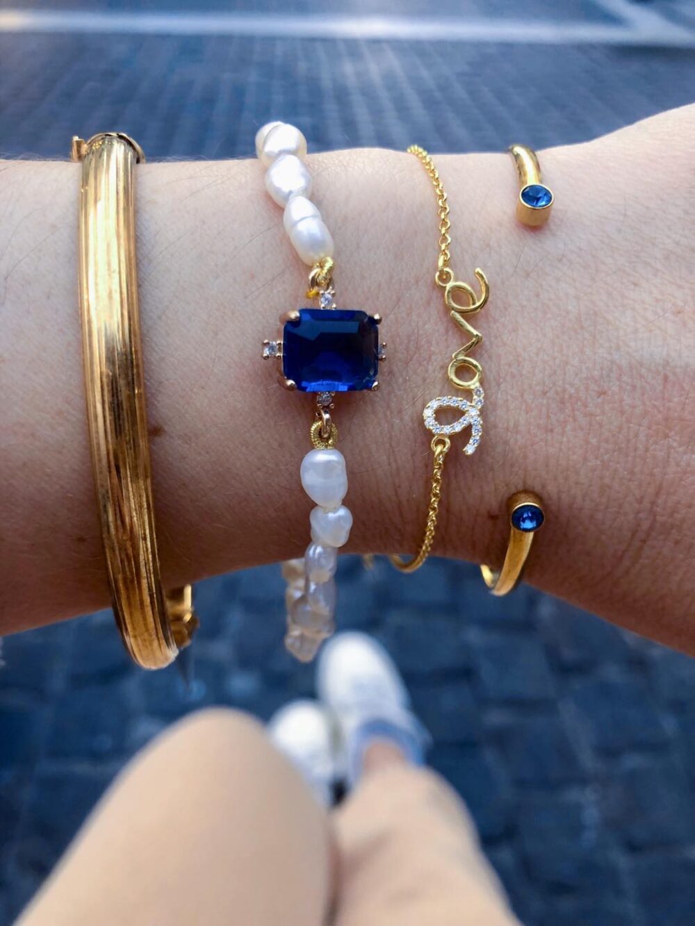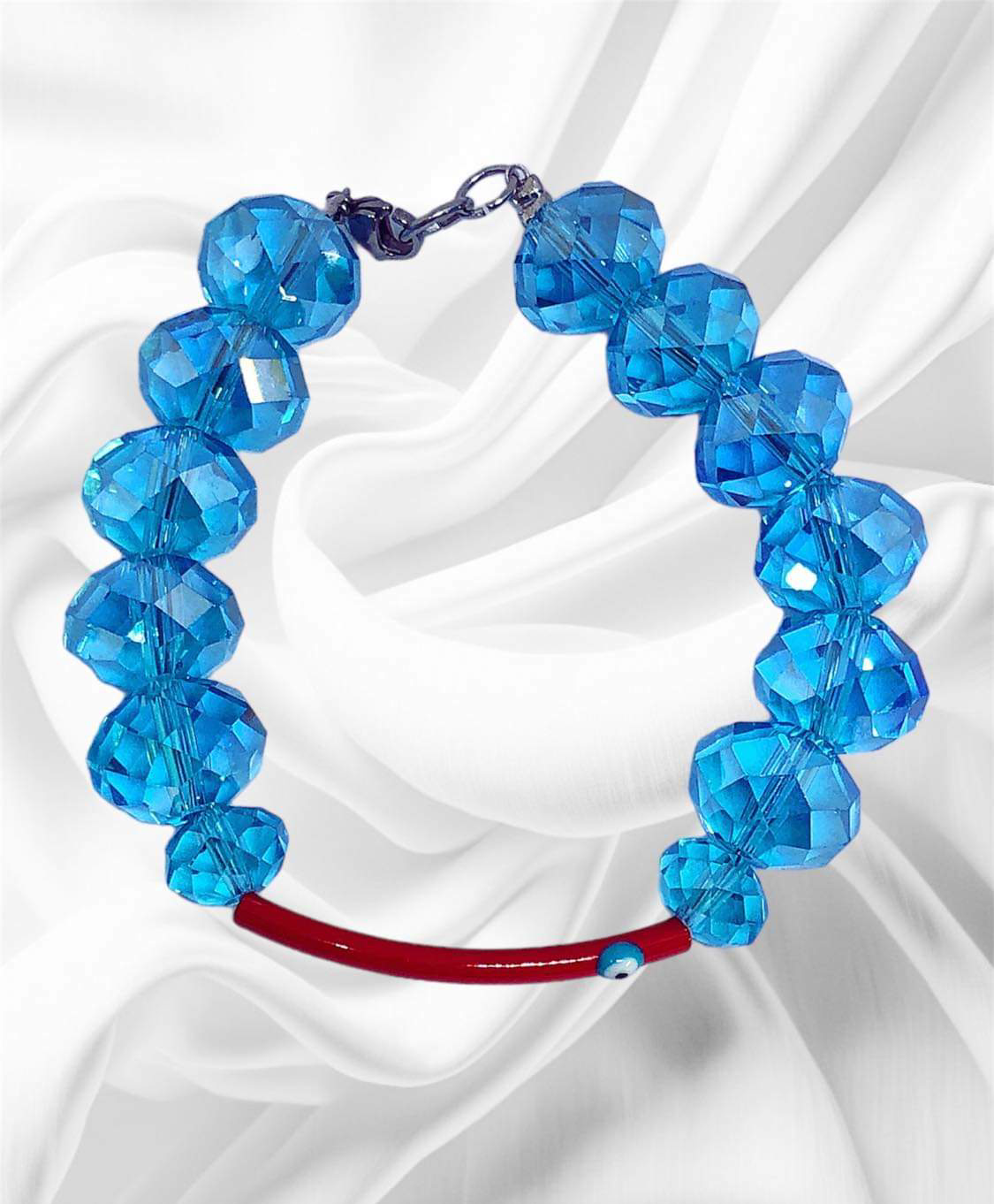 Χειροποιήτο βραχιόλι με κρυσταλλάκια σε αποχρώσεις του μπλέ ,με πλακέ ζωγραφισμένη πέρλα στο κέντρο . Ειναι δεμένο σε ατσάλι.