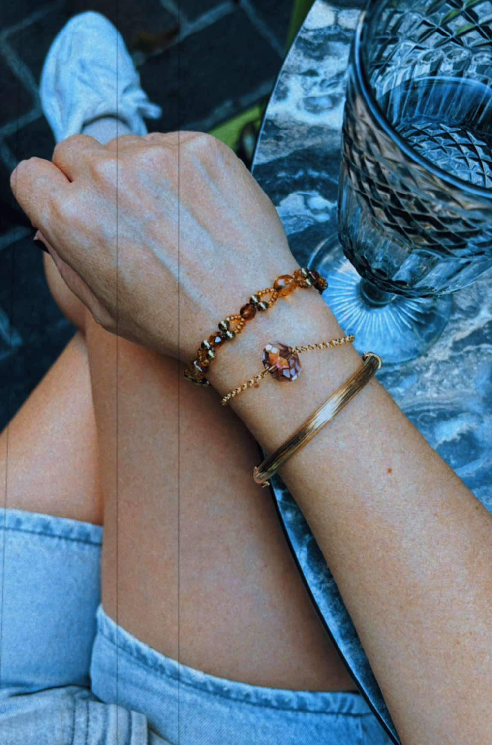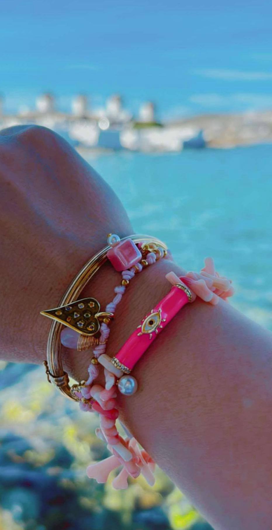Χειροποιήτο βραχιόλι δεμένο με ατσαλόσυρμα και σομόν πέτρες.