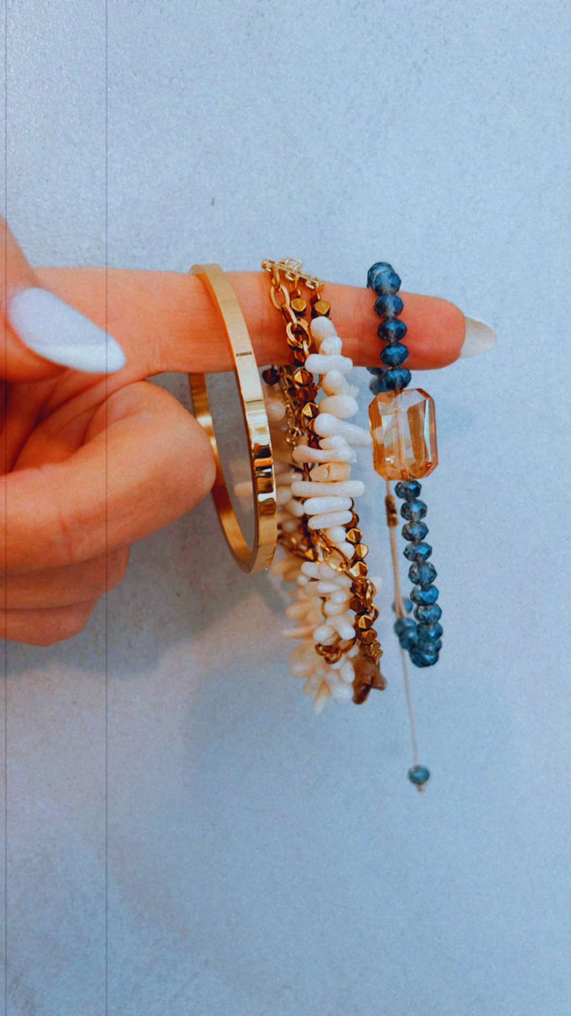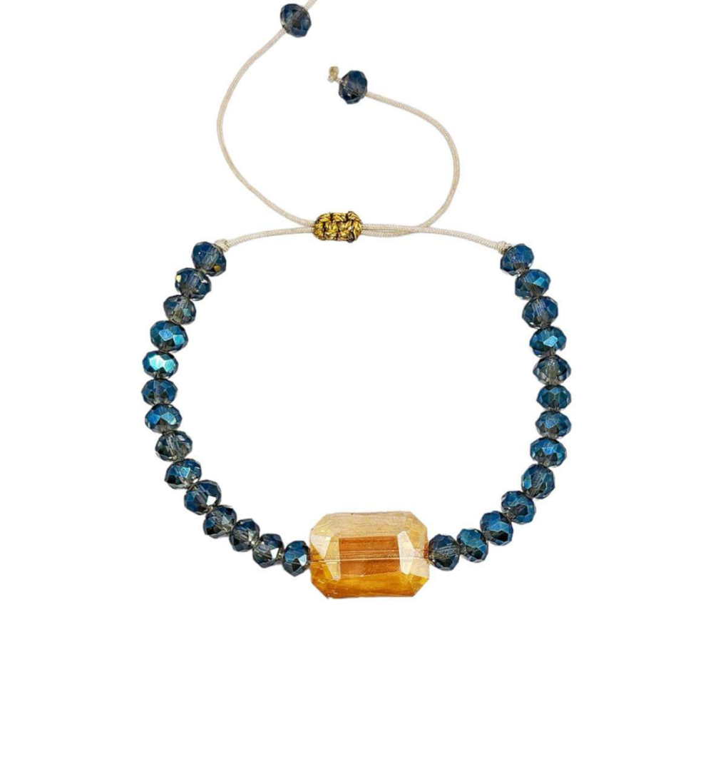Χειροποιήτο βραχιόλι , με μπλέ ιριδίζον κρυσταλλάκια και ενα ορθογώνιο χρυσό κρύσταλλο στο κέντρο. Δέσιμο μακραμέ.