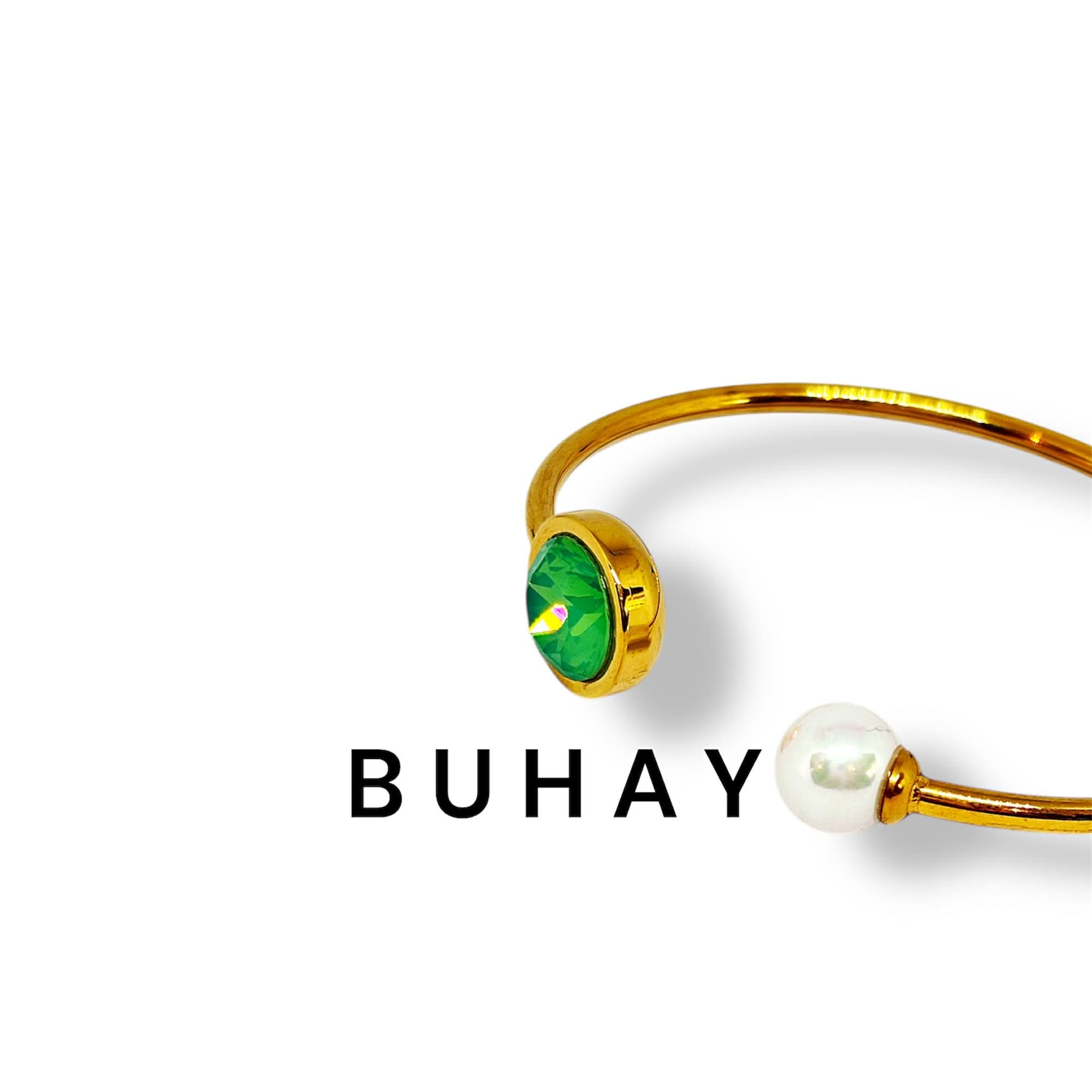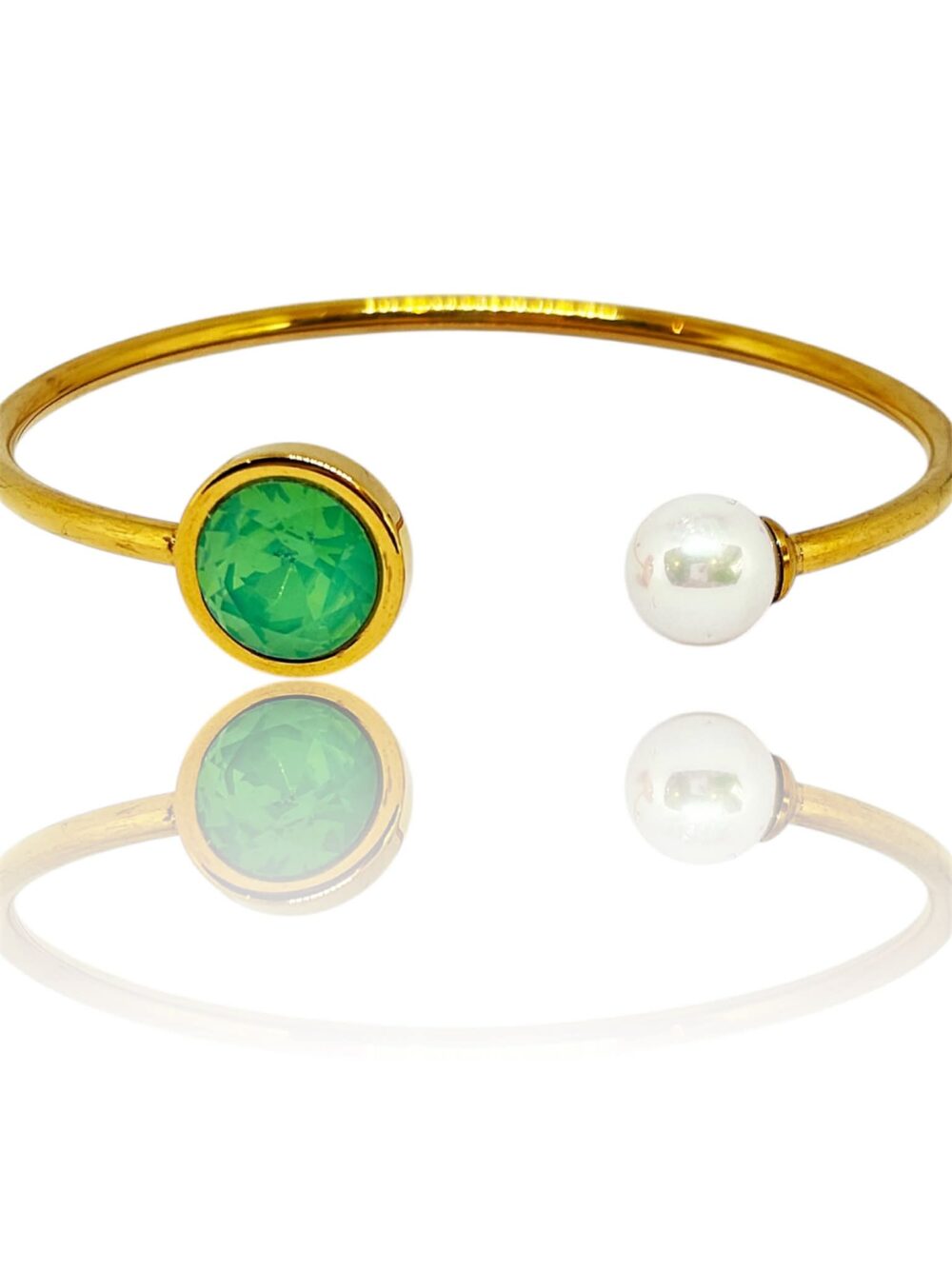 Βραχιόλι απο ανοξείδωτο ατσάλι , επιχρυσωμένο. Ανοιχτή χειροπέδα που έχει στις άκρες της μια πέρλα και ένα ζιργκόν σε χρώμα πράσινο της μέντας.
