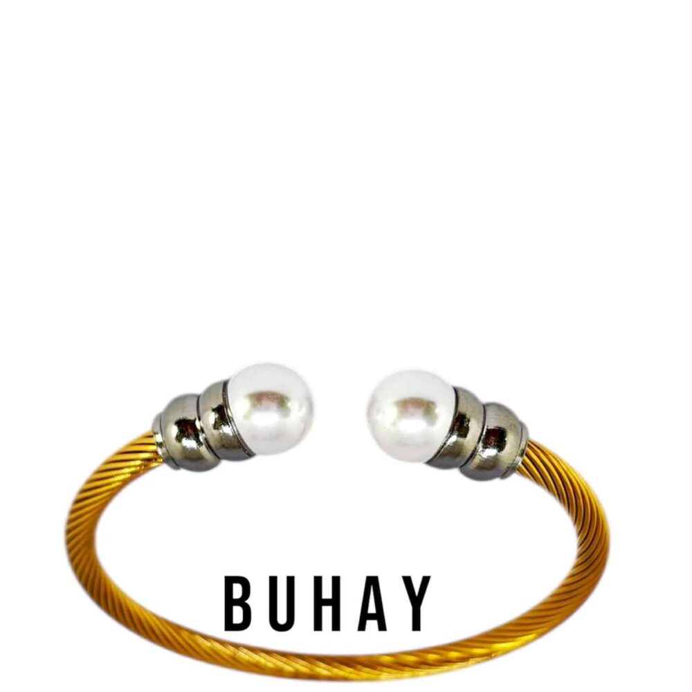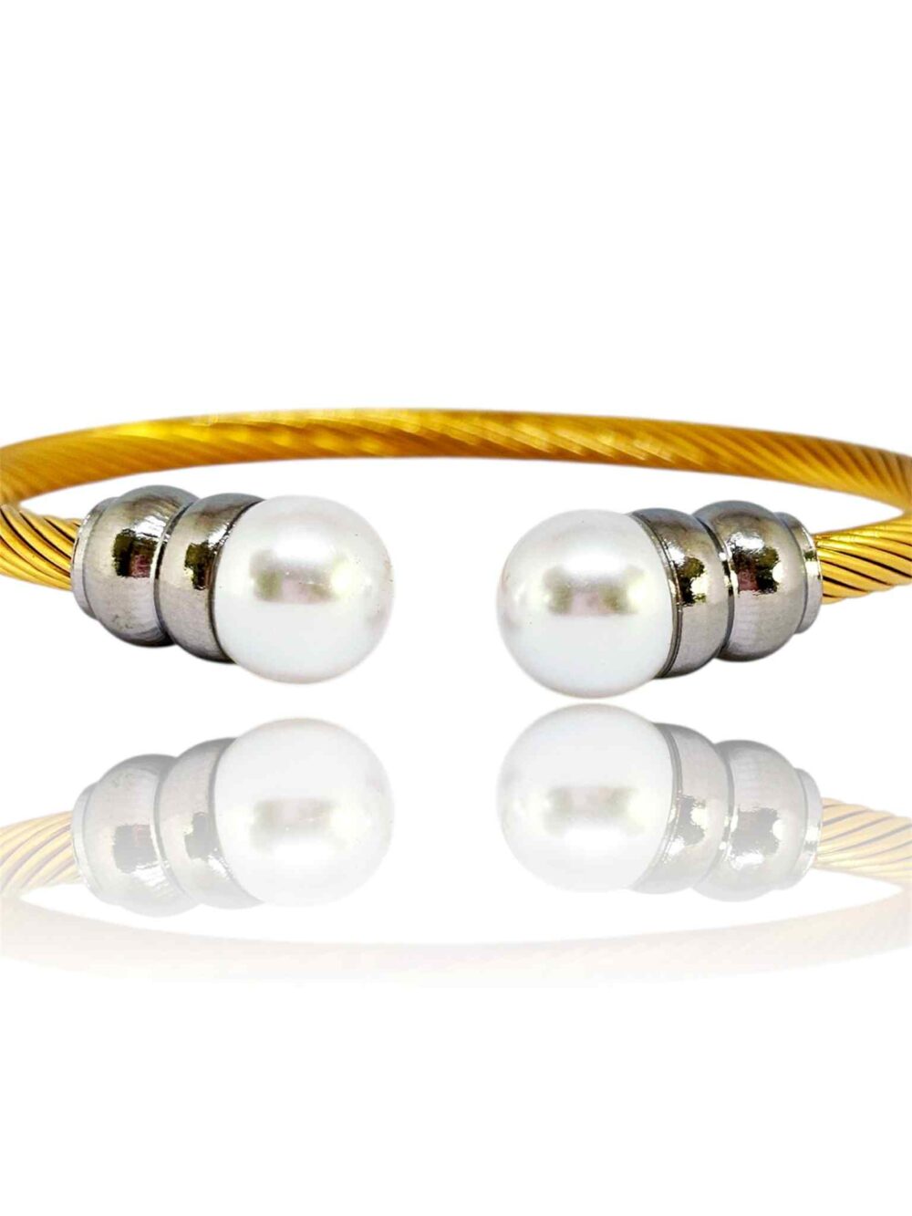 Βραχιόλι απο ανοξείδωτο ατσάλι , επιχρυσωμένο . Στριφτή ανοιχτή χειροπέδα με πέρλες.