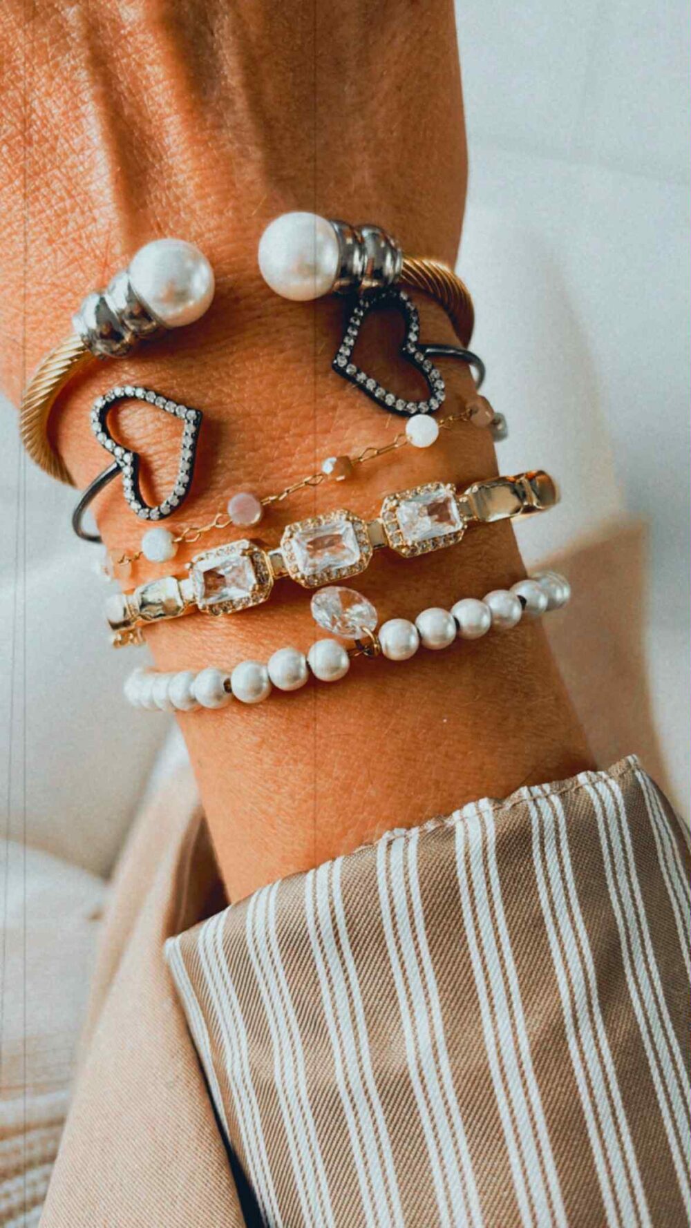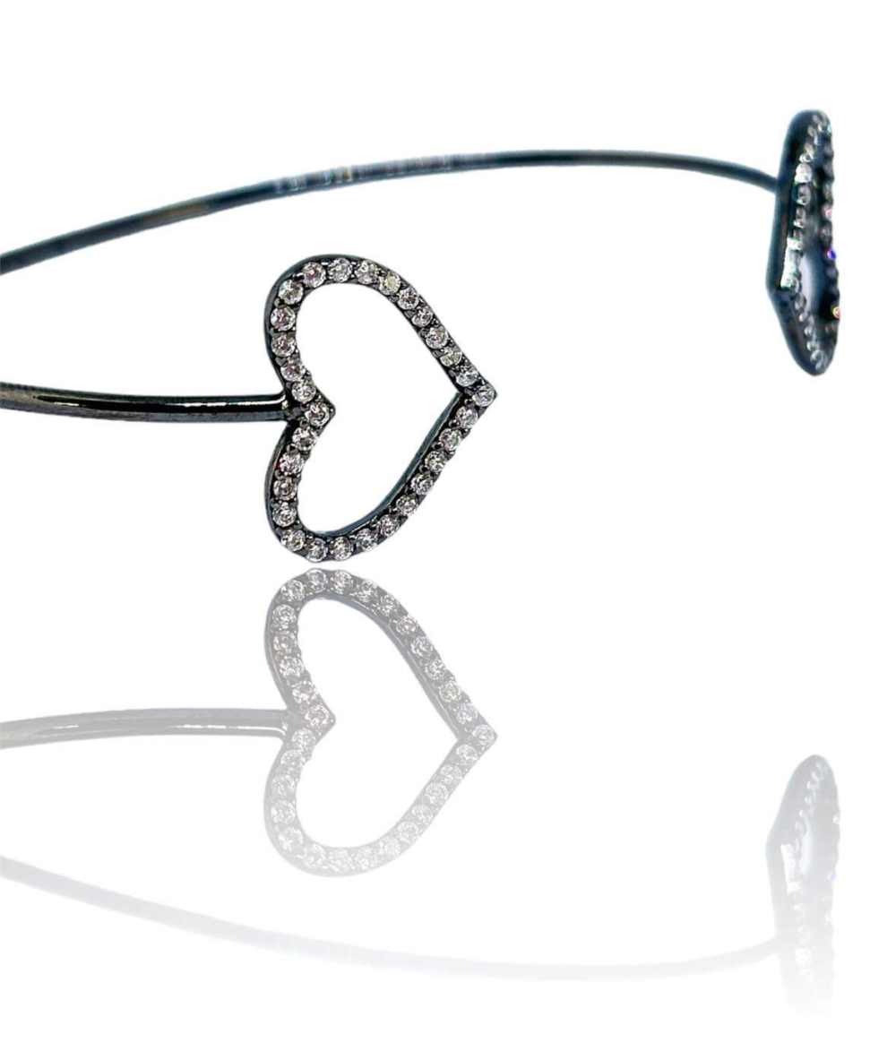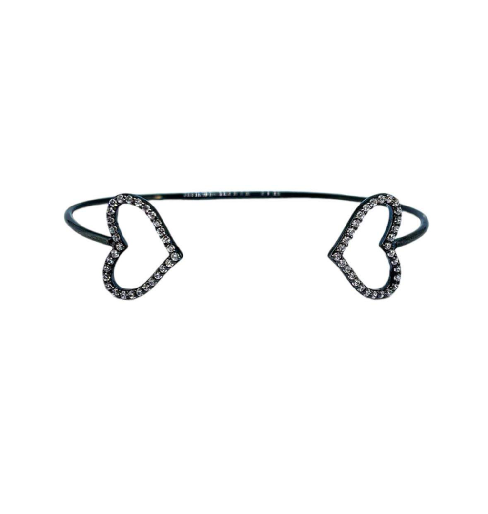 Βραχιόλι απο καθαρό ασήμι 925* με μάυρο πλατίνωμα. Ανοιχτή χειροπέδα που αγκαλιάζει με καρδιές. Οι καρδιές ειναι με ζιργκόν.