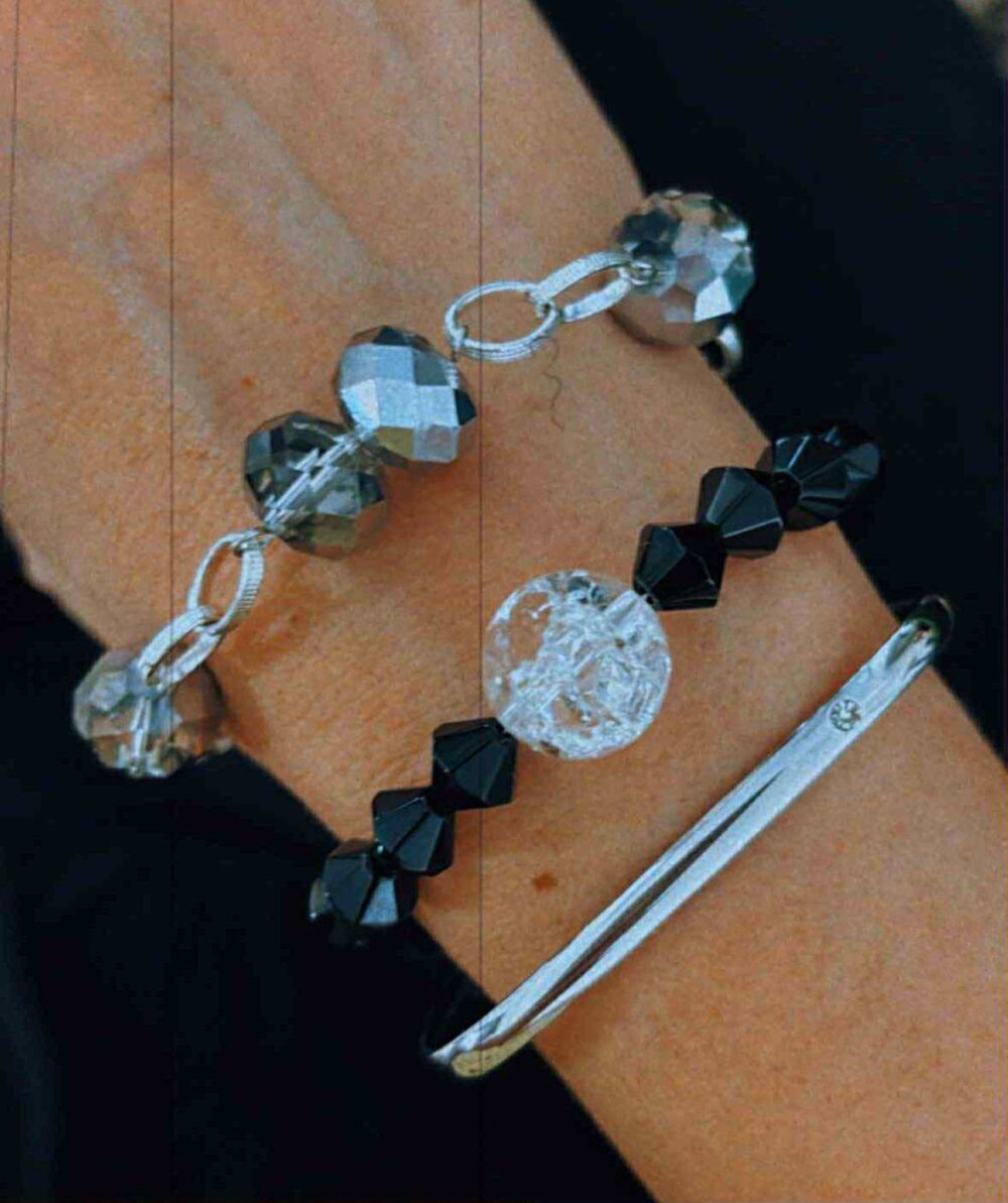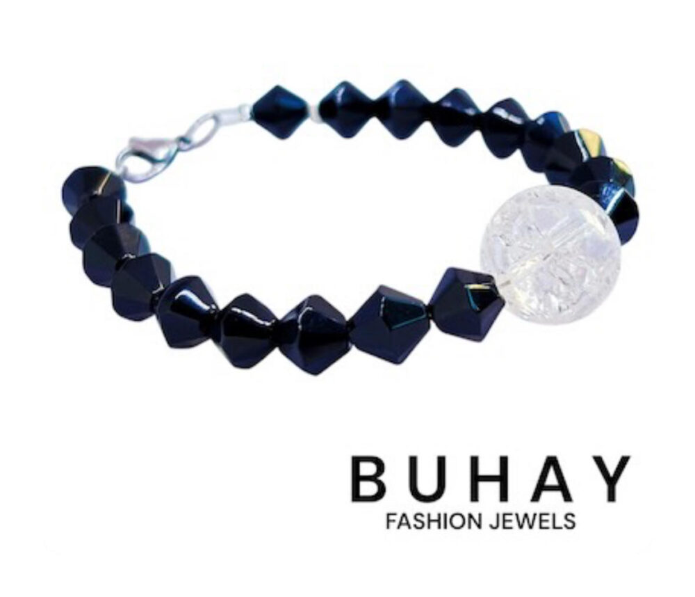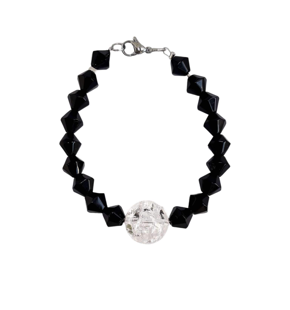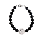 Χειροποιήτο βραχιόλι με μάυρες χάντρες και διάφανο κρακελέ κρύσταλλο στο κέντρο. Δέμενο σε ατσάλι .