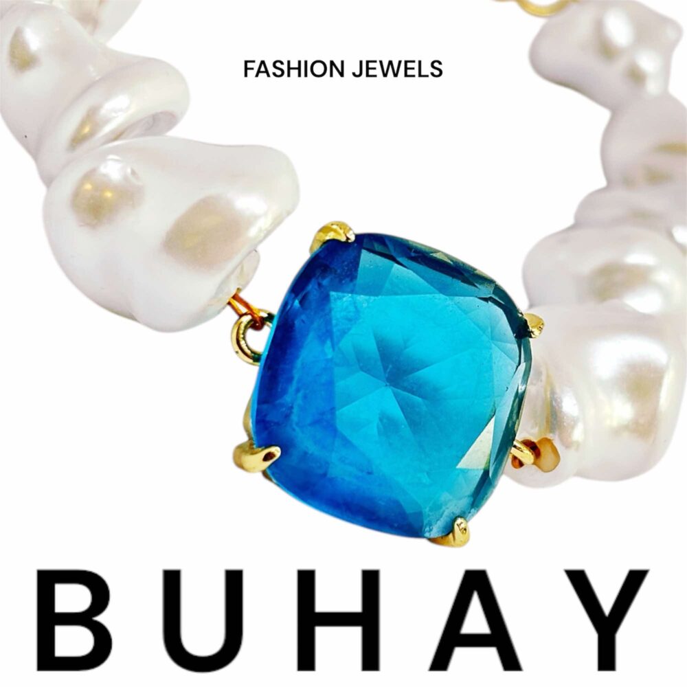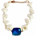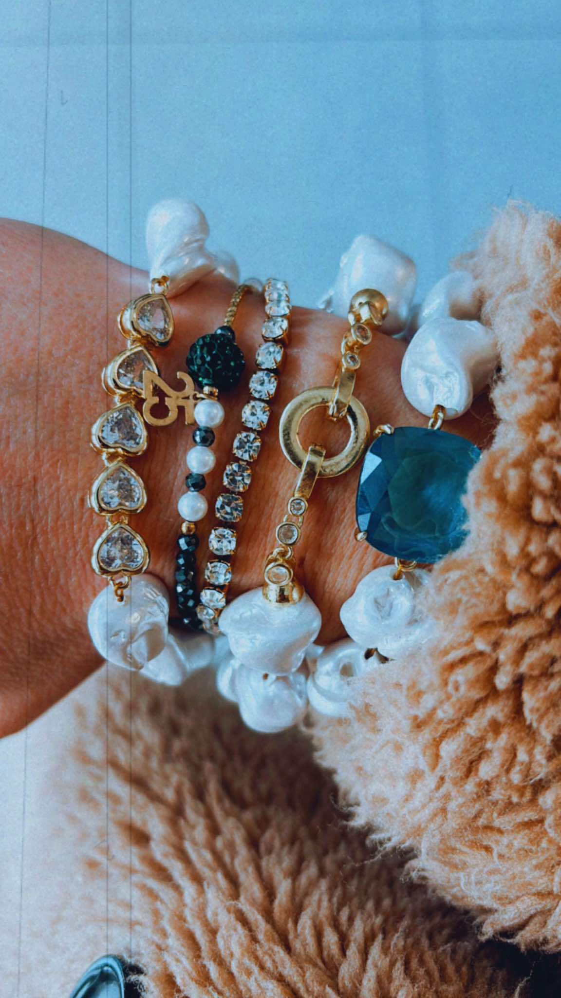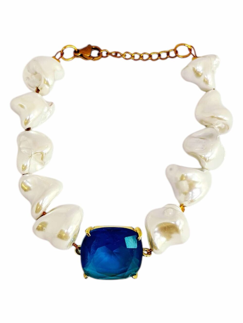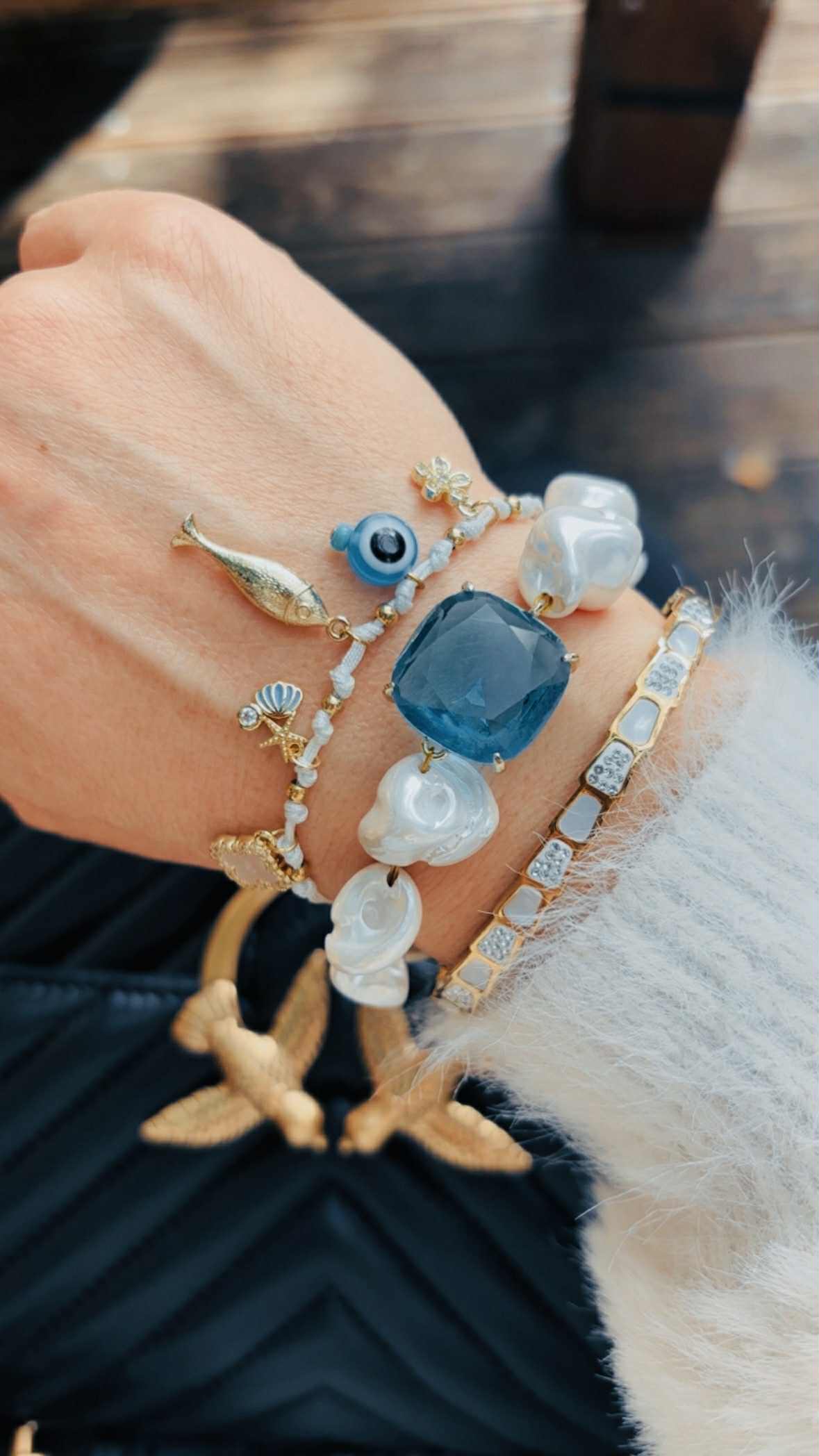 Χειροποιήτο βραχιόλι , με πέρλες δεμένο σε ατσάλι . Στο κέντρο έχει μοτίφ με τετράγωνο μπλέ ζιργκόν , απο οικολογικό ορύχαλκο επιχρυσωμένο.