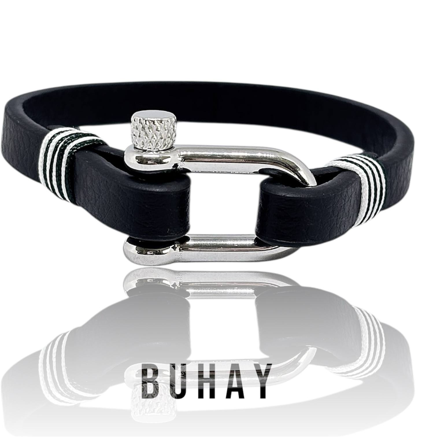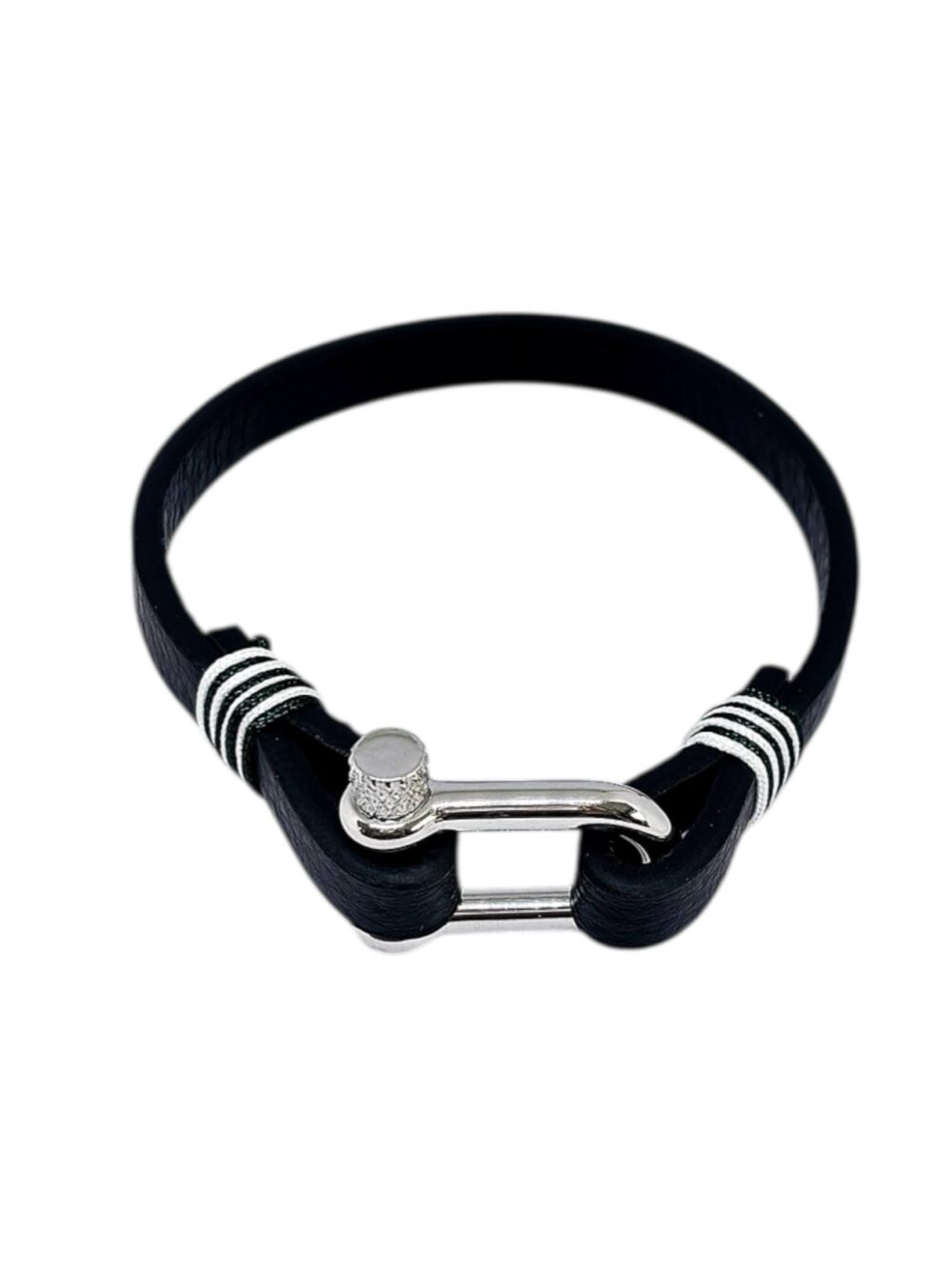 Βραχιόλι αντρικό με μάυρο δερμάτινο πλακέ λουράκι και εντυπωσιακό βιδωτό , κούμπωμα ασφαλείας. κούμπωμα ασφαλείας.