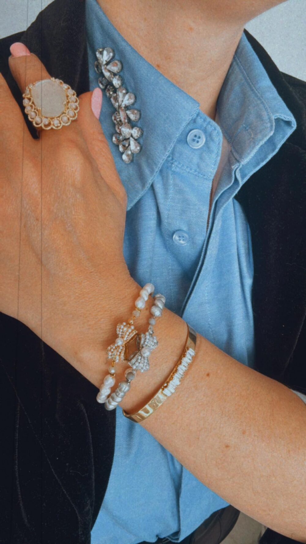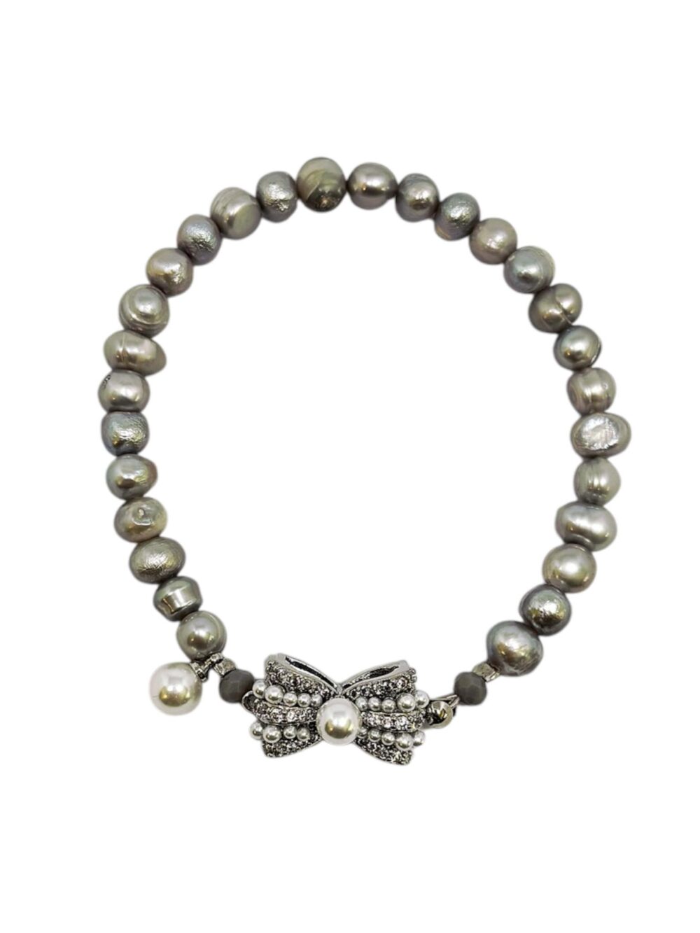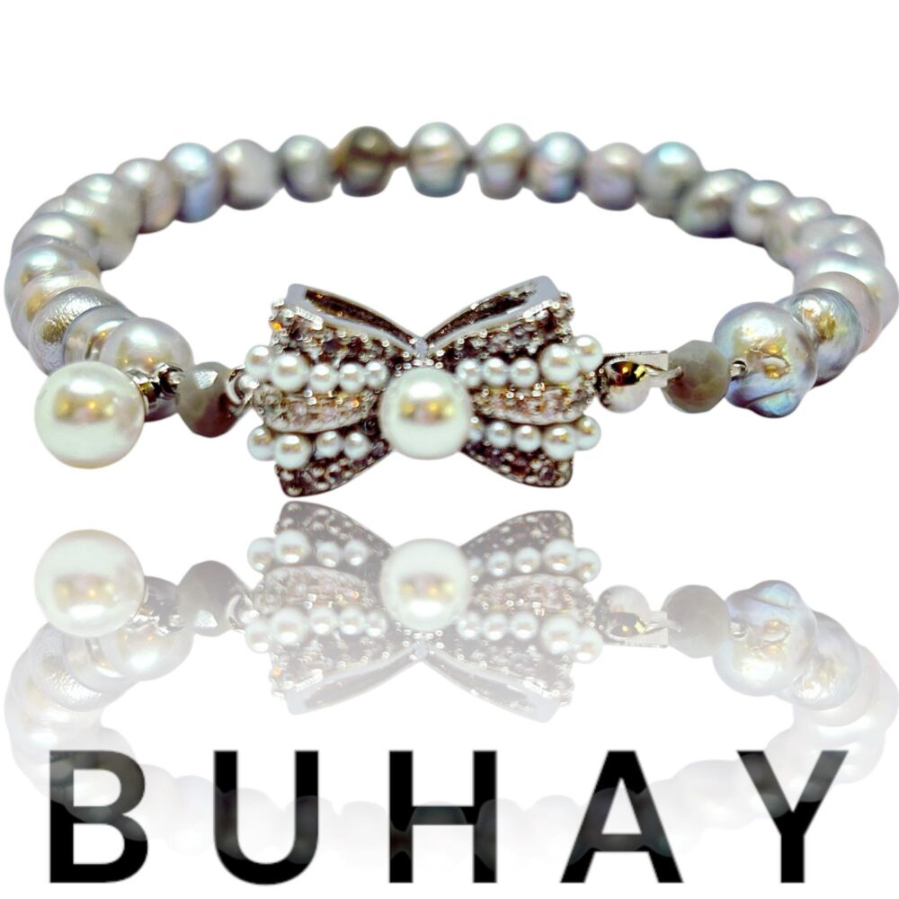 Χειροποιήτο βραχιόλι , με γκρί μαργαριτάρι γλυκού νερού δεμένο σε ατσάλι , με ιδιαίτερο κούμπωμα φιόγκο με περλίτσες και ζιργκόν , απο οικολογικό όρυχαλκο .