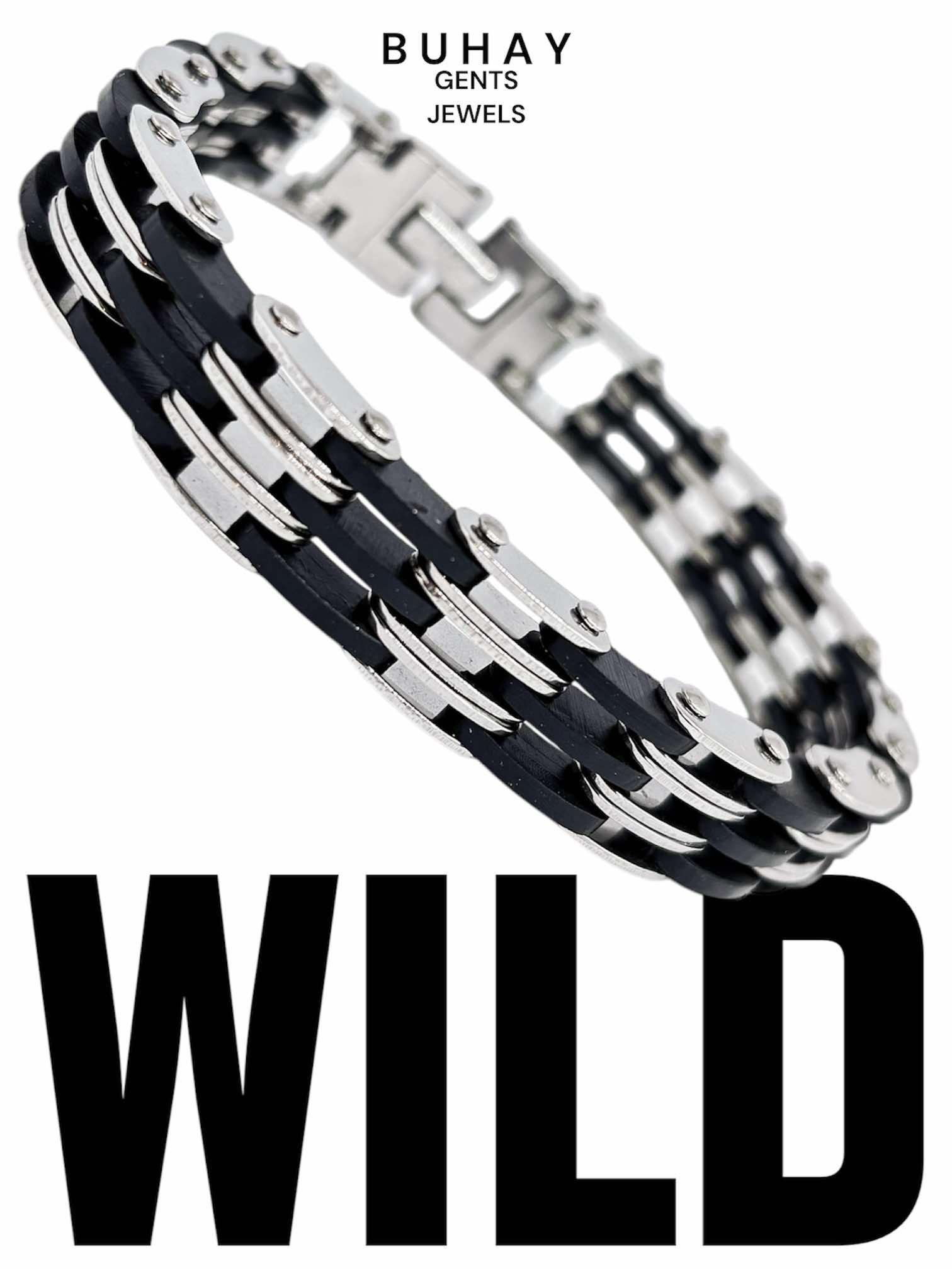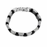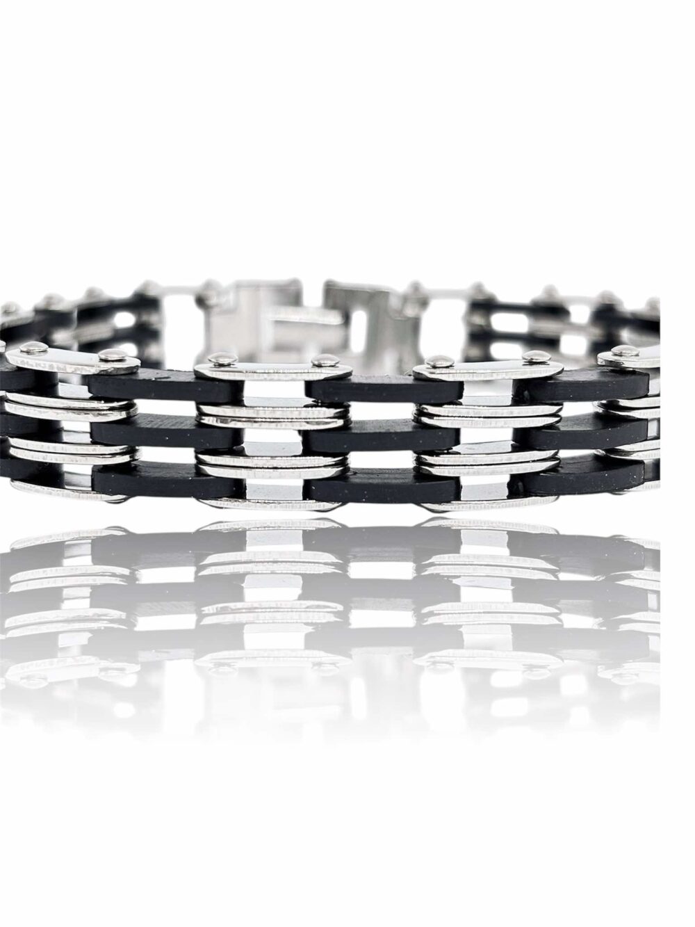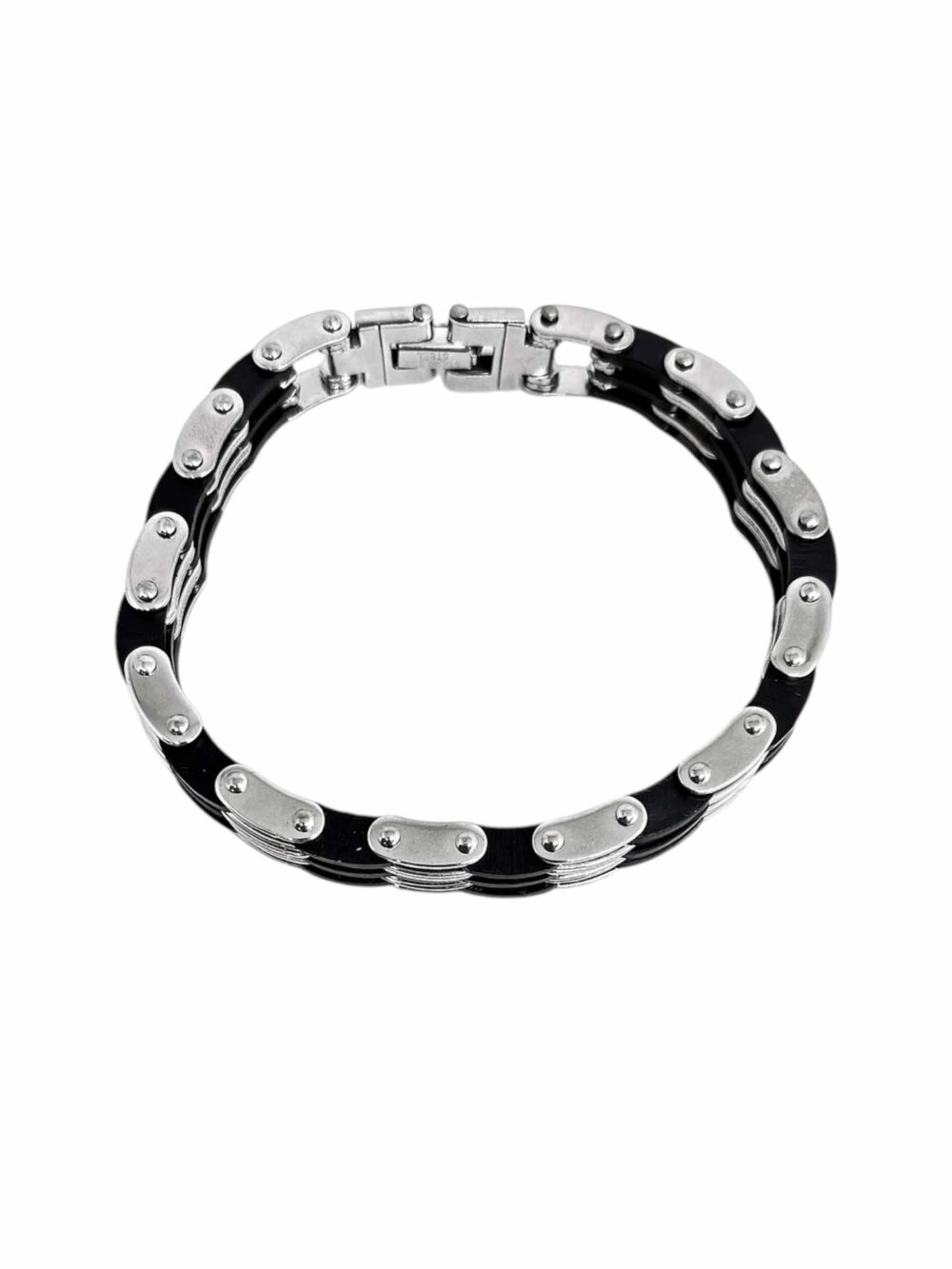 Αντρικό βραχιόλι απο ανοξείδωτο ατσάλι με μάυρο καουτσούκ. Σχέδιο τύπου αλυσίδα ποδηλάτου.