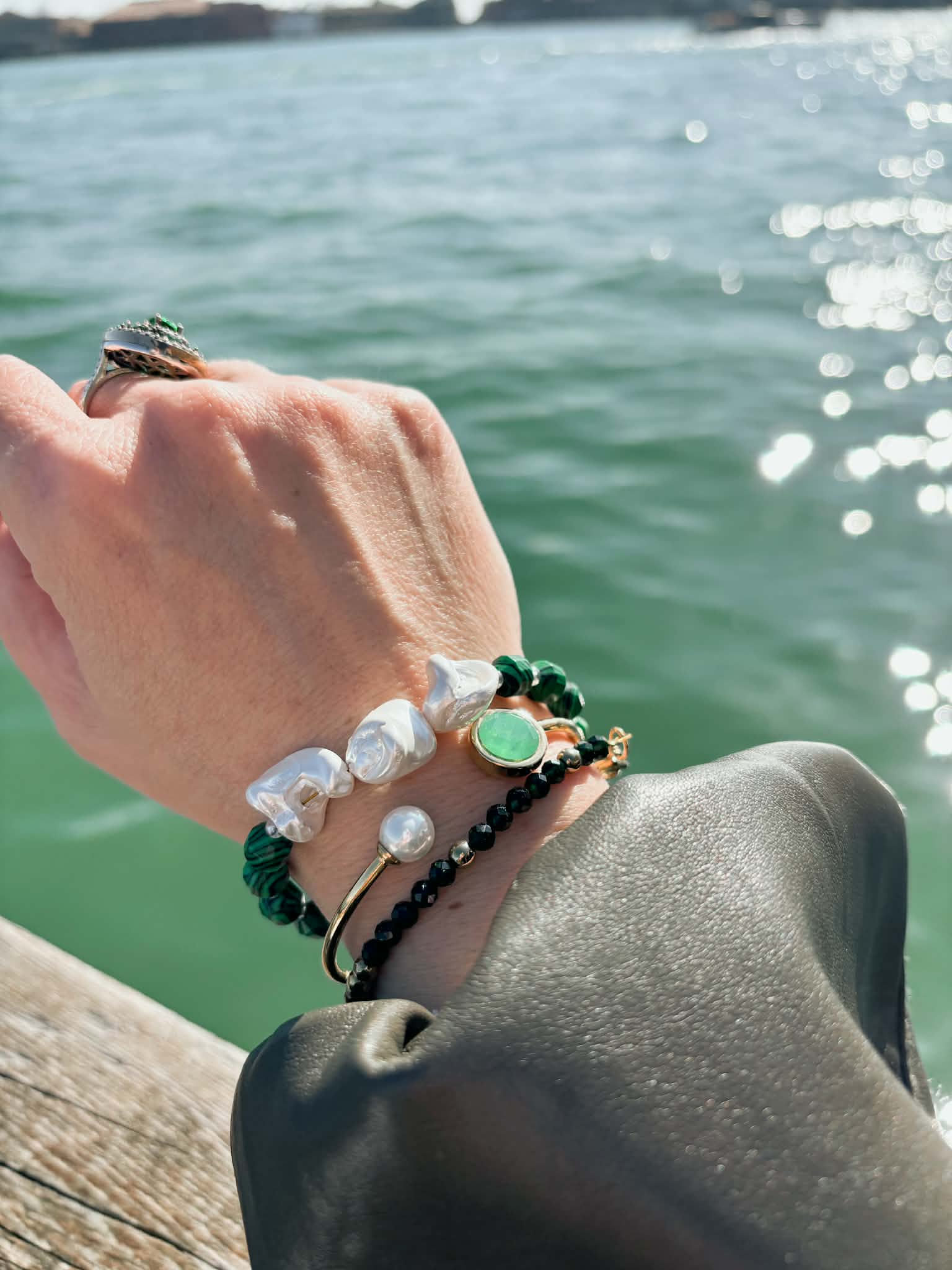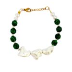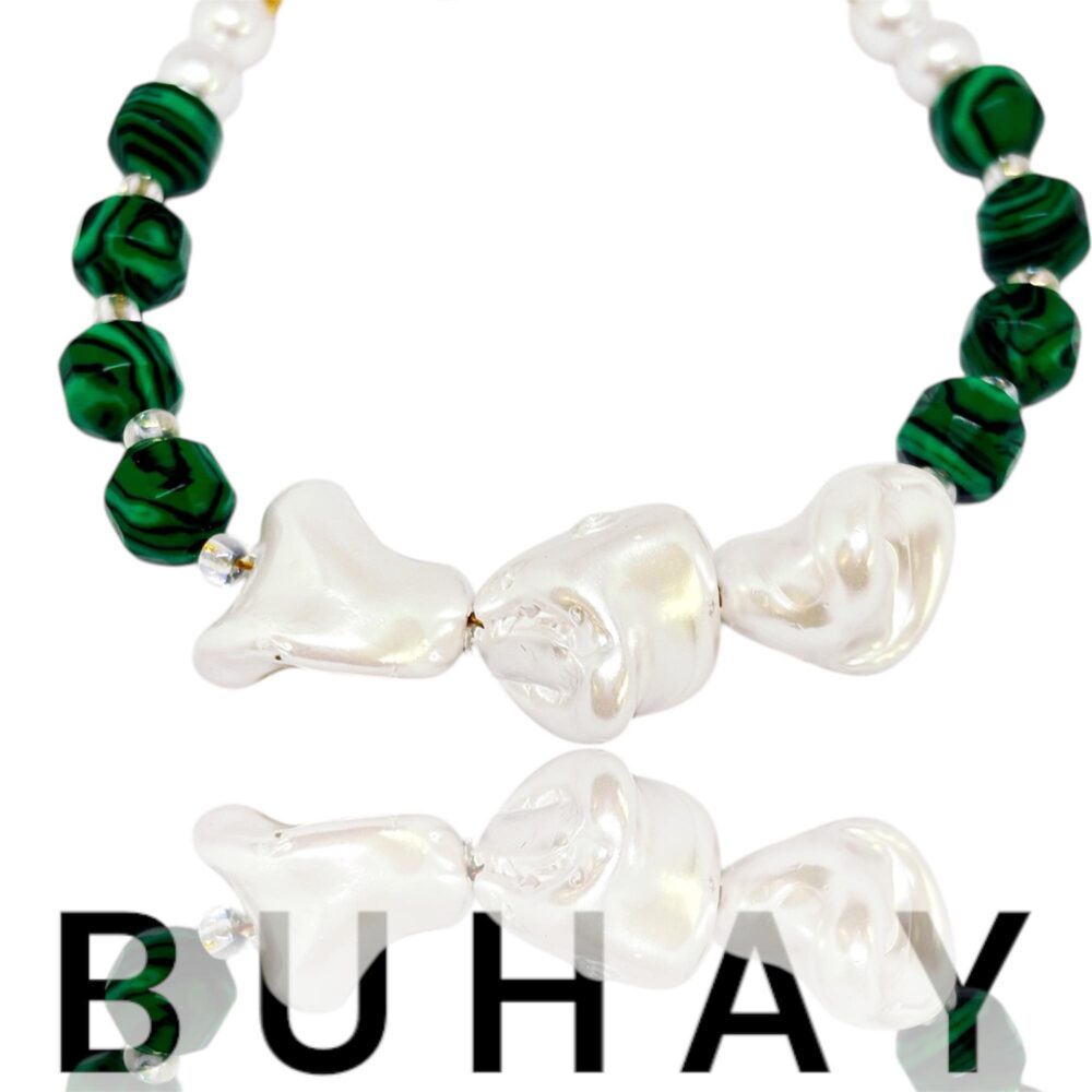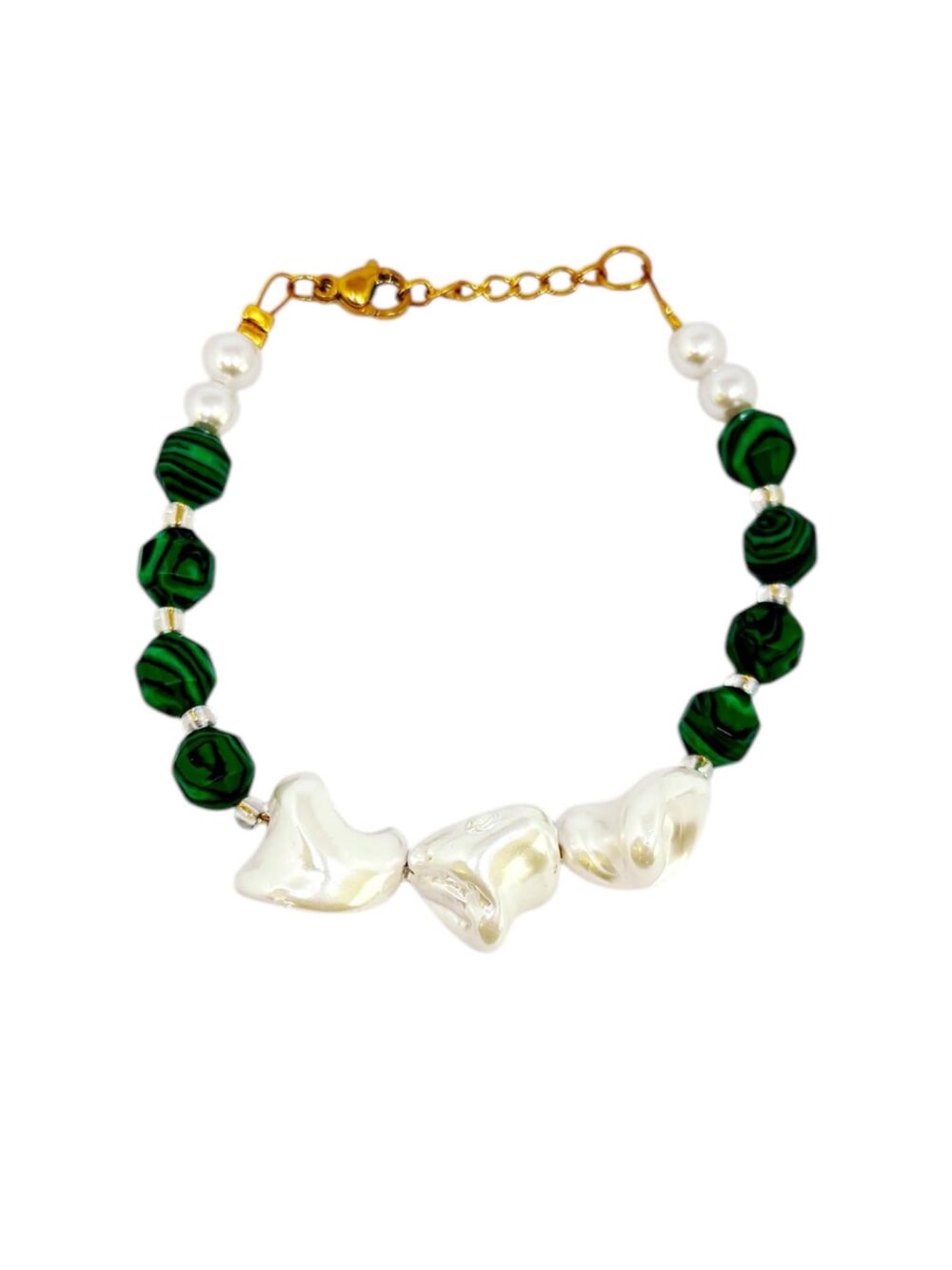 Χειροποιήτο βραχιόλι με ορυκτό μαλαχίτη και πέρλες. Δεμένο σε ατσάλι.