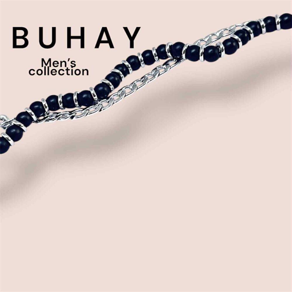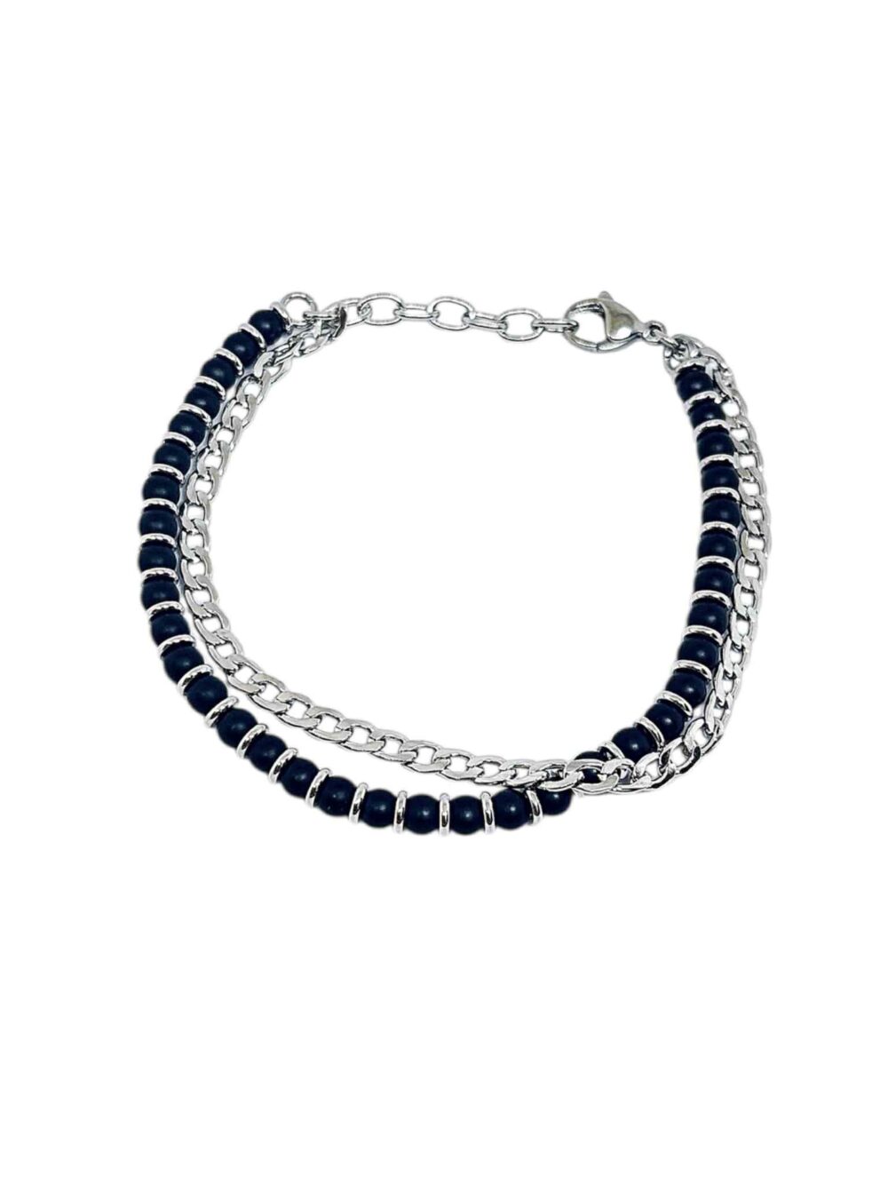 Βραχιόλι απο ανοξείδωτο ατσάλι.Διπλό , με μια σειρά πέτρες μάυρης λάβας , περασμένες σε αλυσίδα και μια καδένα κλασική.