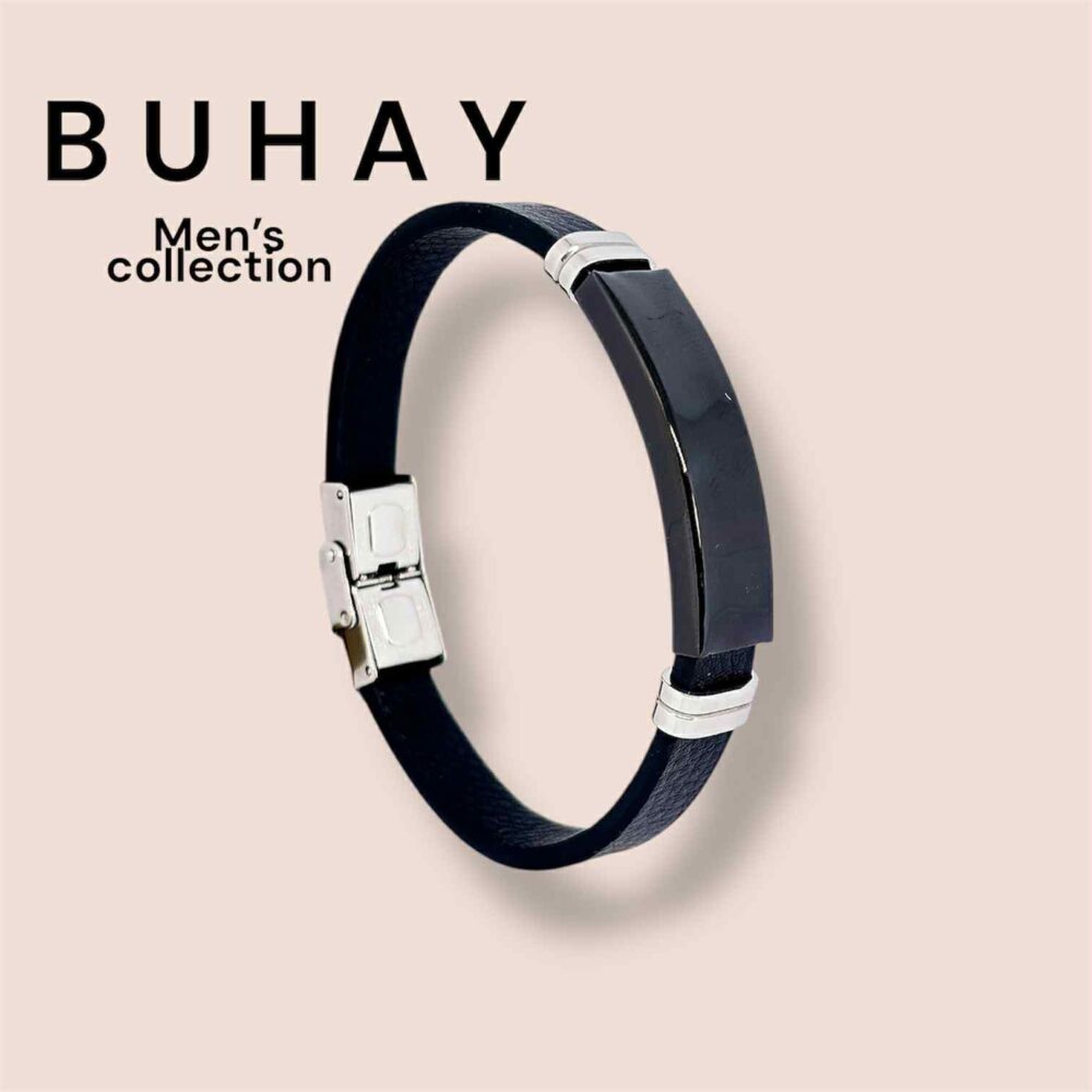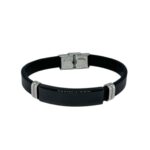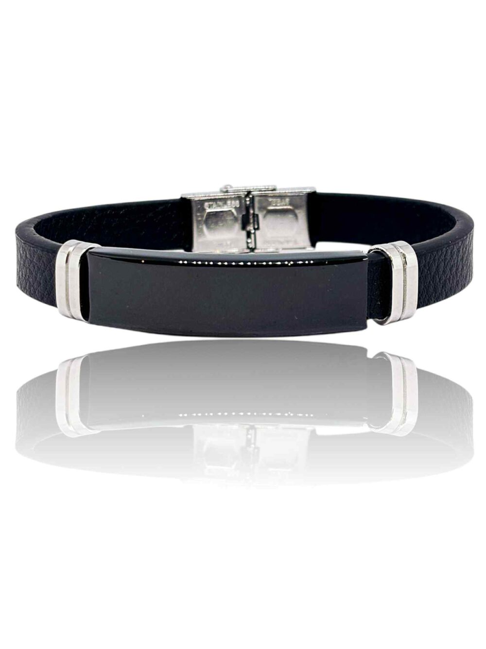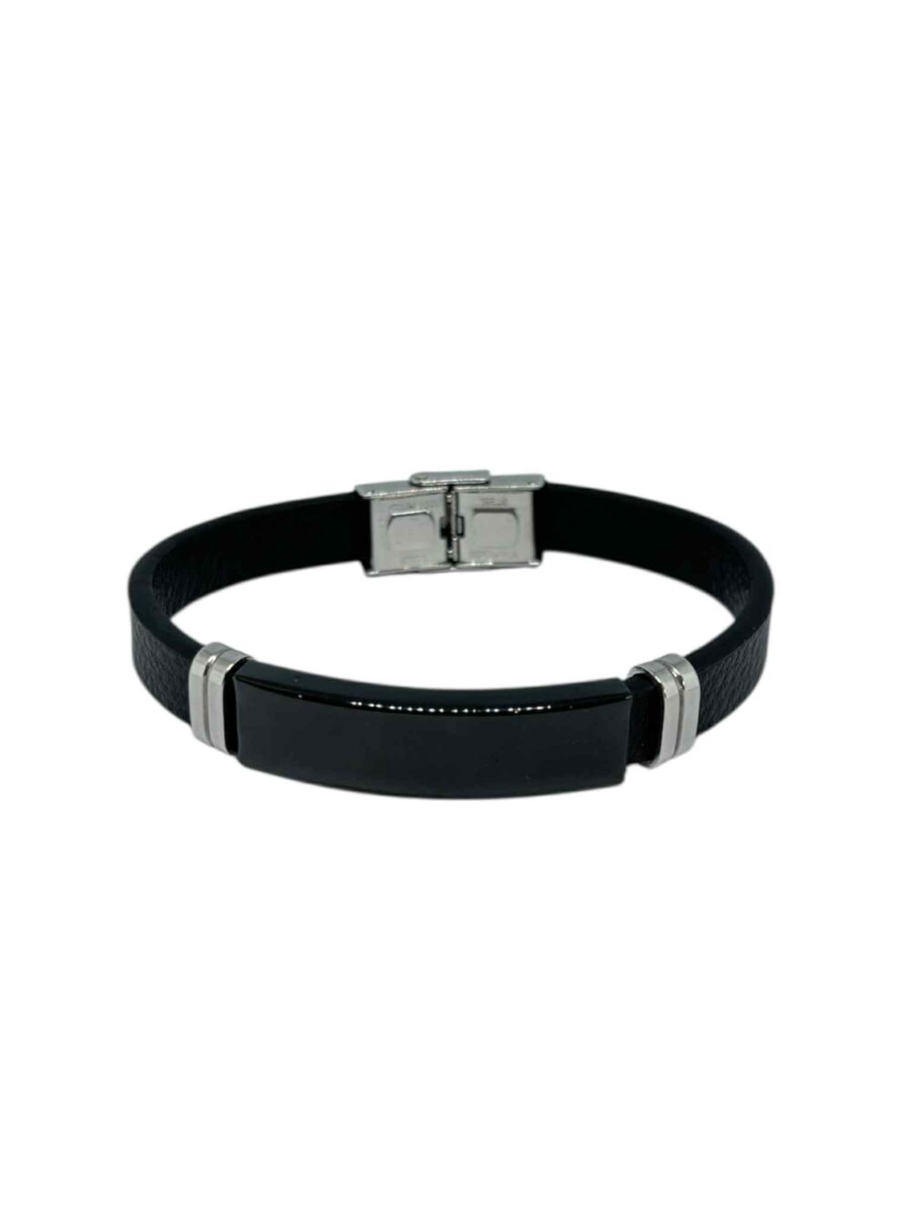 Αντρικό βραχιόλι με κούμπωμα ασφαλείας . Τύπου ταυτότητα με μάυρο φινίρισμα κα μάυρο φαρδύ οικολογικό δέρμα.