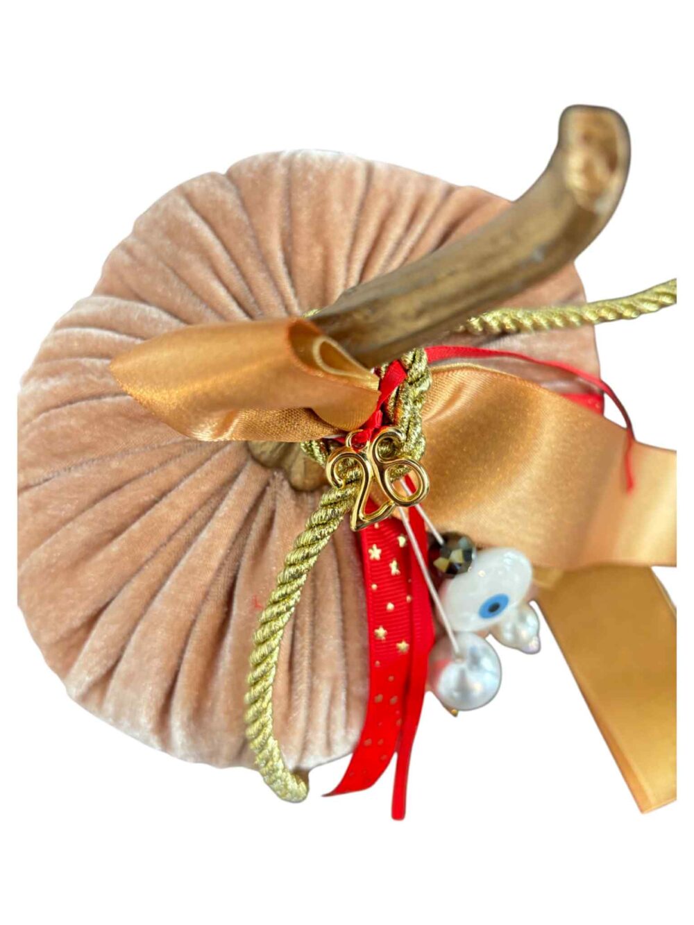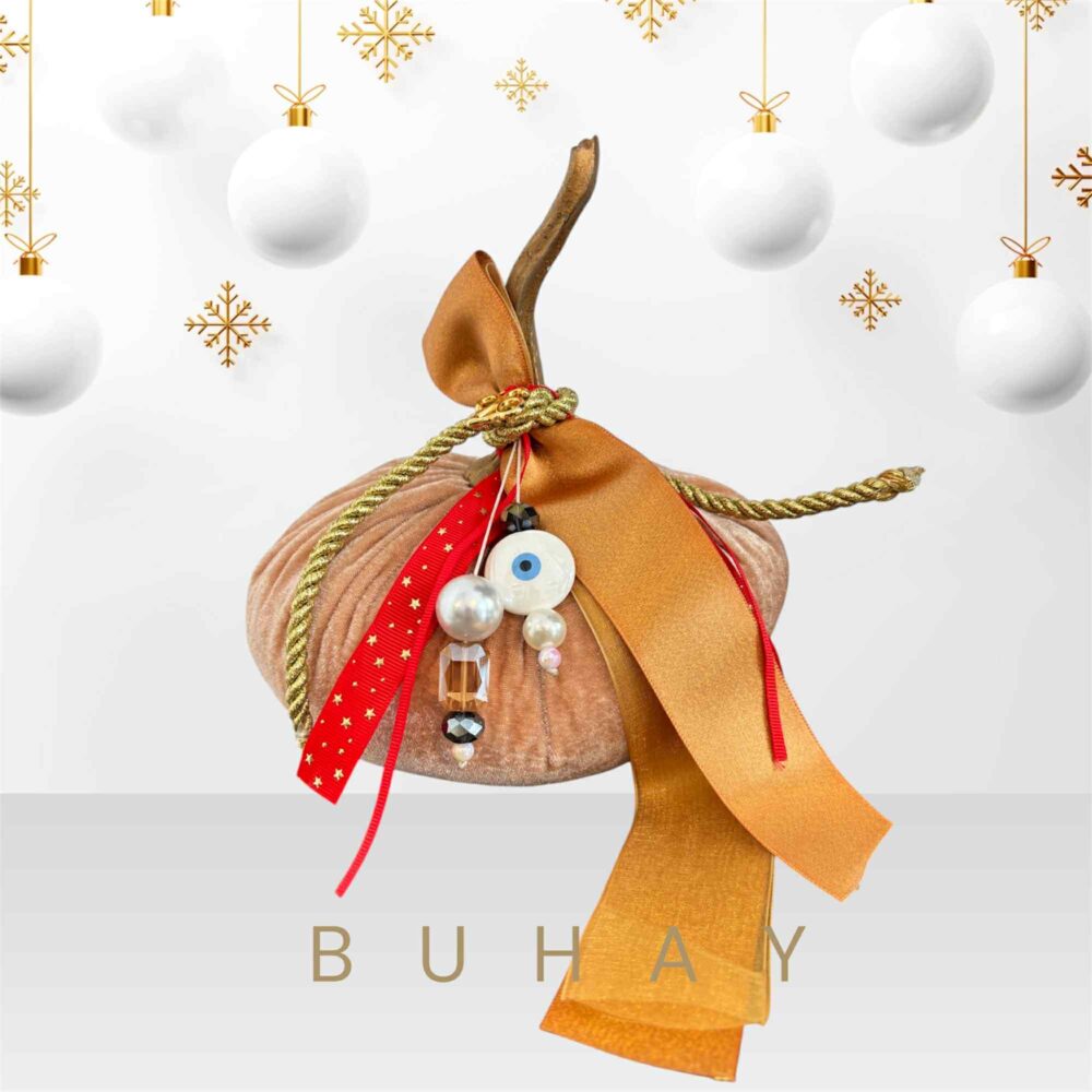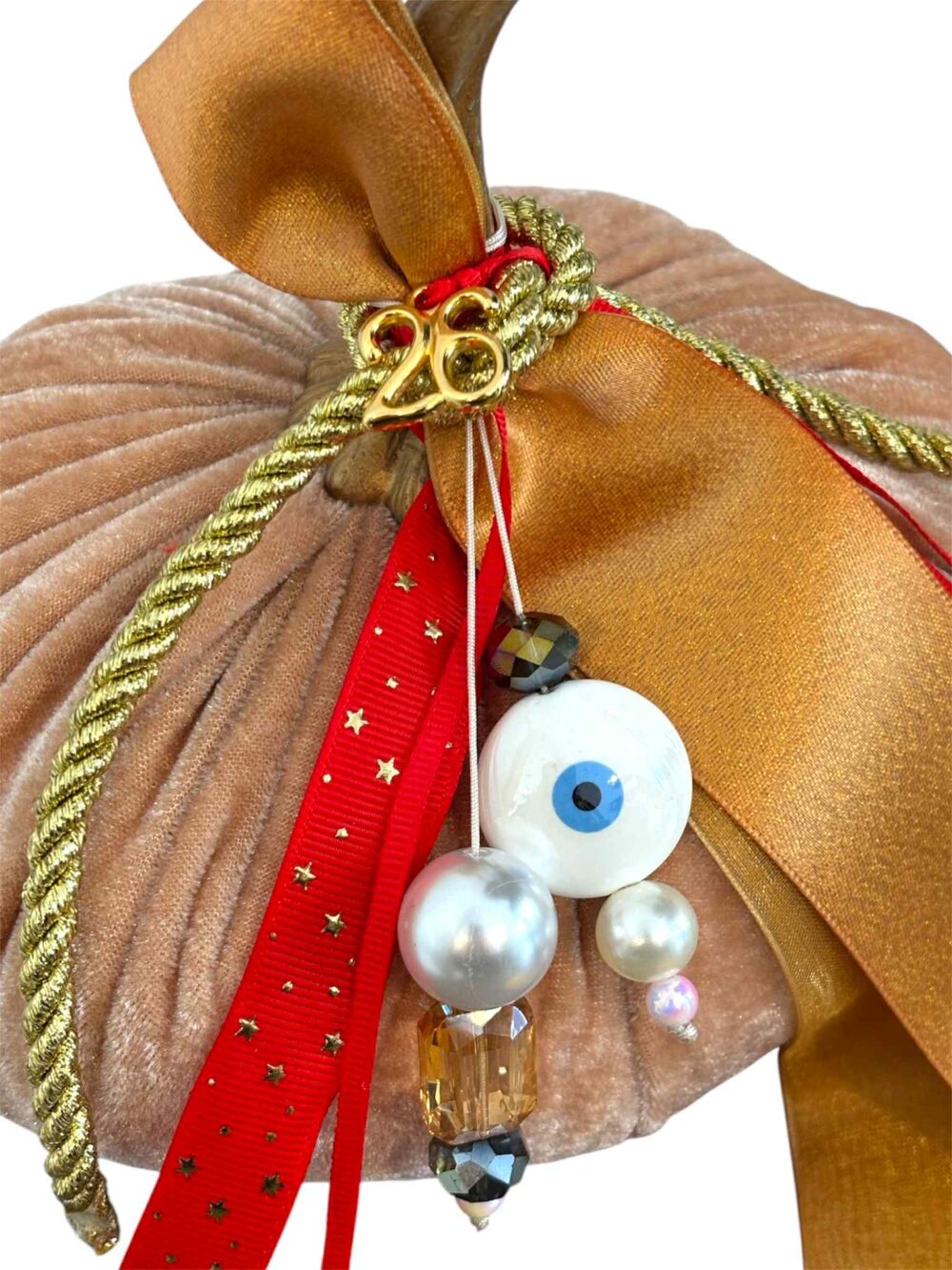 Χειροποιήτο διακοσμητικό γούρι 2026, σε κολοκύθα μπέζ βελούδινη , με διάφορα κρεμαστά , κορδέλες και το γούρι 2026.