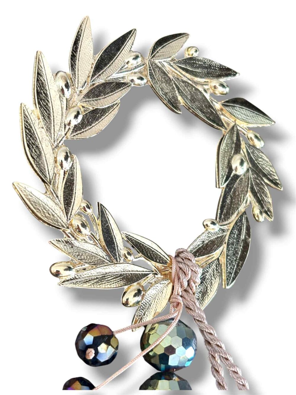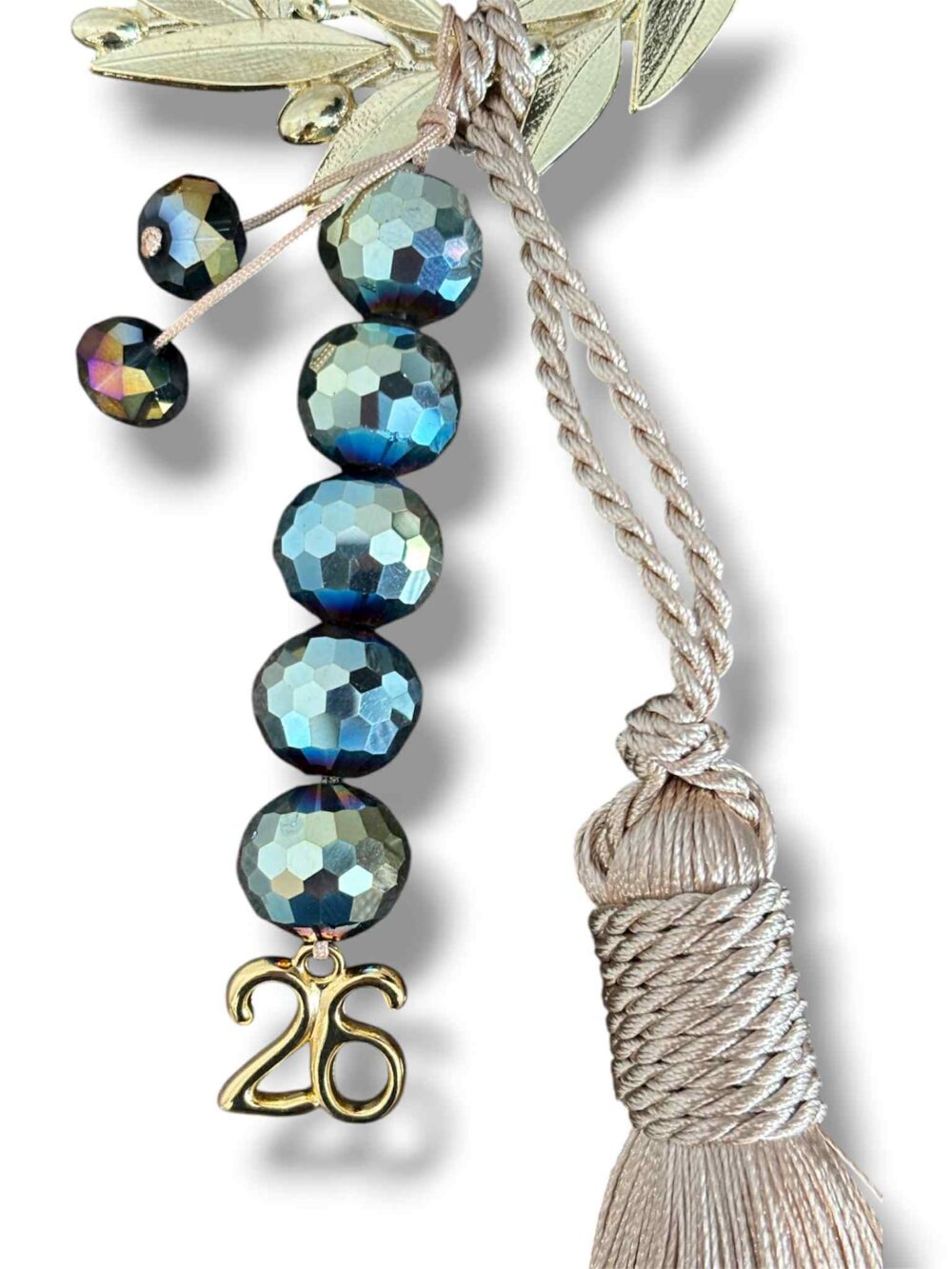 Χειροποιήτο διακοσμητικό γούρι 2026, με στεφάνι ελιάς και ιριδίζον κρύσταλλα. Εντυπωσιακή φούντα και το 26.