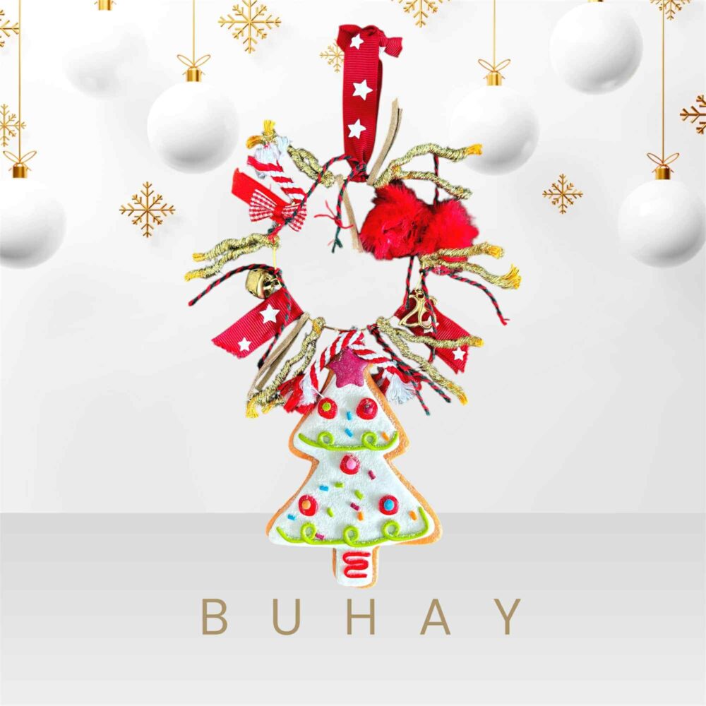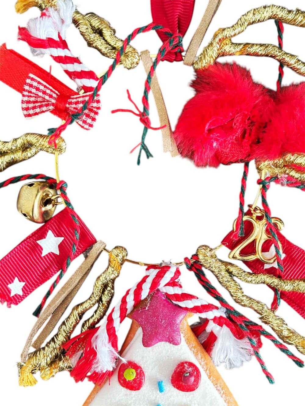 Χειροποιήτο διακοσμητικό γούρι 2026, σε σχήμα δέντρου, με εντυπωσιάκες κορδέλες , καμπανάκι και το 26 , πάνω σε μεταλικό στεφάνι.