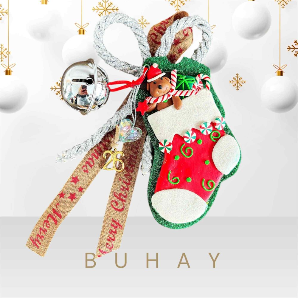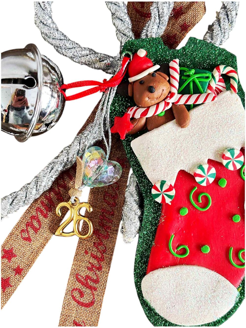 Χειροποιήτο διακοσμητικό γούρι 2026, με χριστουγεννιάτικη μπότα στολίδι,κουδουνάκι,εντυπωσιακές κορδέλες και 26 .