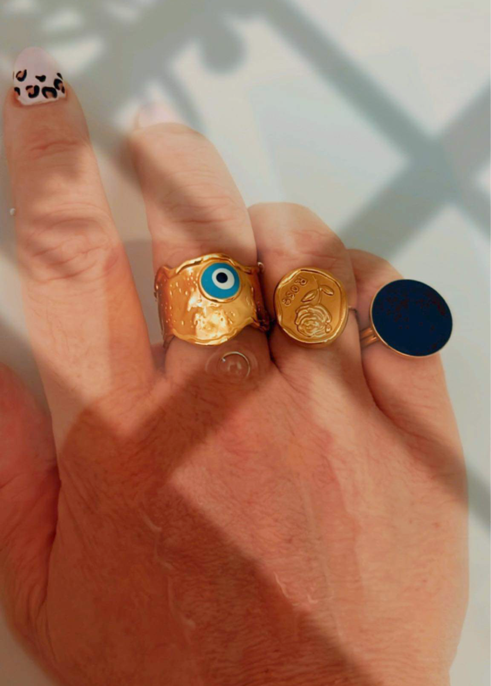 Δαχτυλίδι απο ανοξείδωτο ατσάλι επιχρυσωμένο. Εχει γαλάζιο σμάλτο.