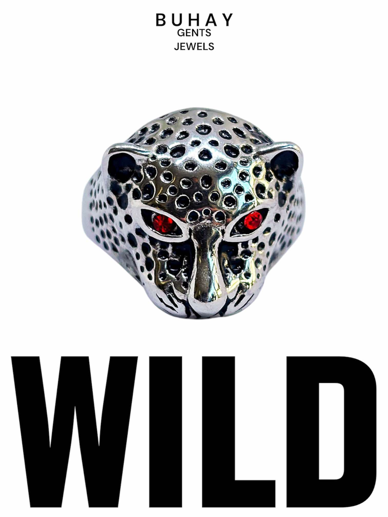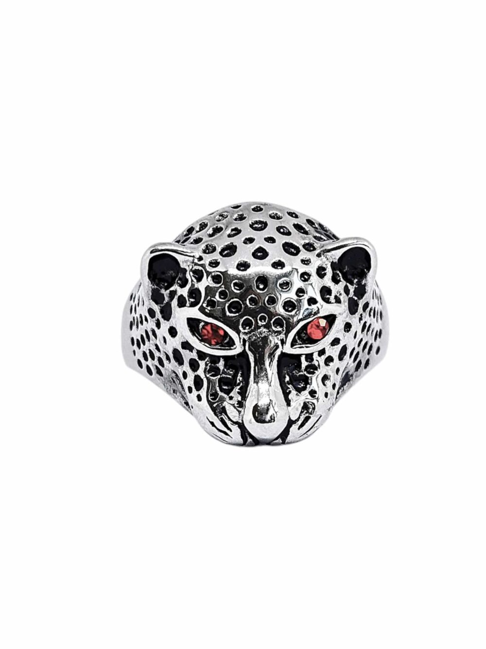 Αντρικό δαχτυλίδι απο ανοξείδωτο ατσάλι. Πάνθηρας με κόκκινα ζιργκόν.
