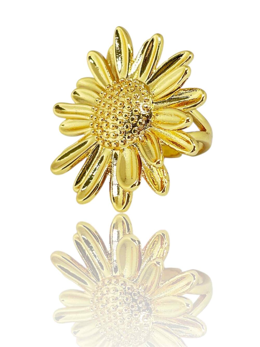 Δαχτυλίδι απο οικολογικό ορύχαλκο, επιχρυσωμένο. Σχέδιο λουλούδι ανάγλυφο . Ανοιχτή γάμπα , αυξομειώνεται εως 3 νούμεαρα.
