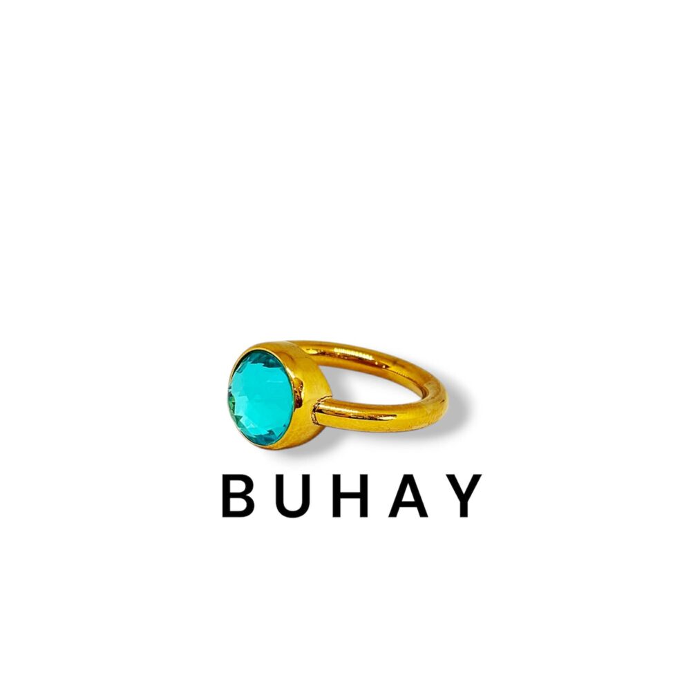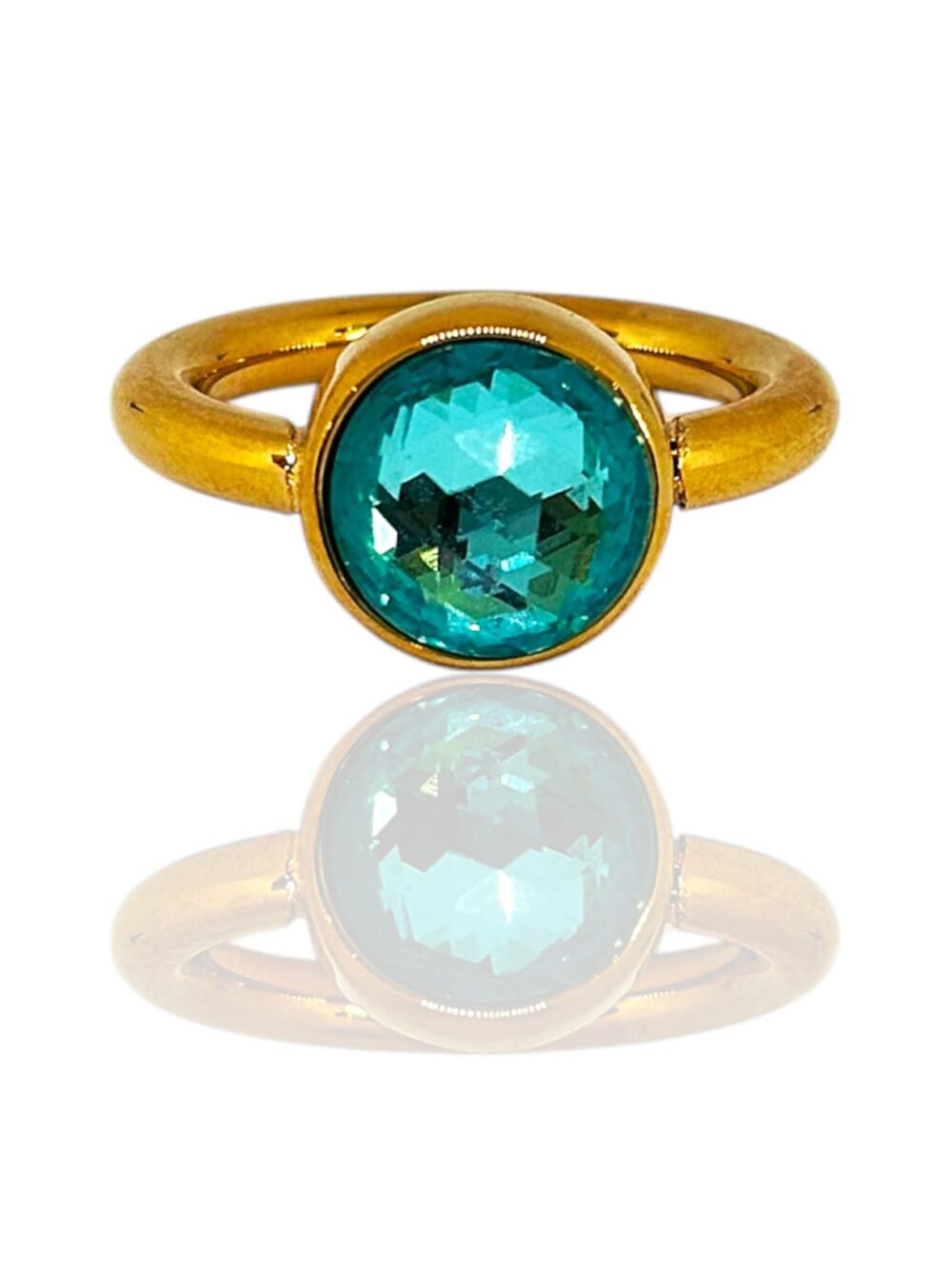 Δαχτυλίδι απο ανοξείδωτο ατσάλι . επιχρυσωμένο. Φωτείνο , με στρογγυλό ζιργκόν σε βαθύ τιρκουάζ- πράσινο , με διαμαντέ κοπή. Ένα κομμάτι που φοριέται ευκολά απο μέρα ως βράδυ.