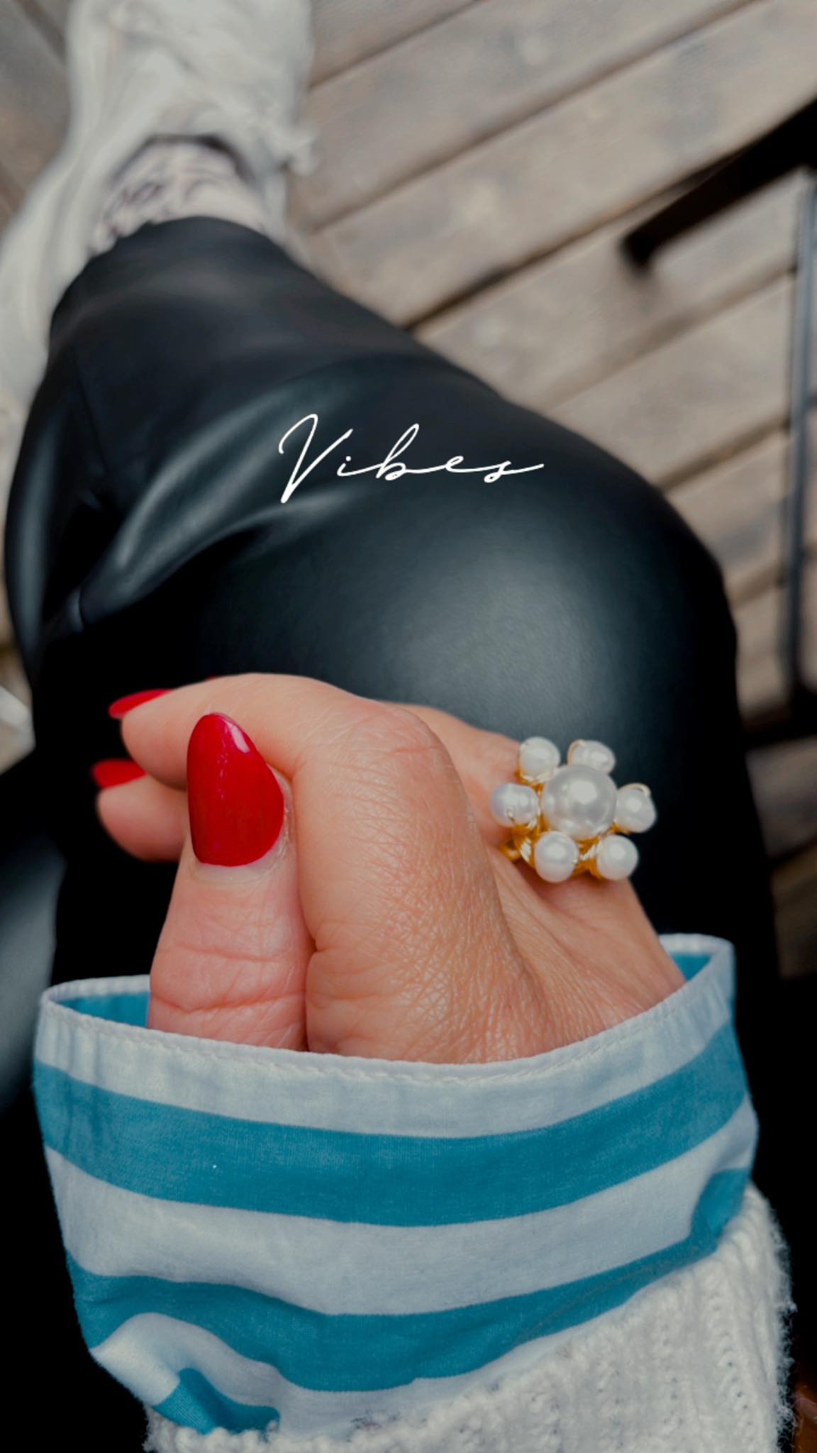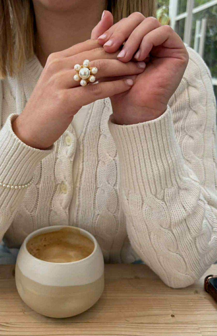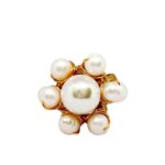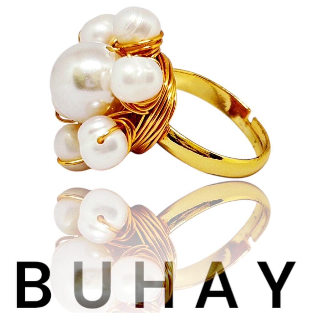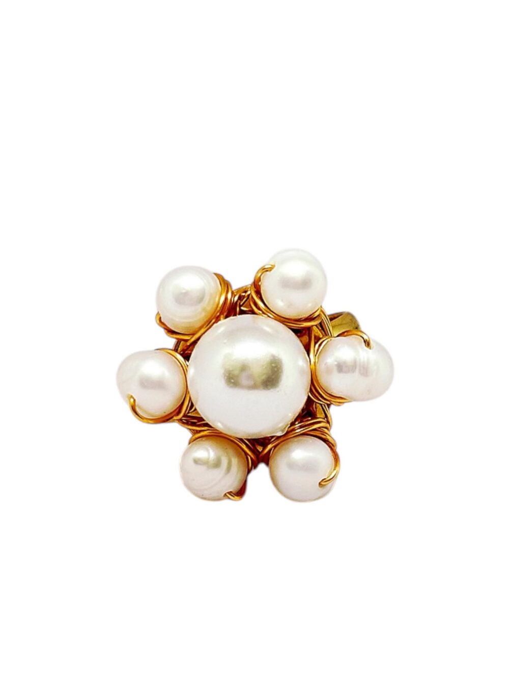 Χειροποιήτο δαχτυλίδι απο οικολογικό ορύχαλκο , επιχρυσωμένο. μαργαριτάρια (γλυκού νερού) περασμένα σε σύρμα , με βάση που κάνει σαν φωλιά και σχηματίζουν ένα λουλούδι. Ανοιγώμενη γάμπα , αυξομειώνεται εως 3 νούμερα.