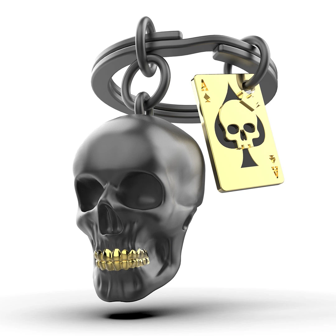 Εντυπωσιάκο μπρελόκ , με μεγάλο κρίκο , κρέμεται ενα τραπουλόχαρτο Α και ενα scull.