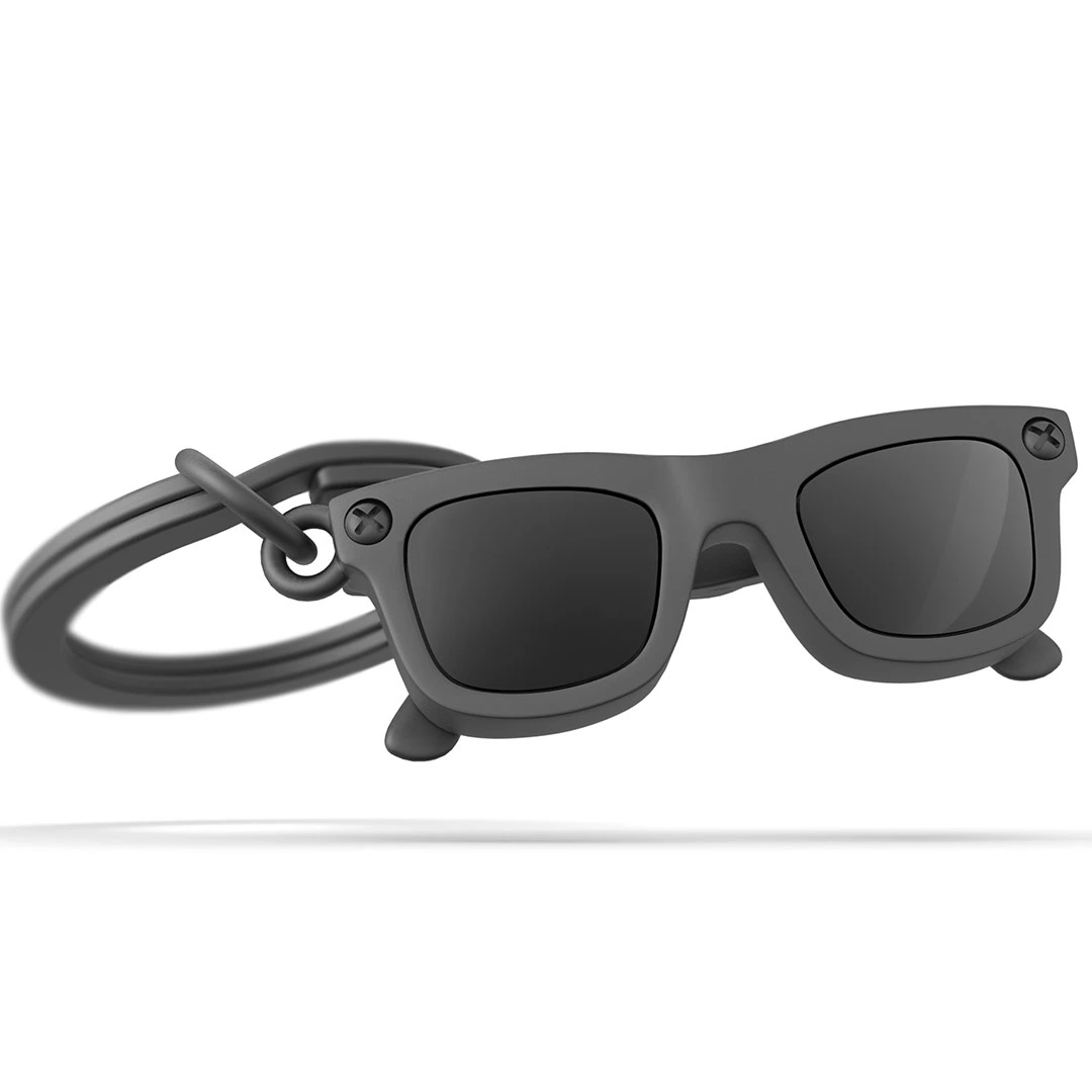 Εντυπωσιάκο μπρελόκ , με μεγάλο κρίκο , κρέμεται ενα ζευγάρι μάυρα γυαλιά.