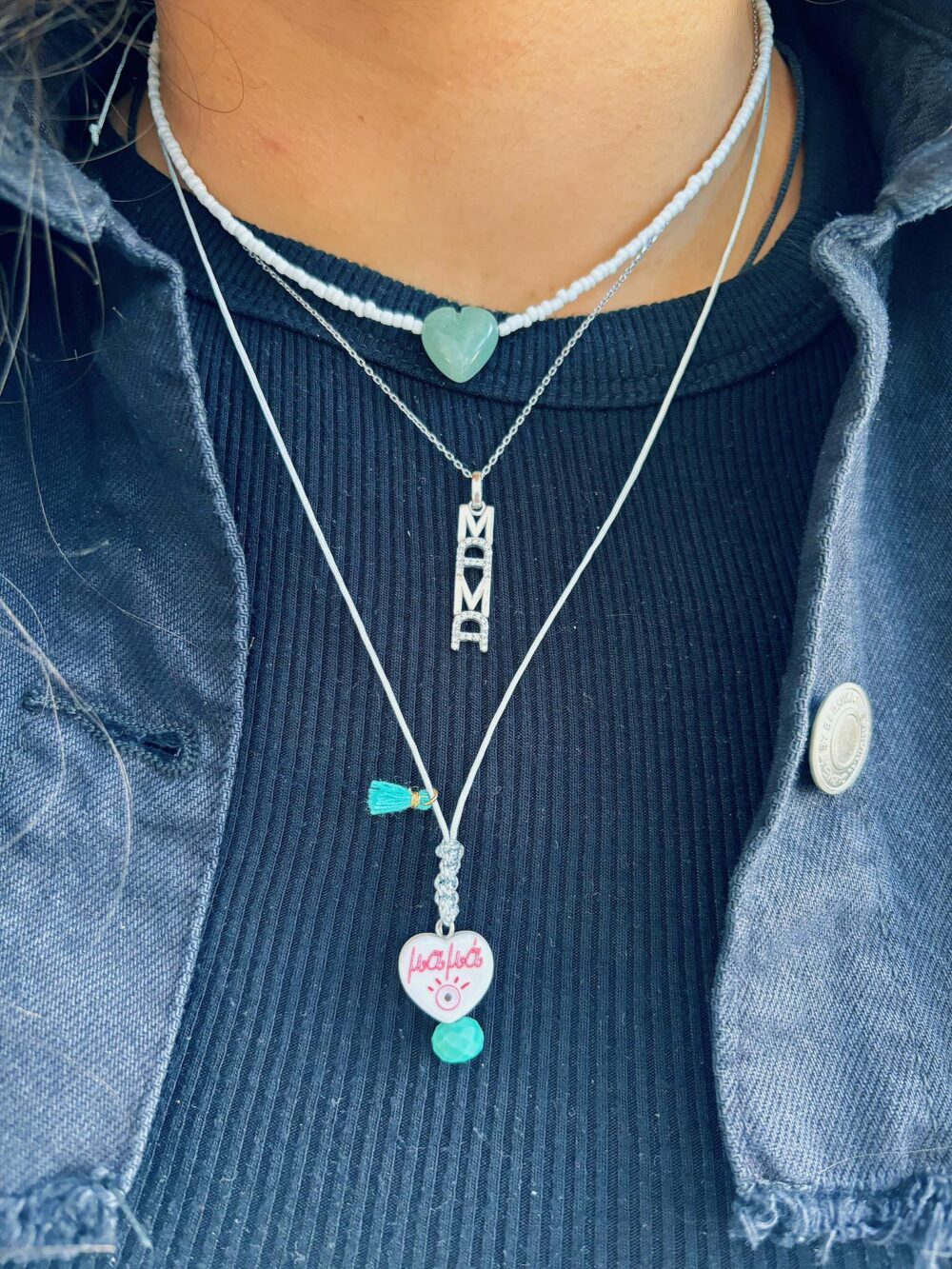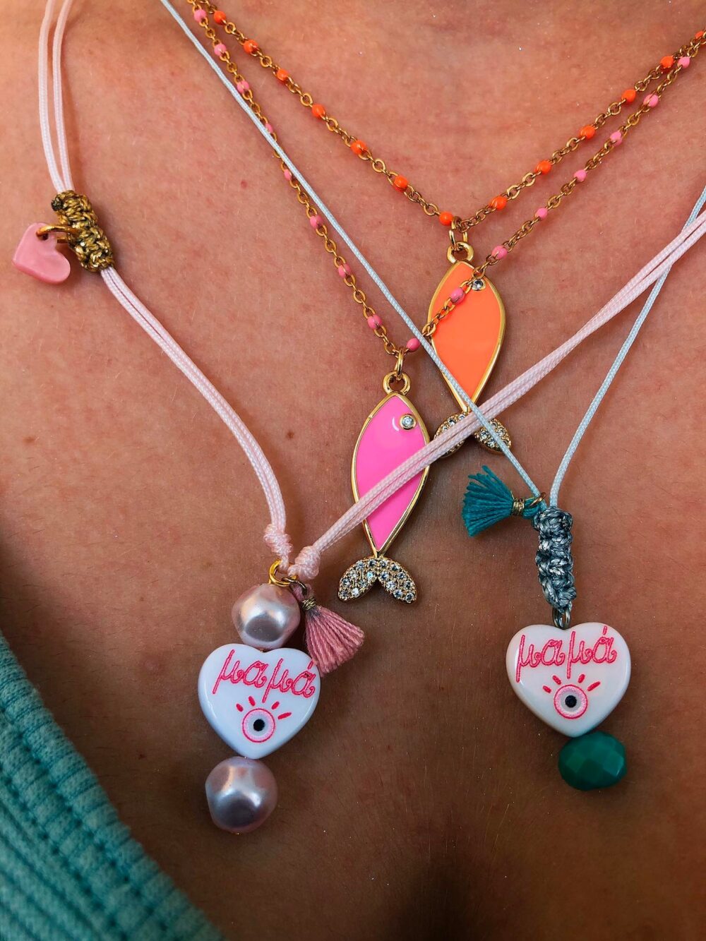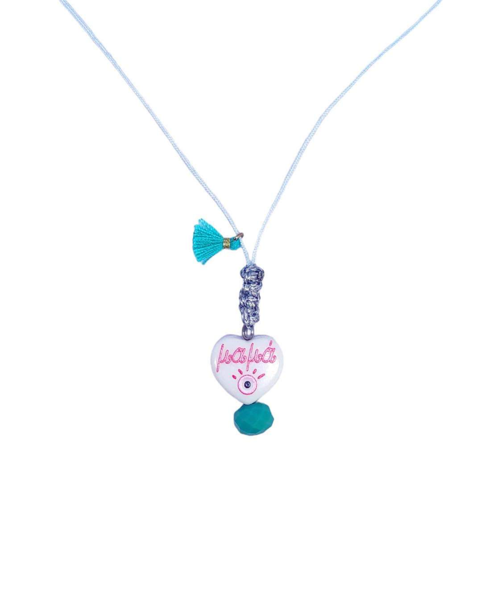 Χειροποιήτο κολιέ με καρδούλα πλέξιγκλας που γράφει μαμά.