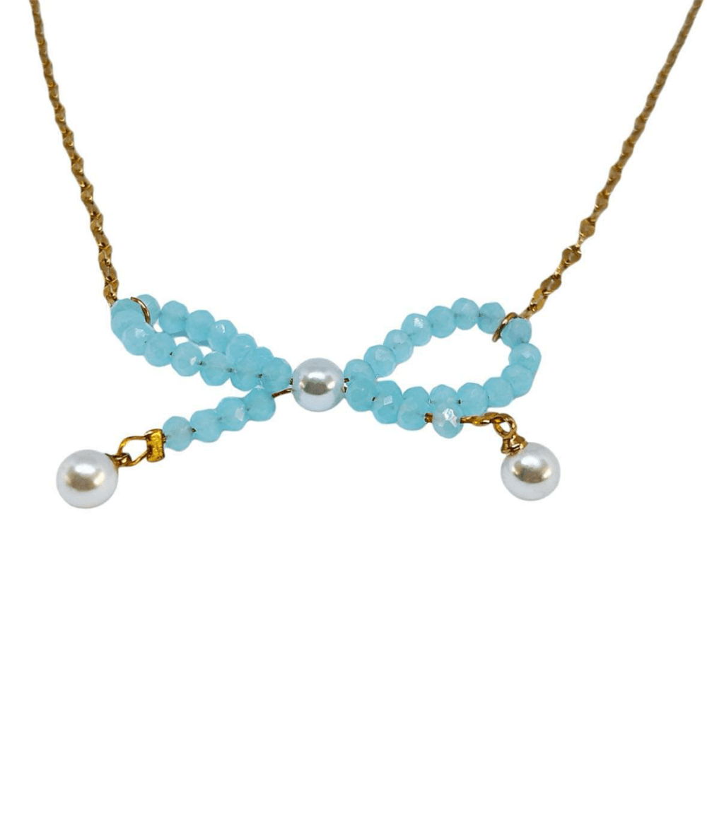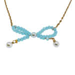 Χειροποιήτο κολιέ απο ανοξείδωτο ατσάλι , επιχρυσωμένο. Στριφτή αλυσίδα που εχει στο κέντρο φιόγκο με γαλάζια κρυσταλλάκια.