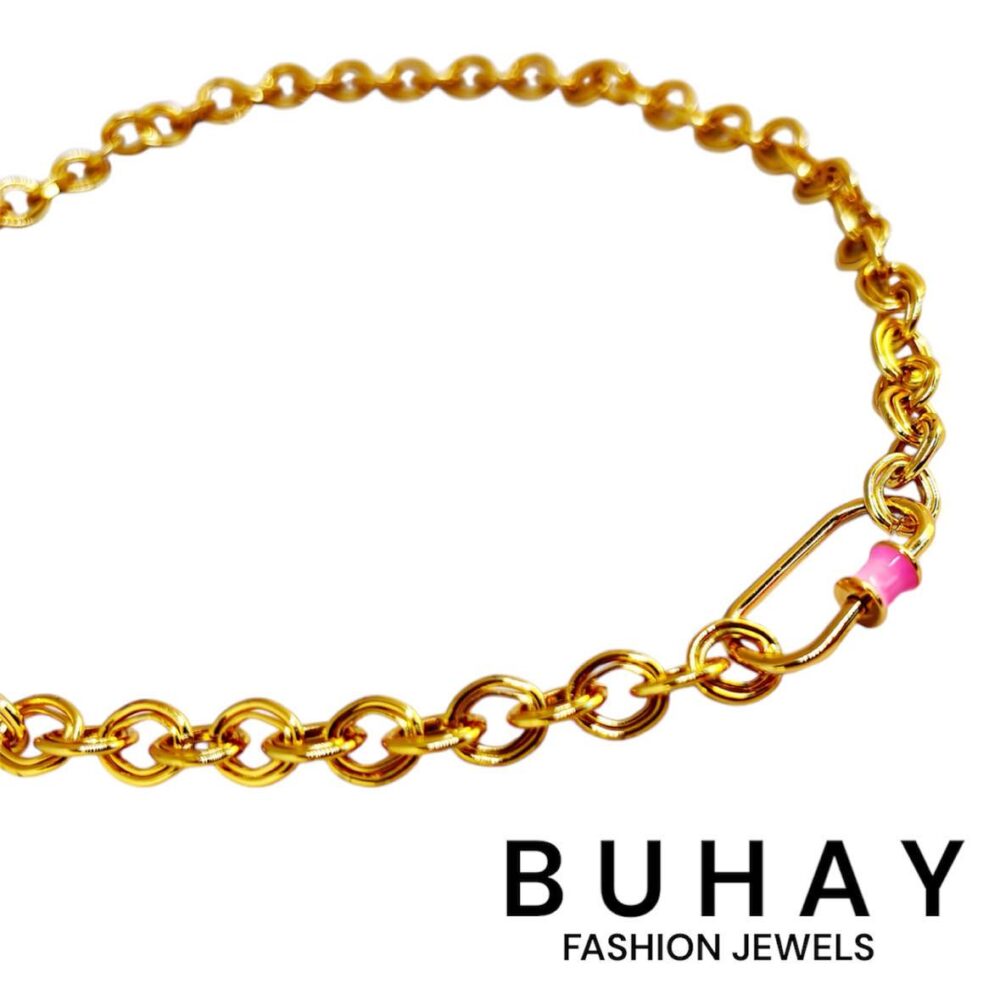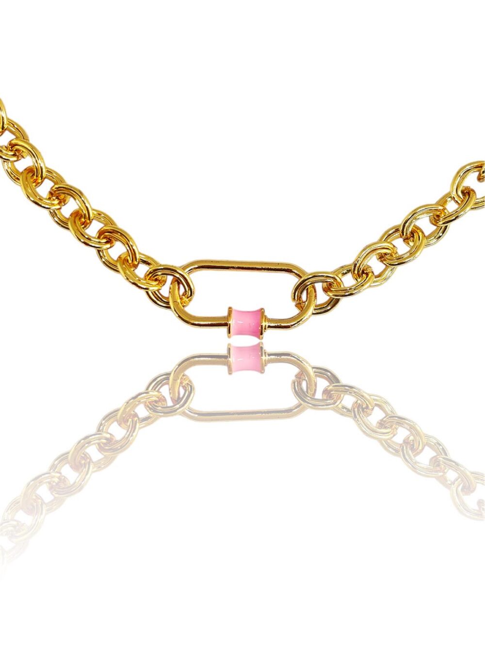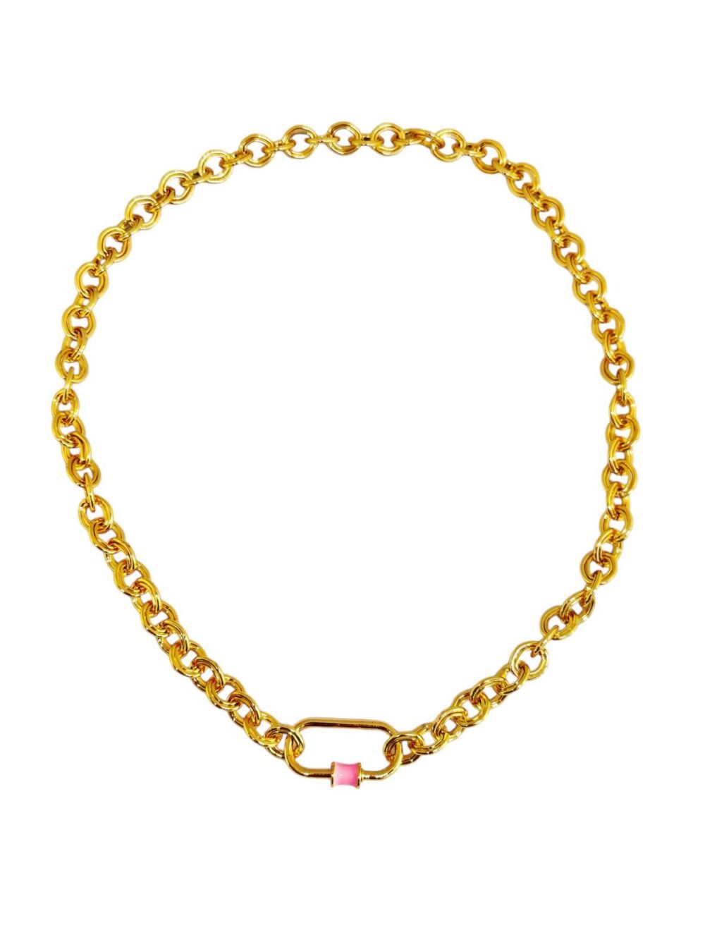 Χειροποιήτο κολιέ απο οικολογικό ορύχαλκο , επιχρυσωμένο. Καδένα με διπλό κρίκο. Κρέμεται μενταγιόν/κούμπωμα βιδωτό με ρόζ σμάλτο.