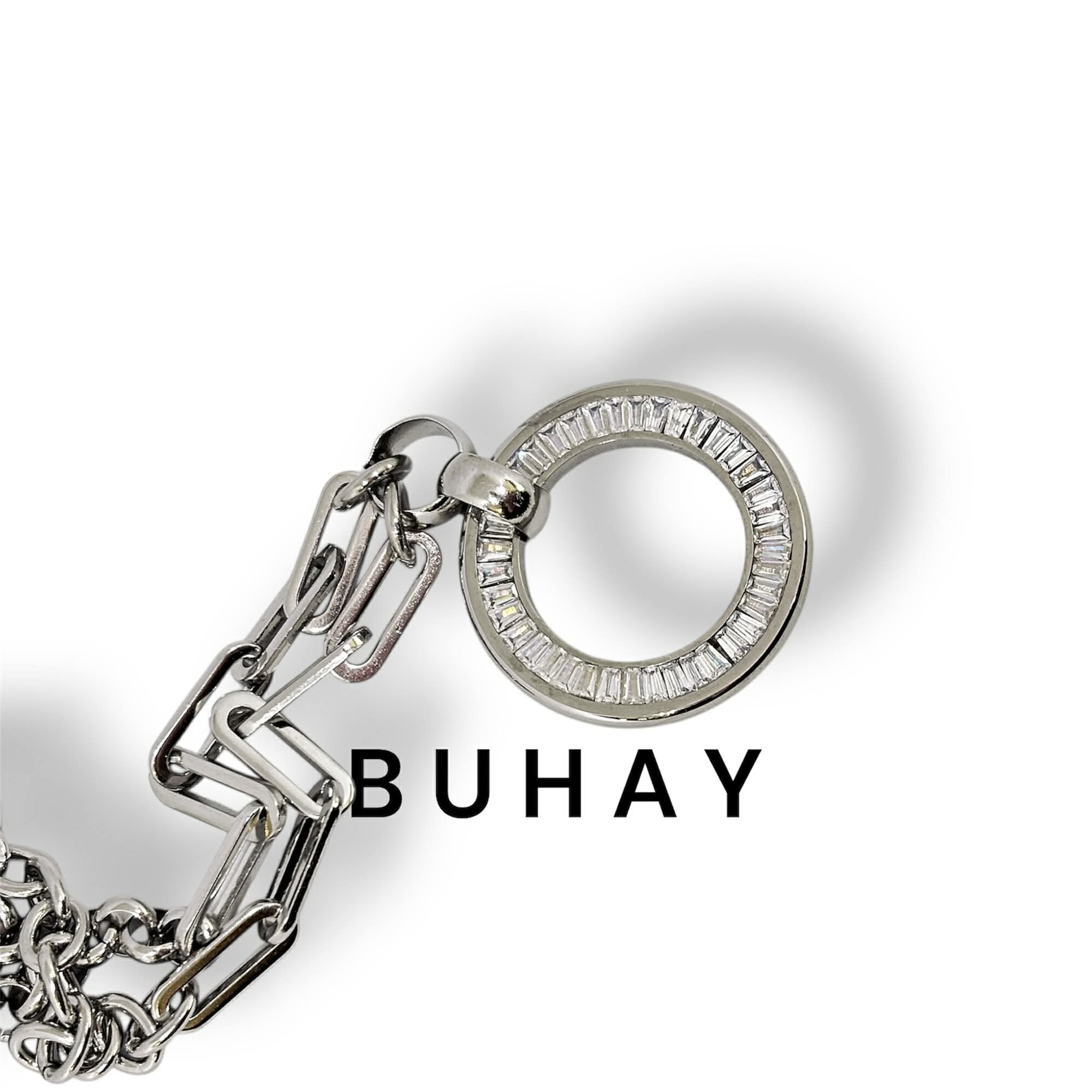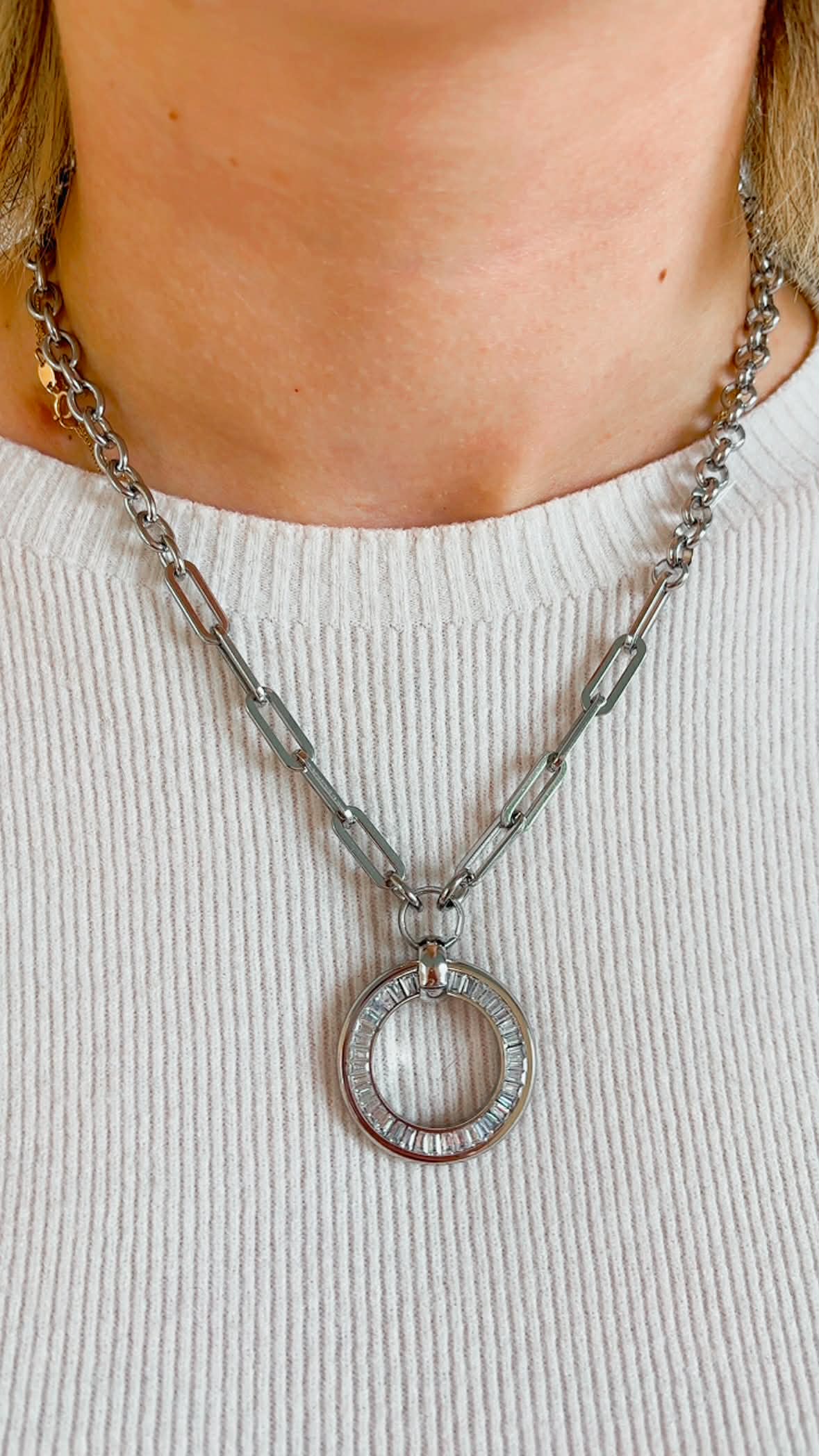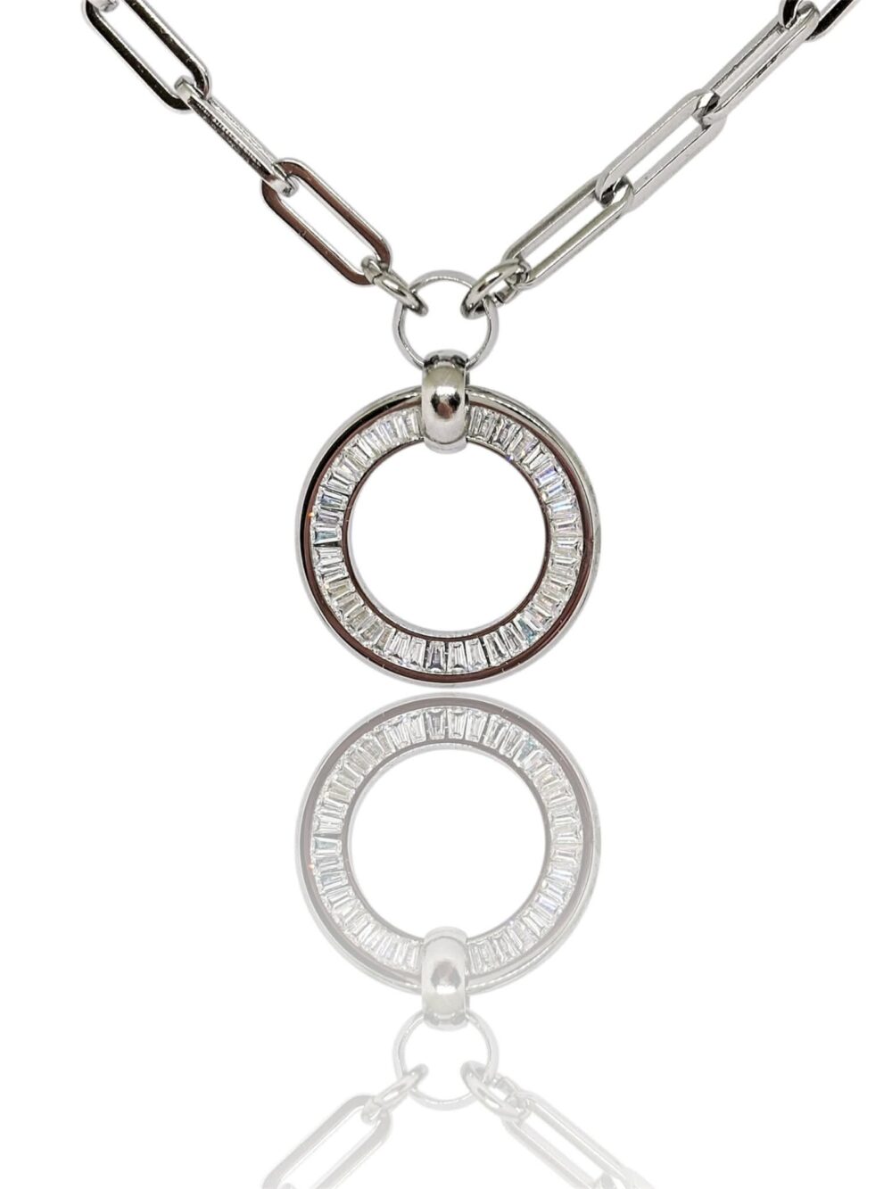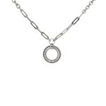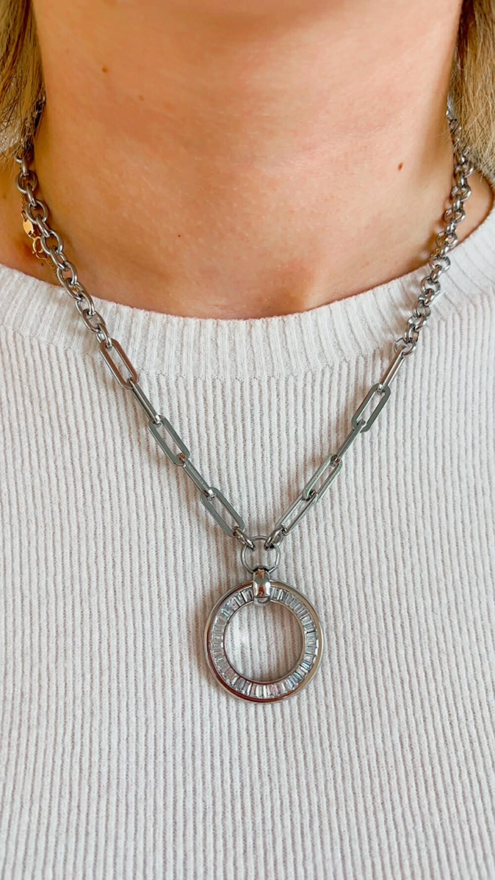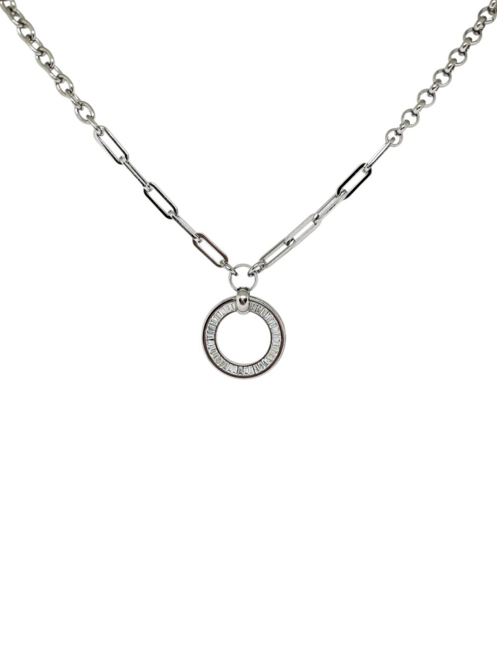 Κολιέ απο ανοξείδωτο ατσάλι. Μικτή αλυσίδα δυο τύπων , στρογγυλοί κρίκοι στο πάνω μέρος και ορθογώνιοι (paperclip) κρίκοι στο κέντρο , οπου δένει με κυκλικό μενταγιόν σε ανοιχτό σχέδιο με baguette ζιργκόν περιμετρικά που δίνουν έντονη λάμψη.