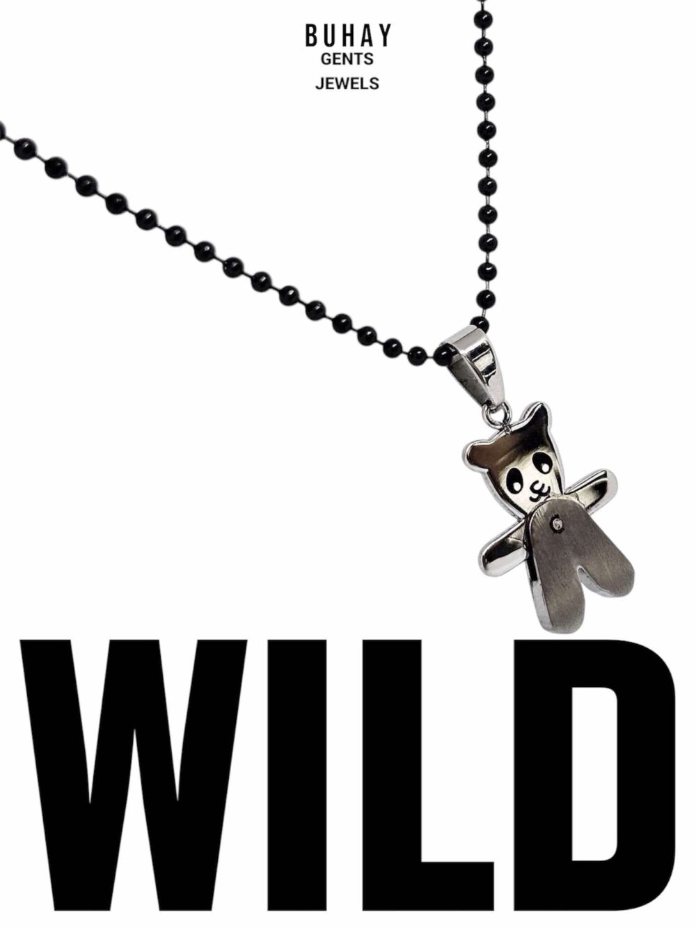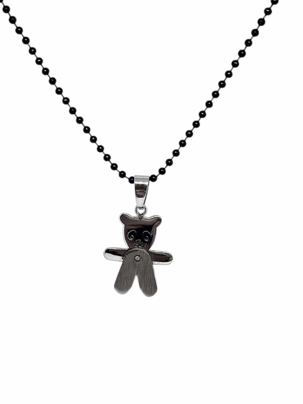 Αντρικό χειροποιήτο κολιέ απο ανιξείδωτο ατσάλι , με αλυσίδα τύπου καζανάκι , με μάυρη πατίνα. Κρέμεται ένα αρκουδάκι.