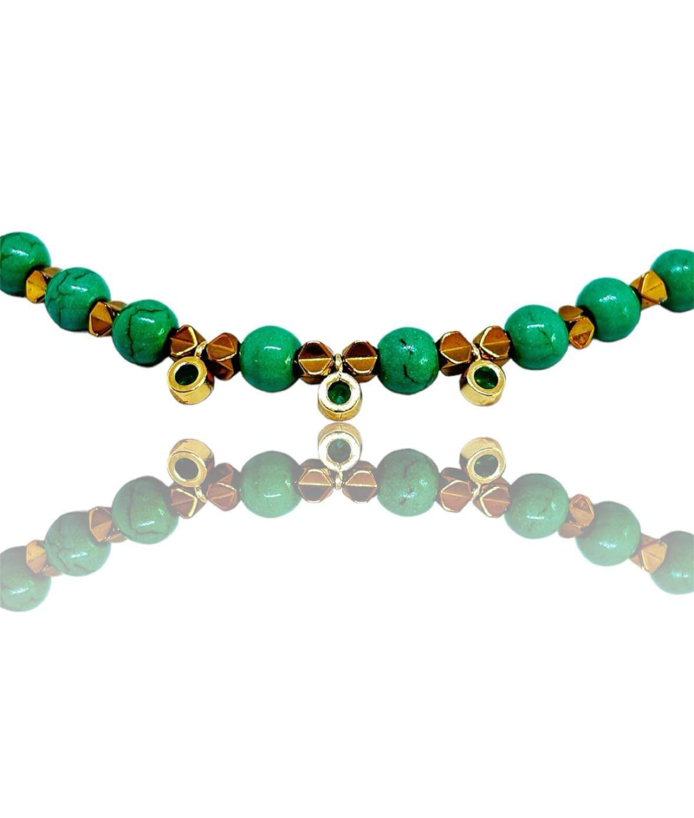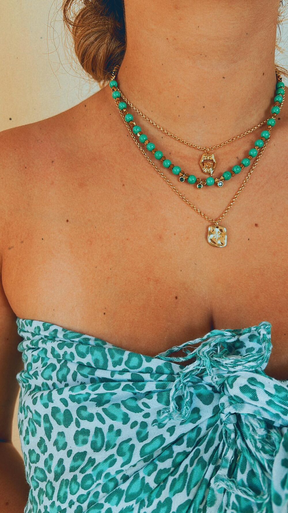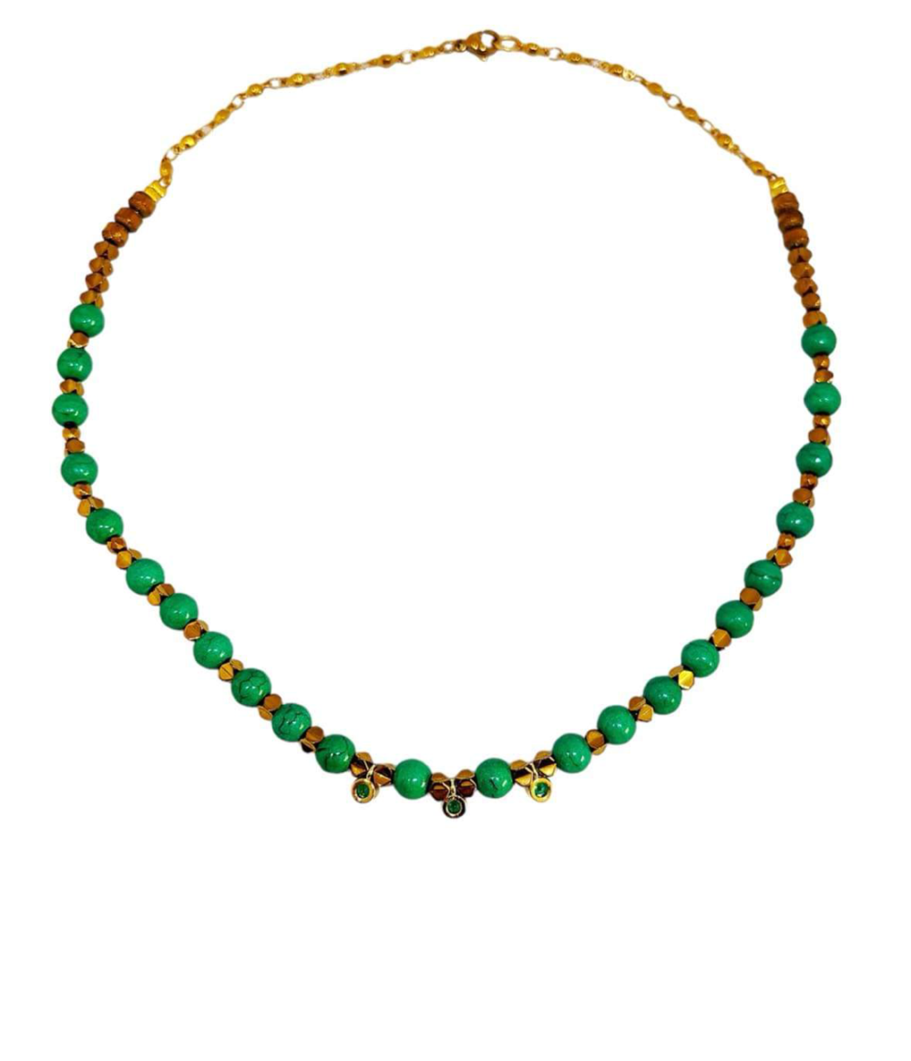 Χειροποιήτο κολιέ σε ατσάλι με ορυκτό πράσινο χαολίτη , χρυσοπυρίτη και επιχρυσωμένο αματίτη. Στο κέντρο κρέμονται, στρογγυλά μοτιφάκια με πράσινα ζιργκόν. Τελειώμα με επίχρυση αλυσίδα απο ατσάλι σε ιδιαίτερο σχέδιο.