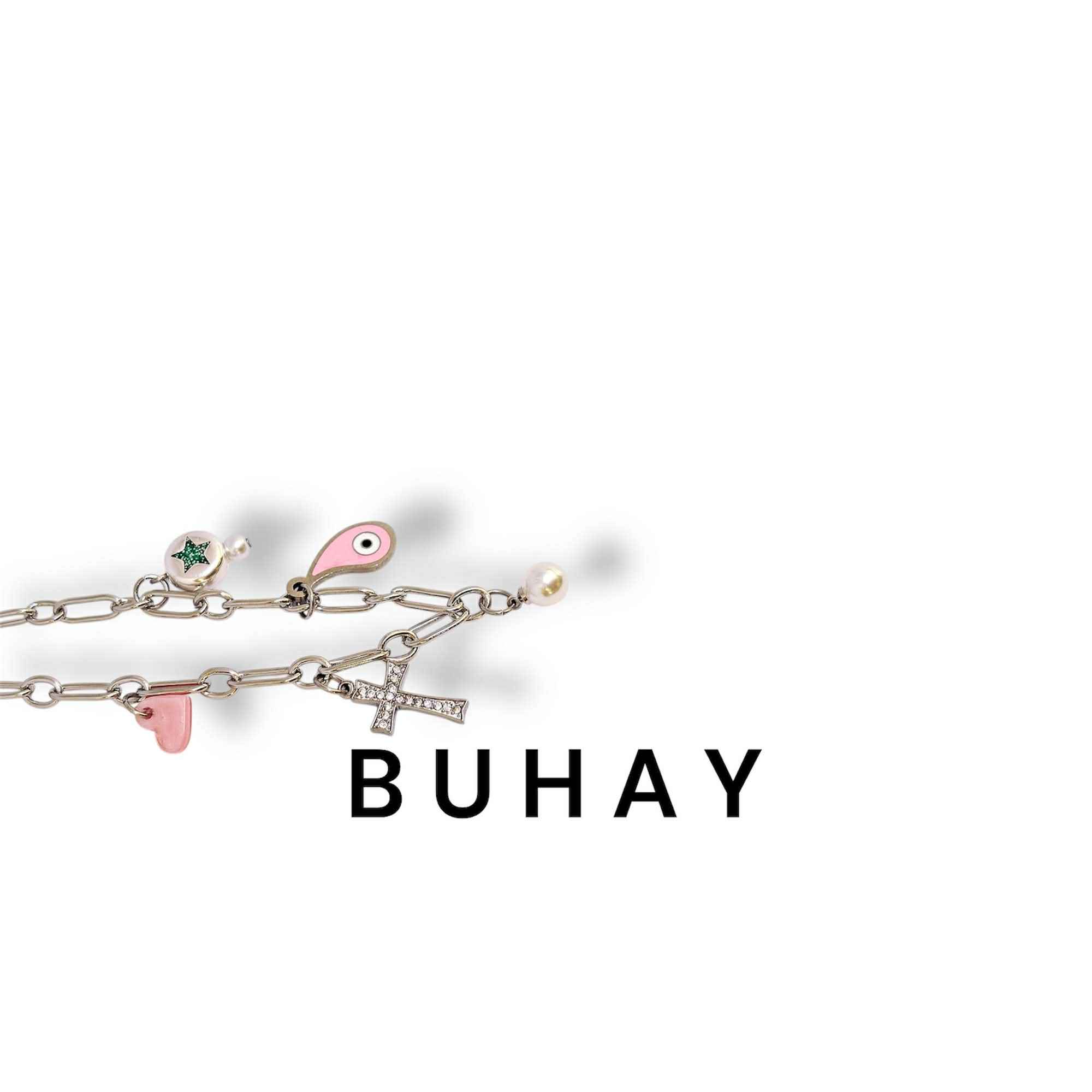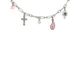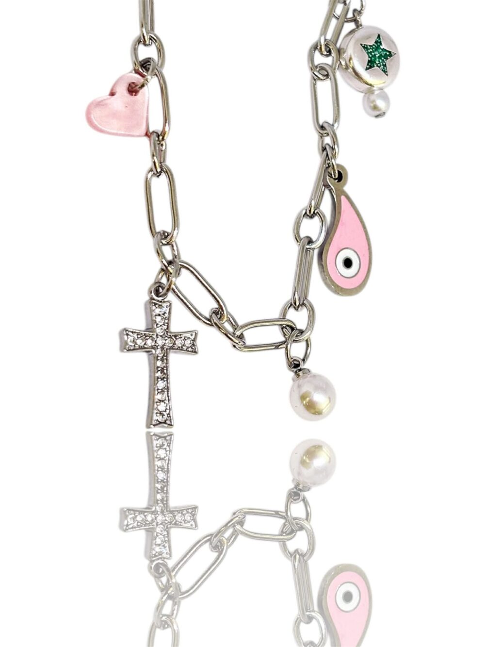 Χειροποίητο κολιέ απο ανοξείδωτο ατσάλι.Αλυσίδα paperclip με 6 διαφορετικά charms . Ροζ καρδιά , σταυρός με ζιργκόν , ρόζ μάτι , αστέρι με στράς και pearl . Κάθε charm εχει το δικό του στύλ.
