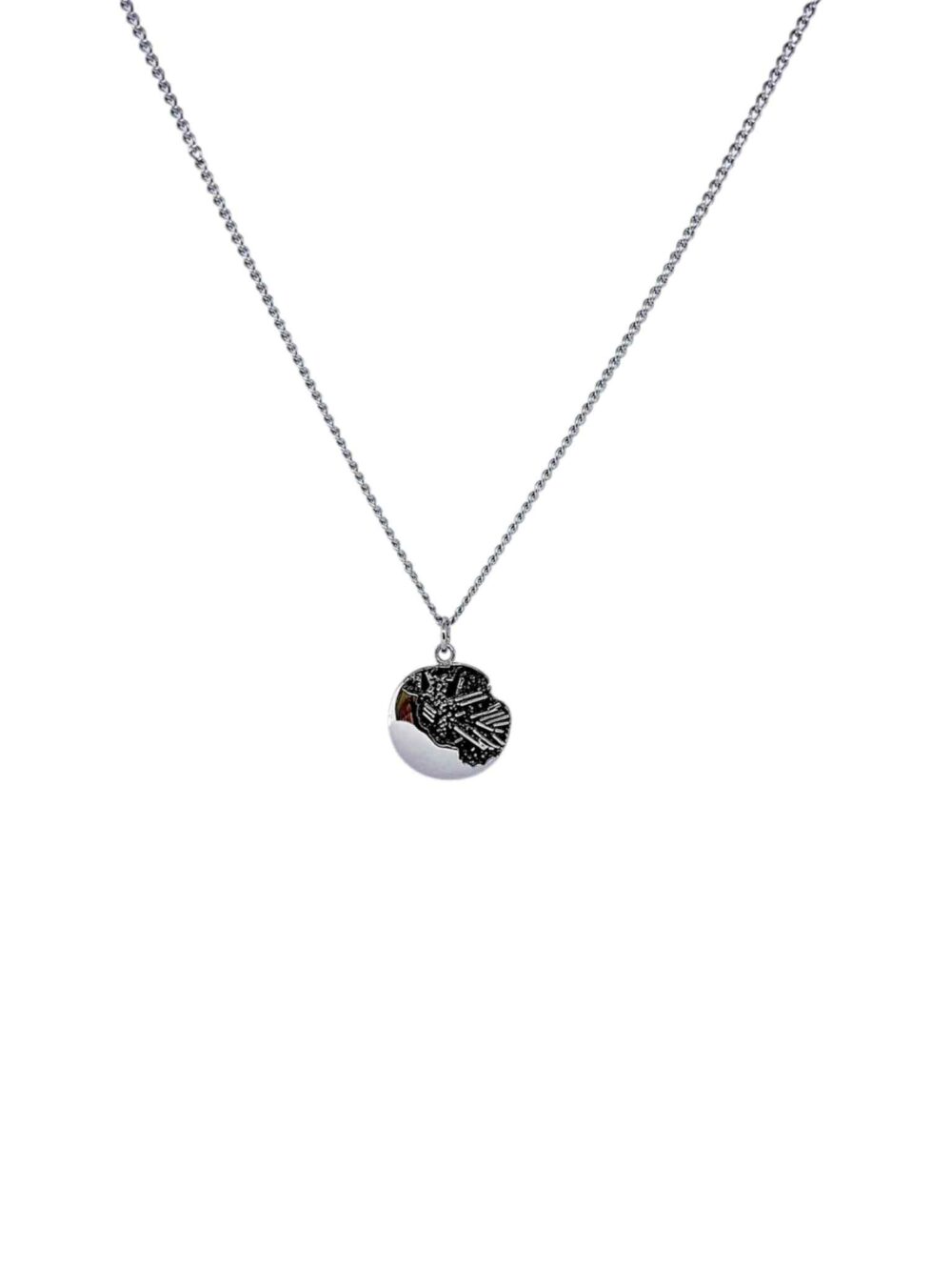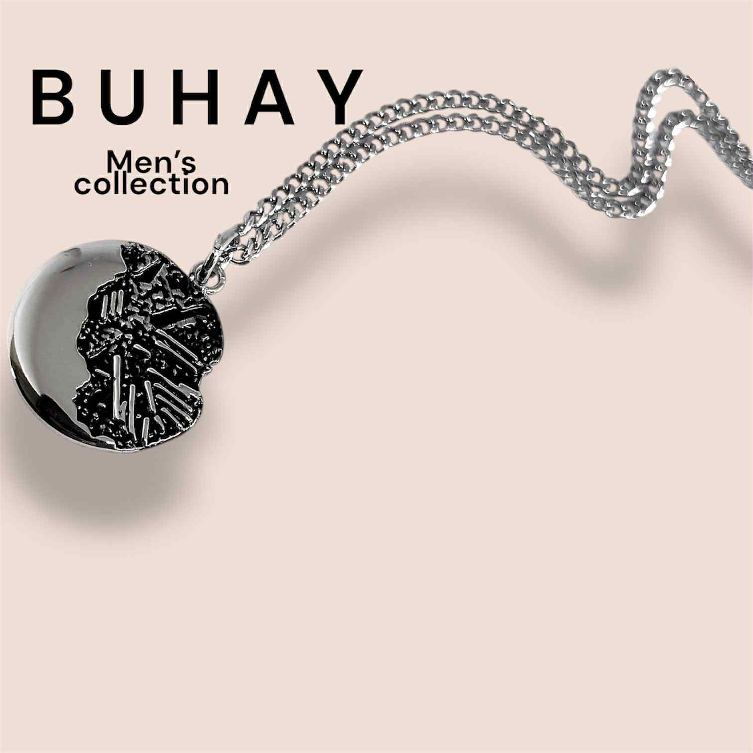 Αντρικό κολιέ , απο ανοξείδωτο ατσάλι. Με κλασική αλυσίδα και περασμένο ενα στρογγυλό μενταγιόν με σχέδιο.