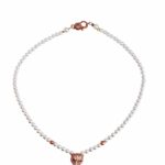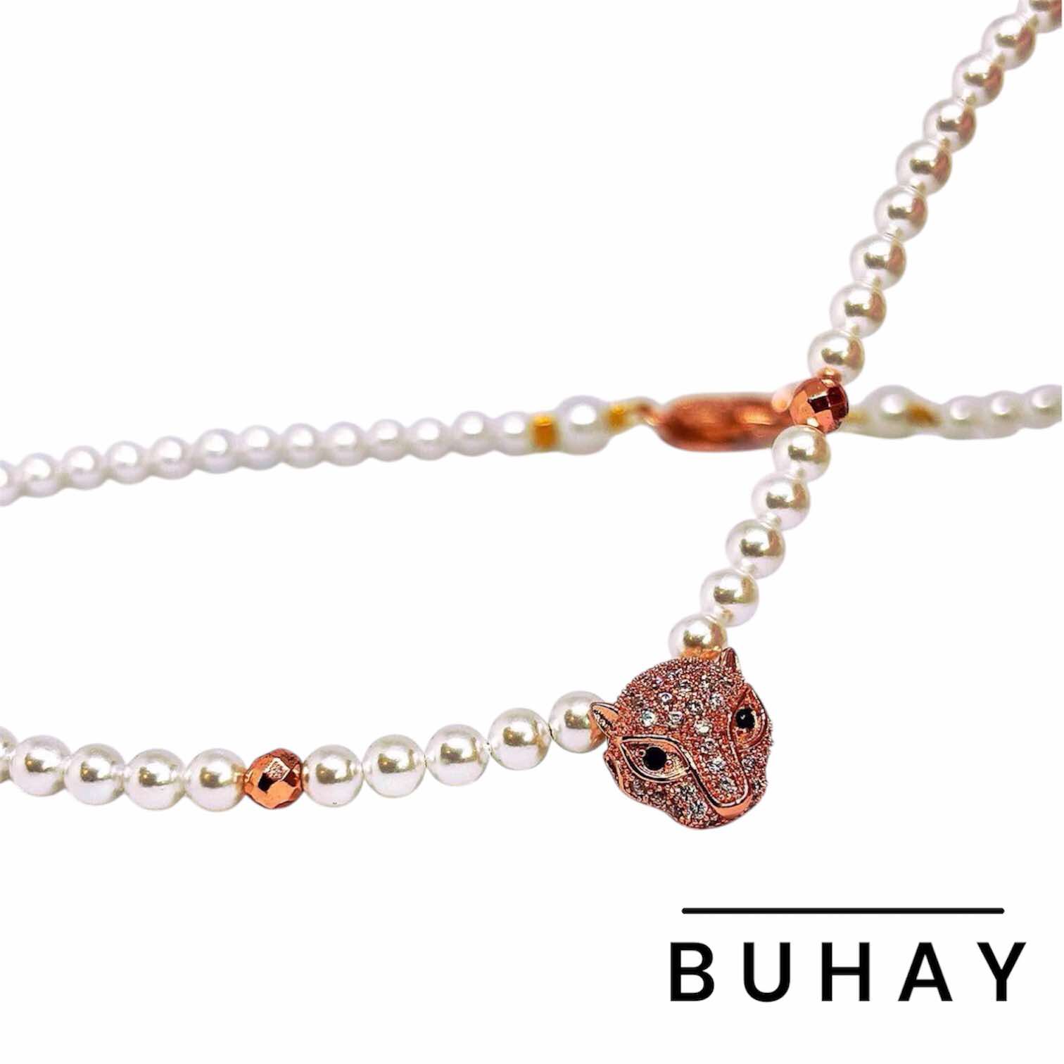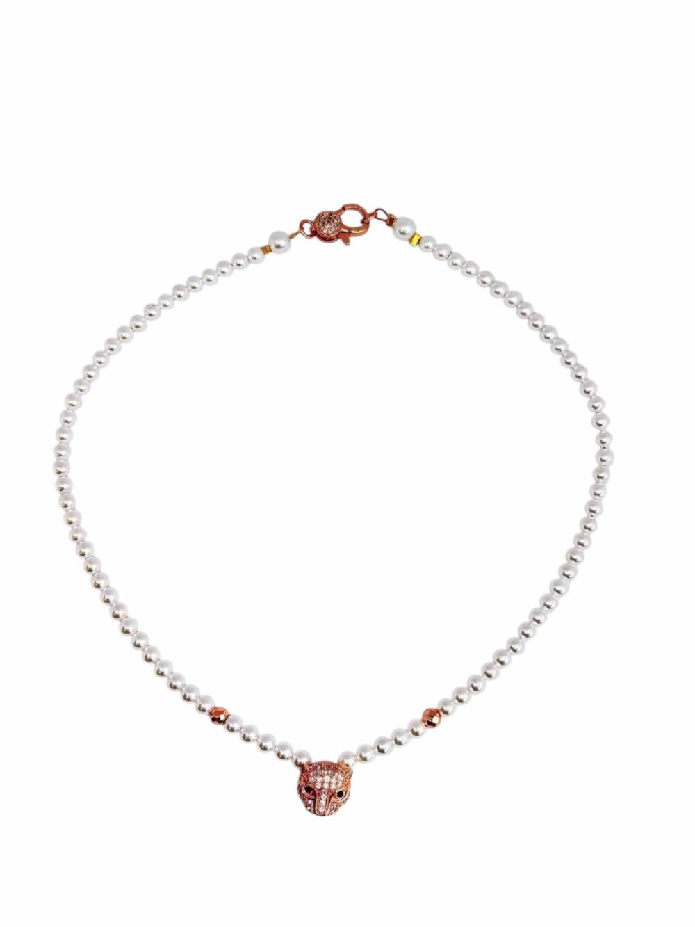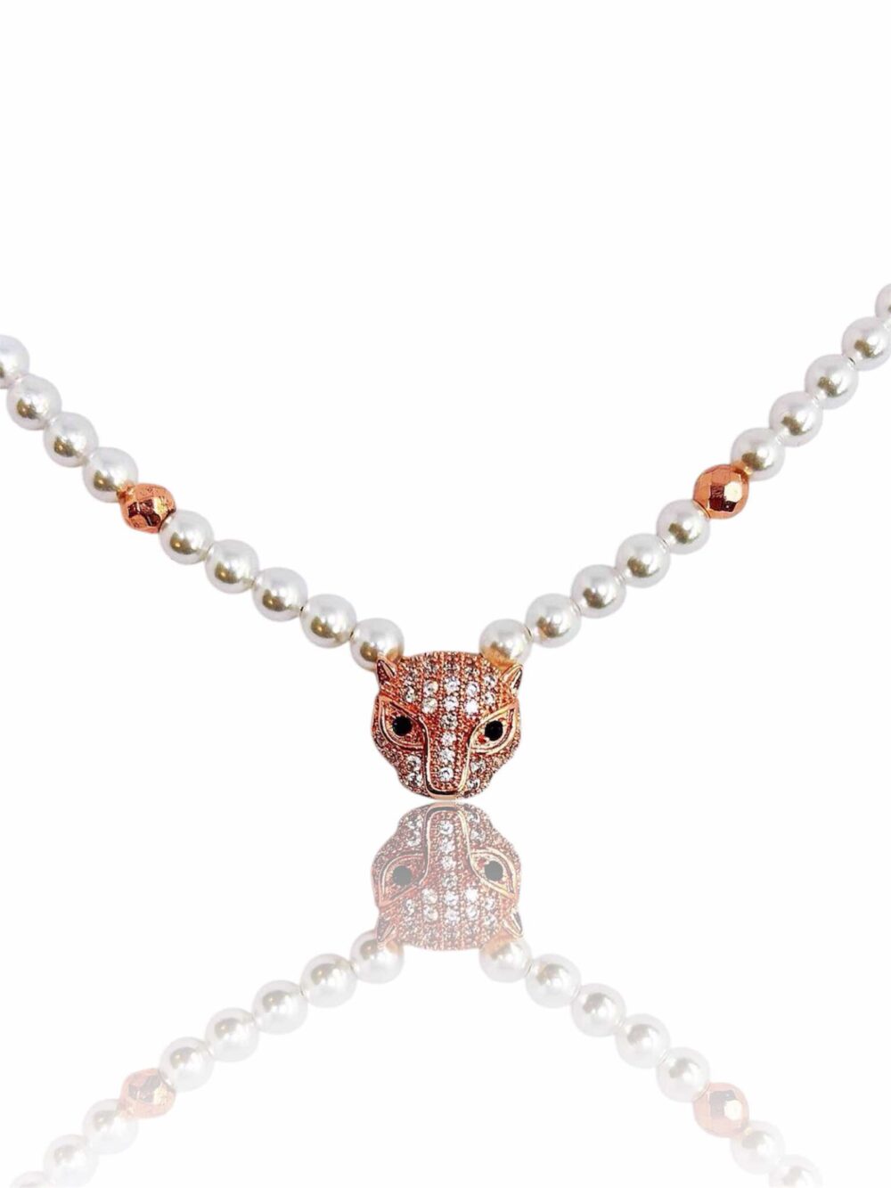 Χειροποιήτο κολιέ , με πέρλα απο φιλντισι , δεμένο σε ατσάλι , με εντυπωσιακό κούμπωμα ασφαλείας , με ζιργκόν.Εχει στο κέντρο περαστό μενταγιόν πάνθηρα απο οικολογικό ορύχαλκο με ρόζ χρύσωμα. Αριστερά και δεξιά του πάνθηρα υπάρχει απο μια χάντρα ορυκτού αιματίτη σε ρόζ μεταλικό χρώμα και διαμαντέ κοπή.