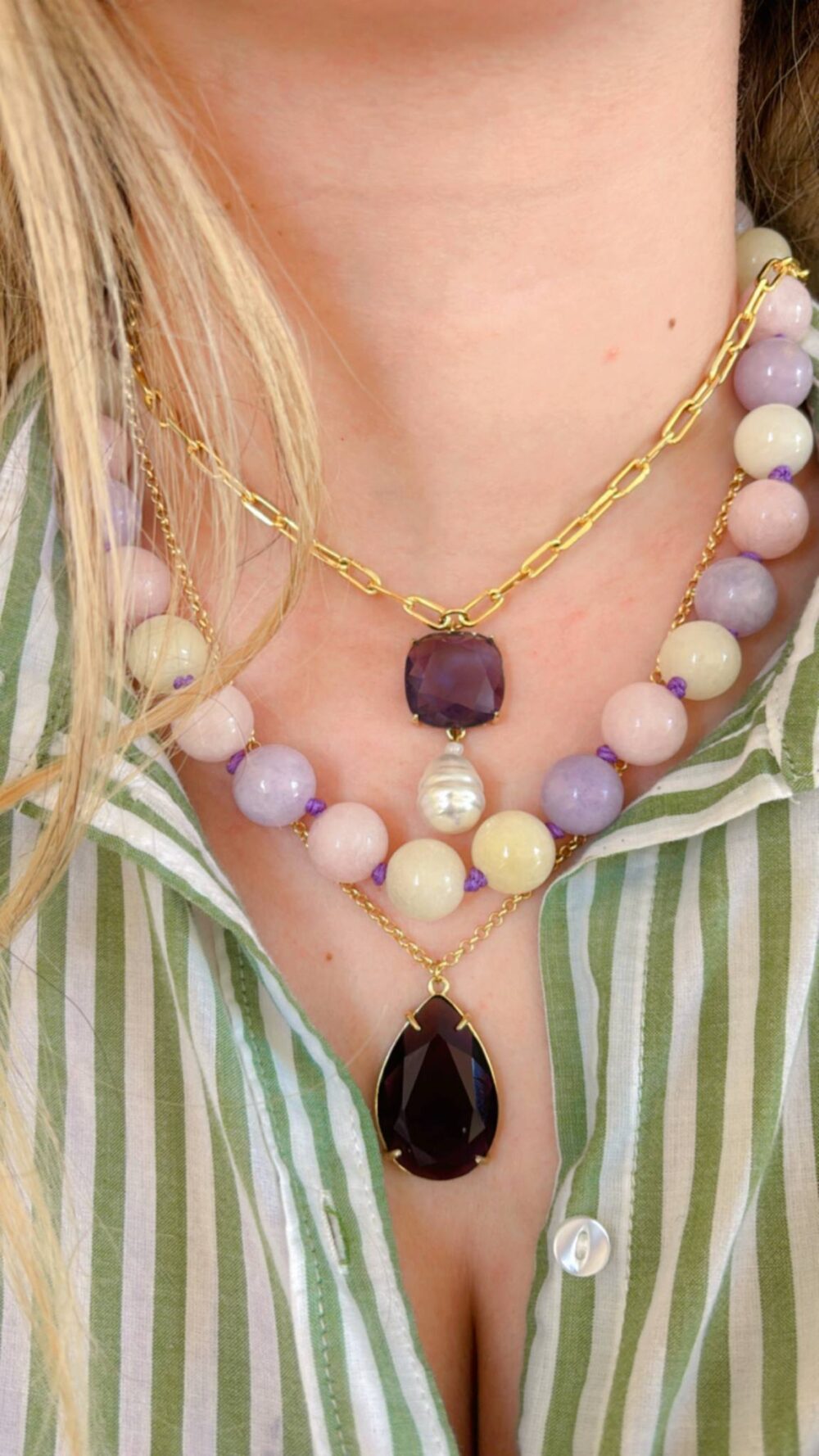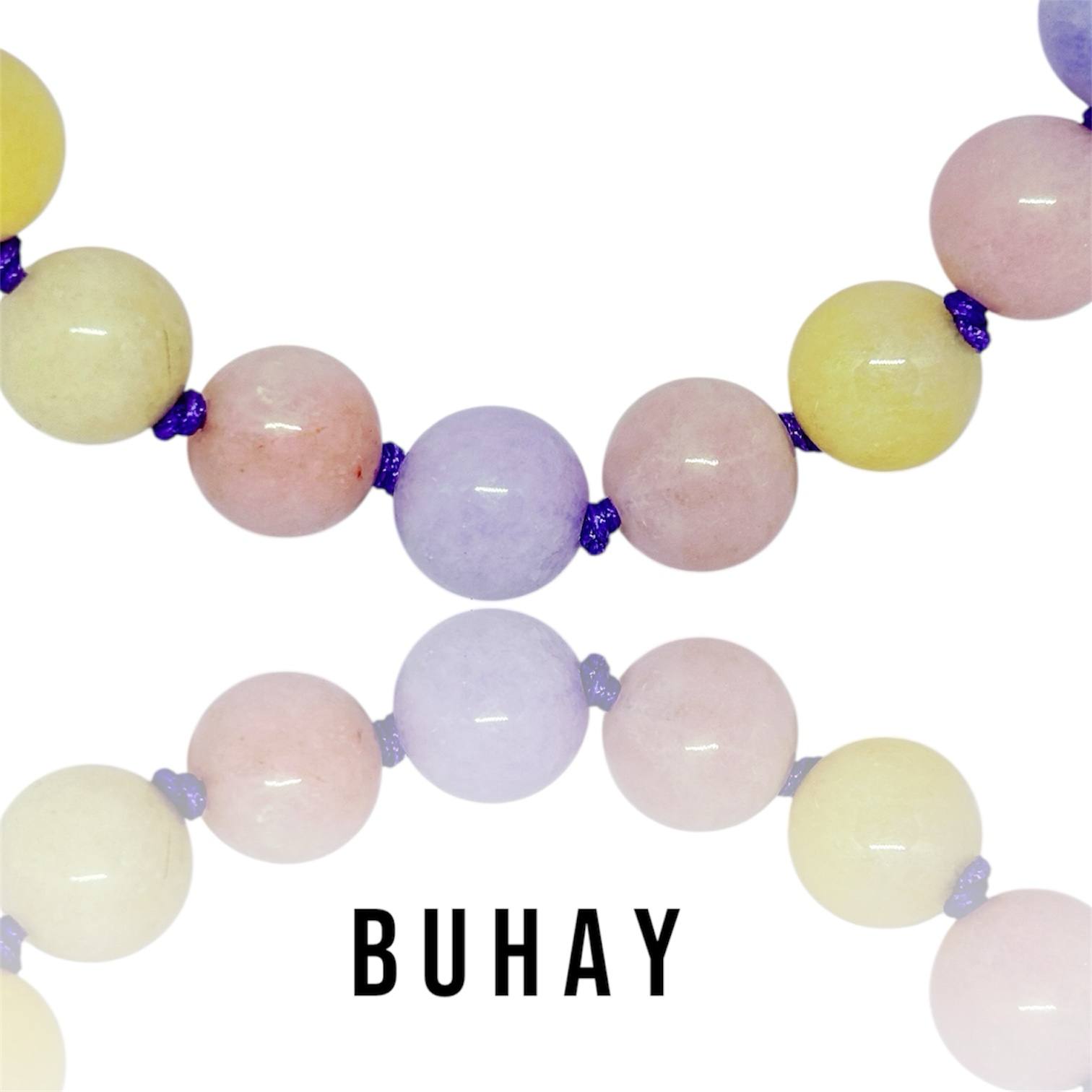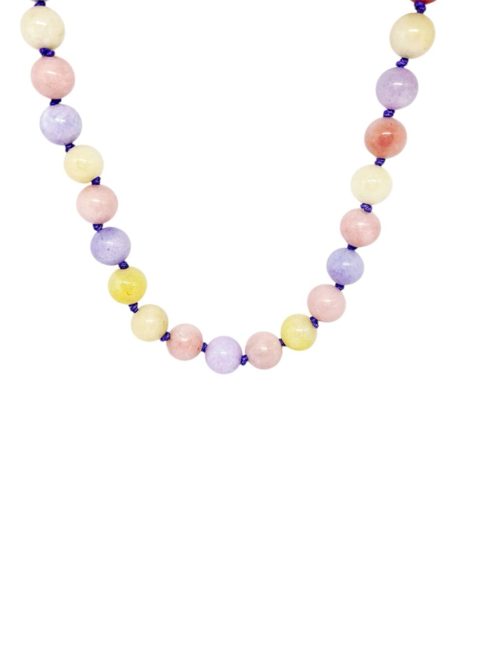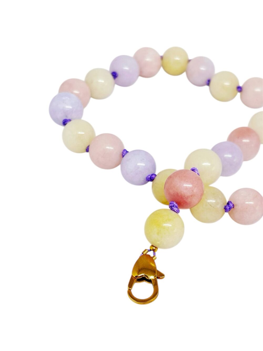 Χειροποιήτο κολιέ με ορυκτό νεφρίτη ,στρογγύλο σε παστέλ χρώματα. Δεμένο διπλό κόμπο-κόμπο με μόβ κορδόνι. Άκρες και κούμπωμα απο ανοξείδωτο ατσάλι, επιχρυσωμένο.