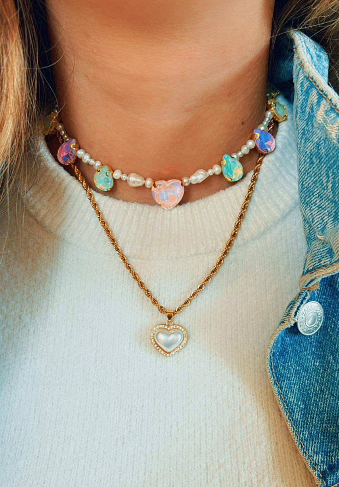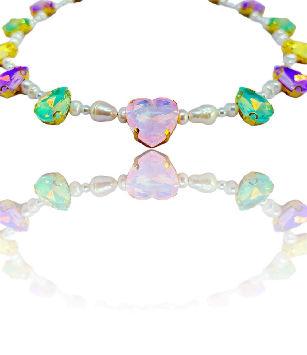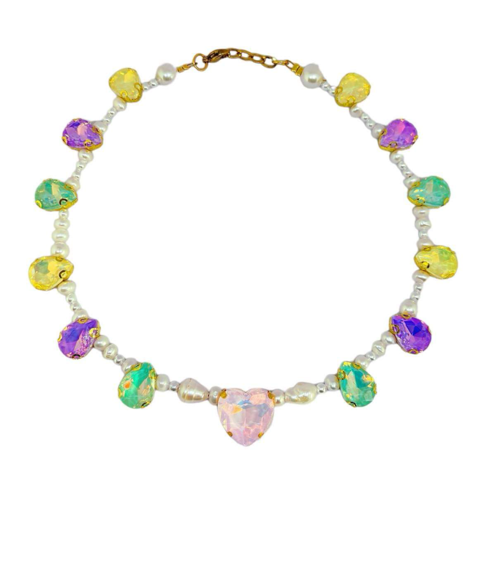 Χειροποιήτο κολιέ με μαργαριτάρια γλυκού νερού ,χρωματιστά ιριδίζον κρύσταλλα σε σχήμα δάκρυ και καρδιά , με βάση απο ατσάλι επίχρυσο. Δεμένο σε ανοξείδωτο ατσάλι.