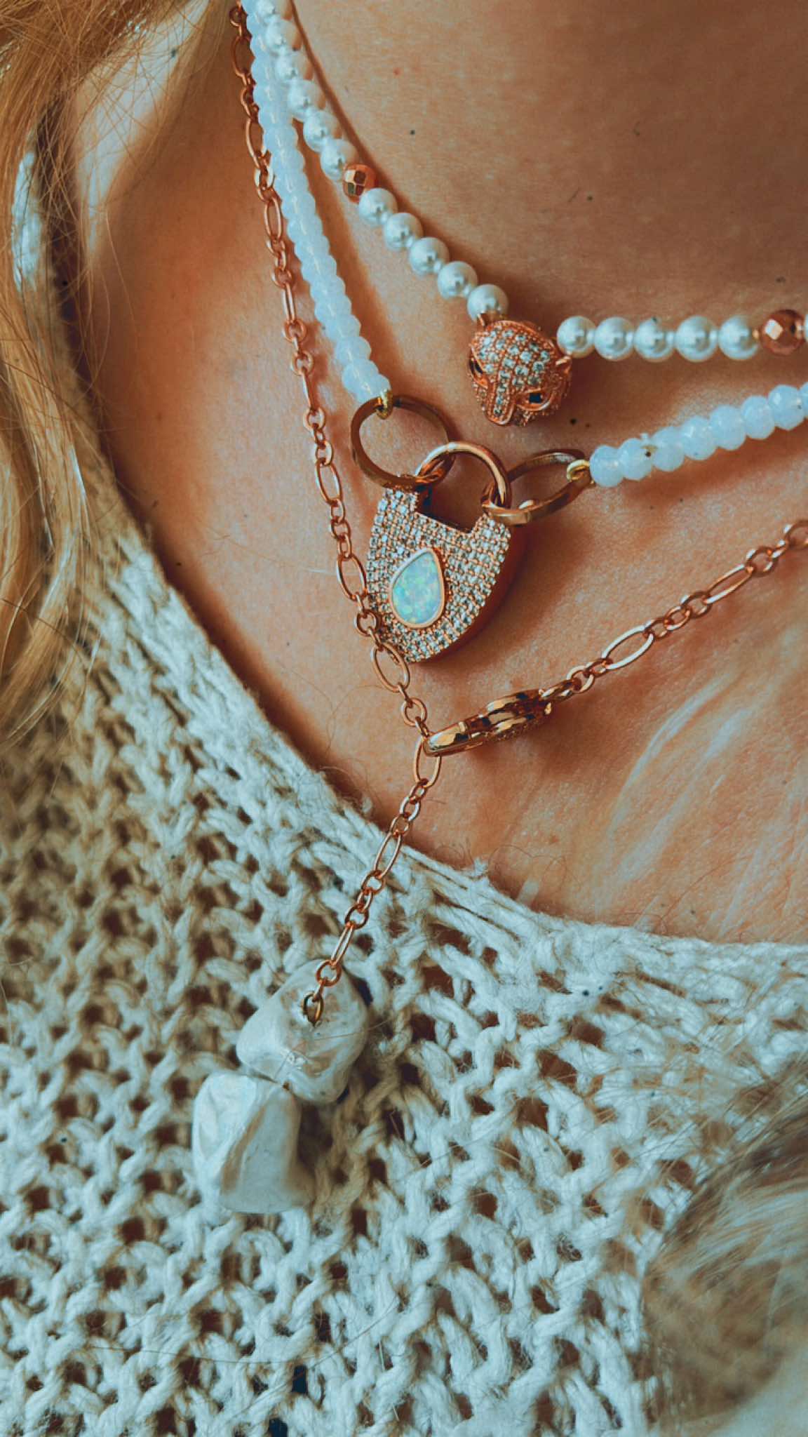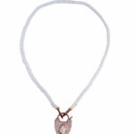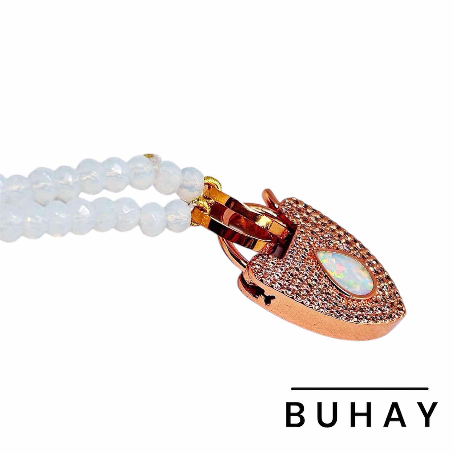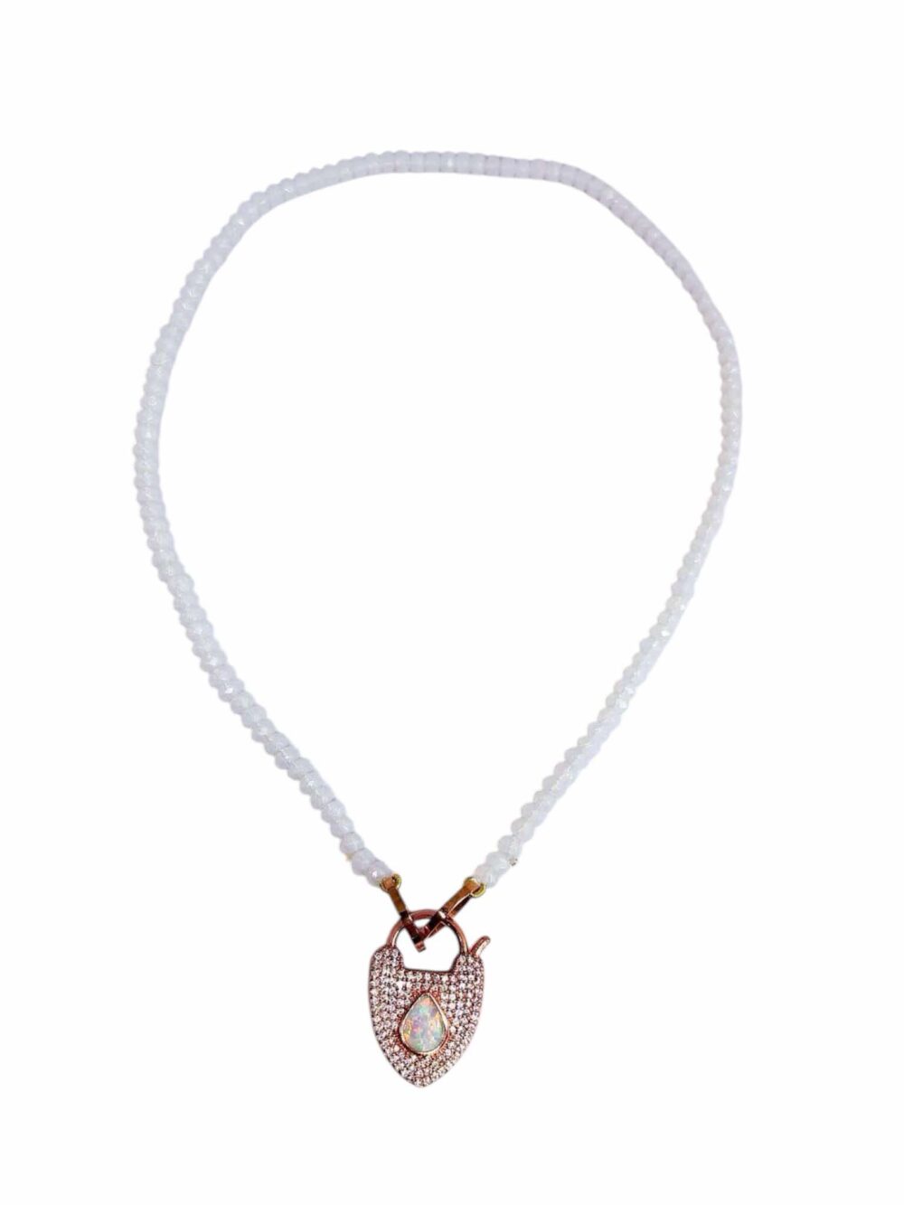Χειροποιήτο κολιέ , με ορυκτό αχάτη σε λευκό γαλακτερό χρώμα , με διπλό δέσιμο λευκής μεταξοκλωστής. Δύο κρίκοι απο ανοξείδωτο ατσάλι στο τελειώμα , ολοκληρωνεται με εντυπωσιακό μενταγιόν-κούμπωμα τύπου λουκέτο , με φίλντισι .Απο οικολογικό ορύχαλκο με ρόζ χρύσωμα.