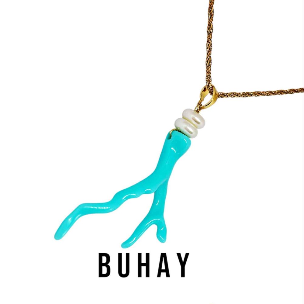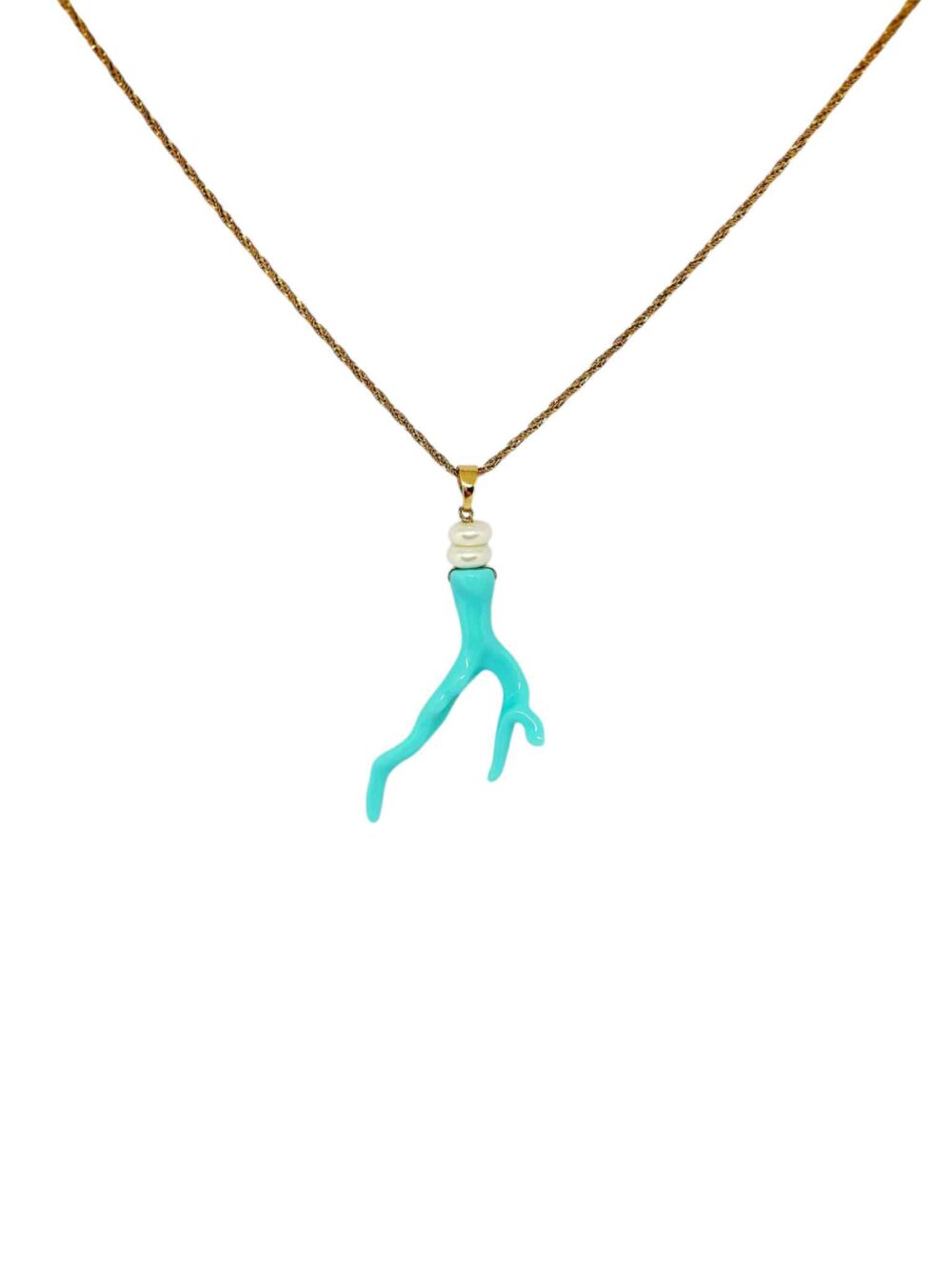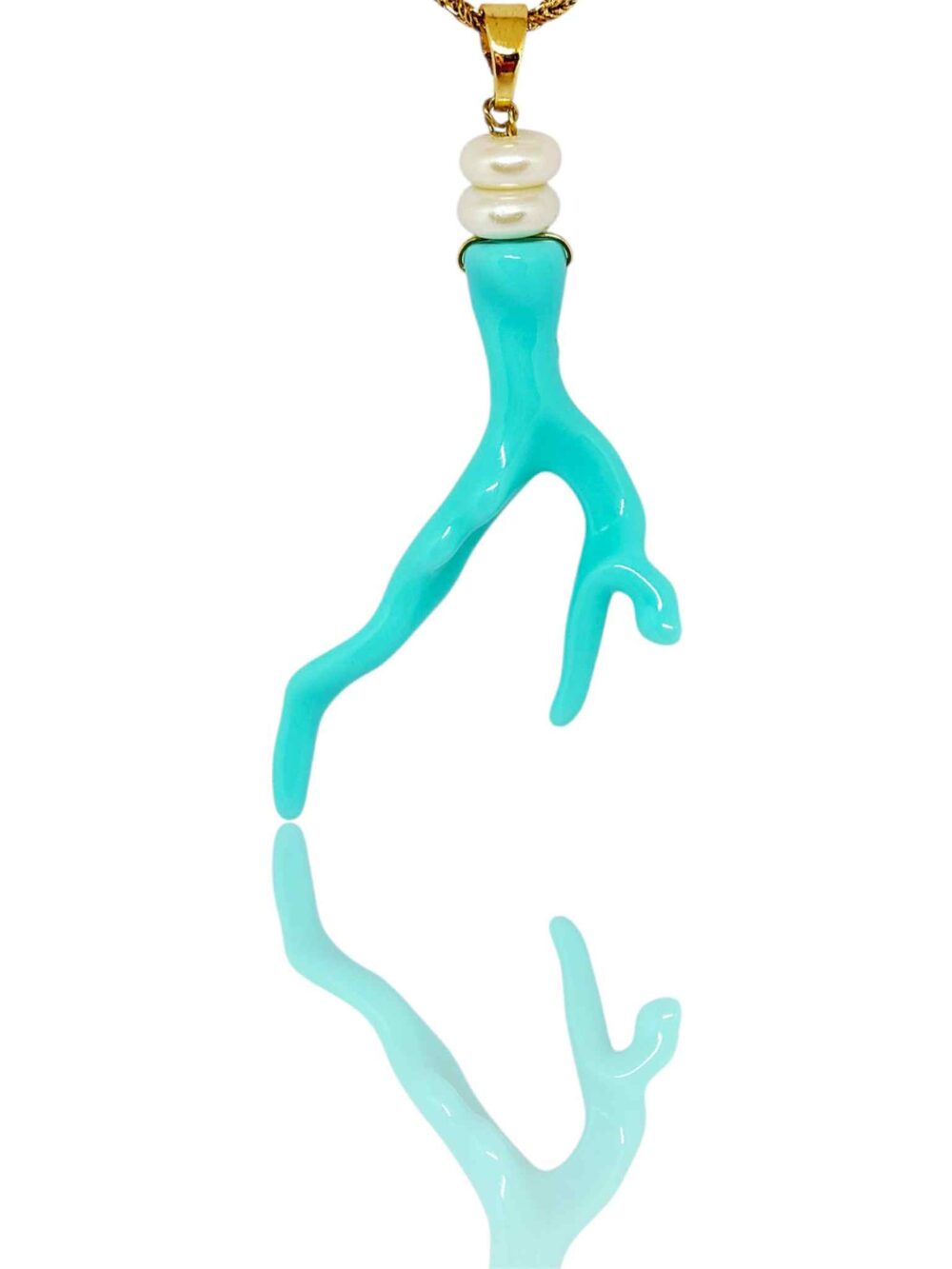 Χειροποιήτο κολιέ με απομίμηση κοραλιού σε τιρκουάζ χρώμα με ροδέλες πέρλας. Περασμένο σε στριφτή αλυσίδα απο ανοξείδωτο ατσάλι , επιχρυσωμένη. Συνδιάστε το με τα σκουλαρίκια OCEAN PULSE.