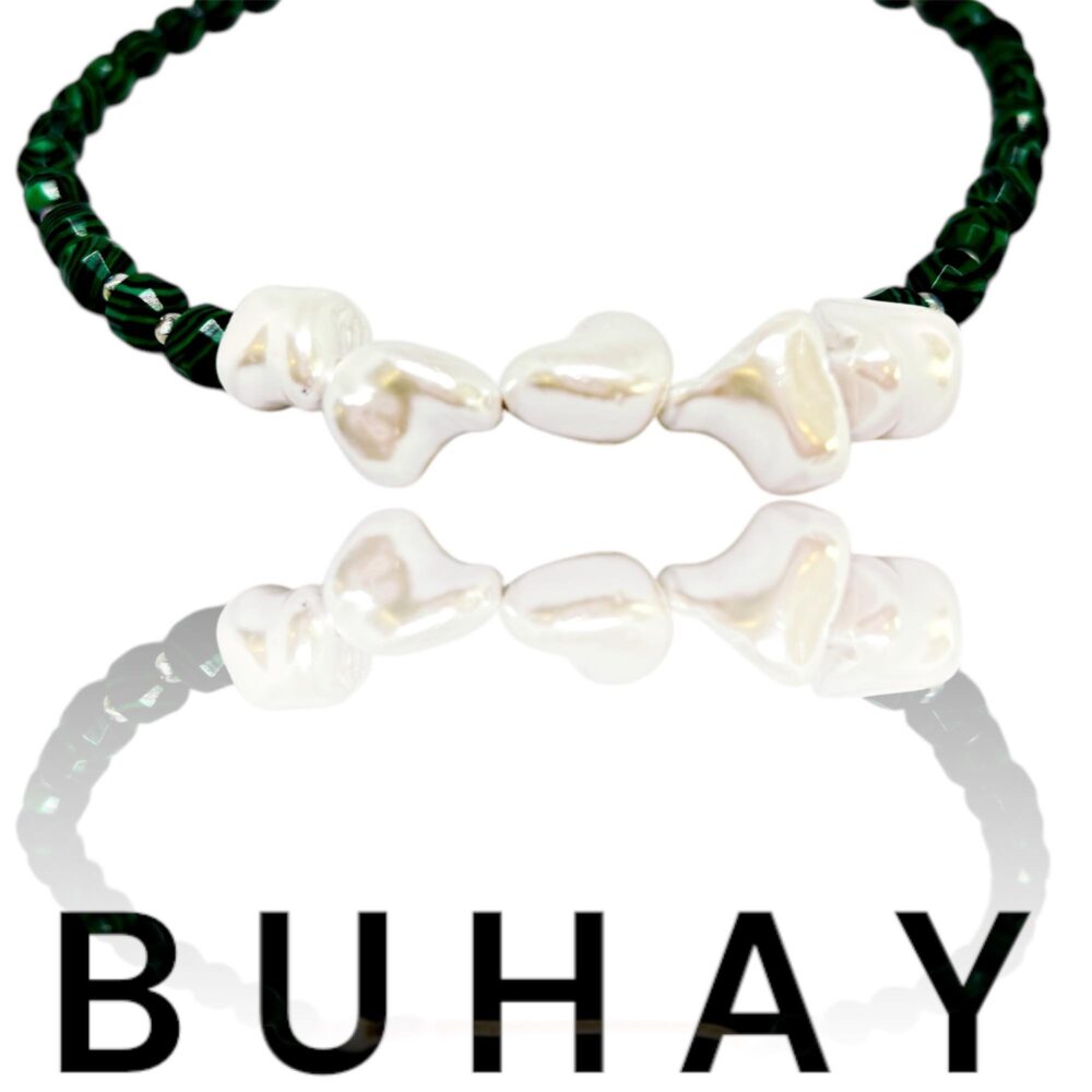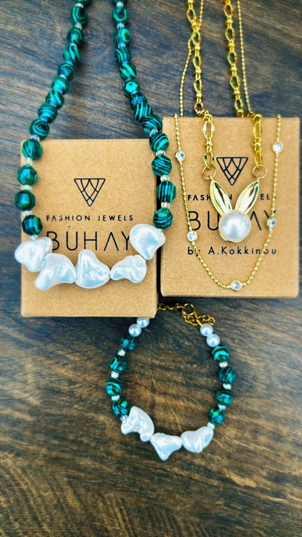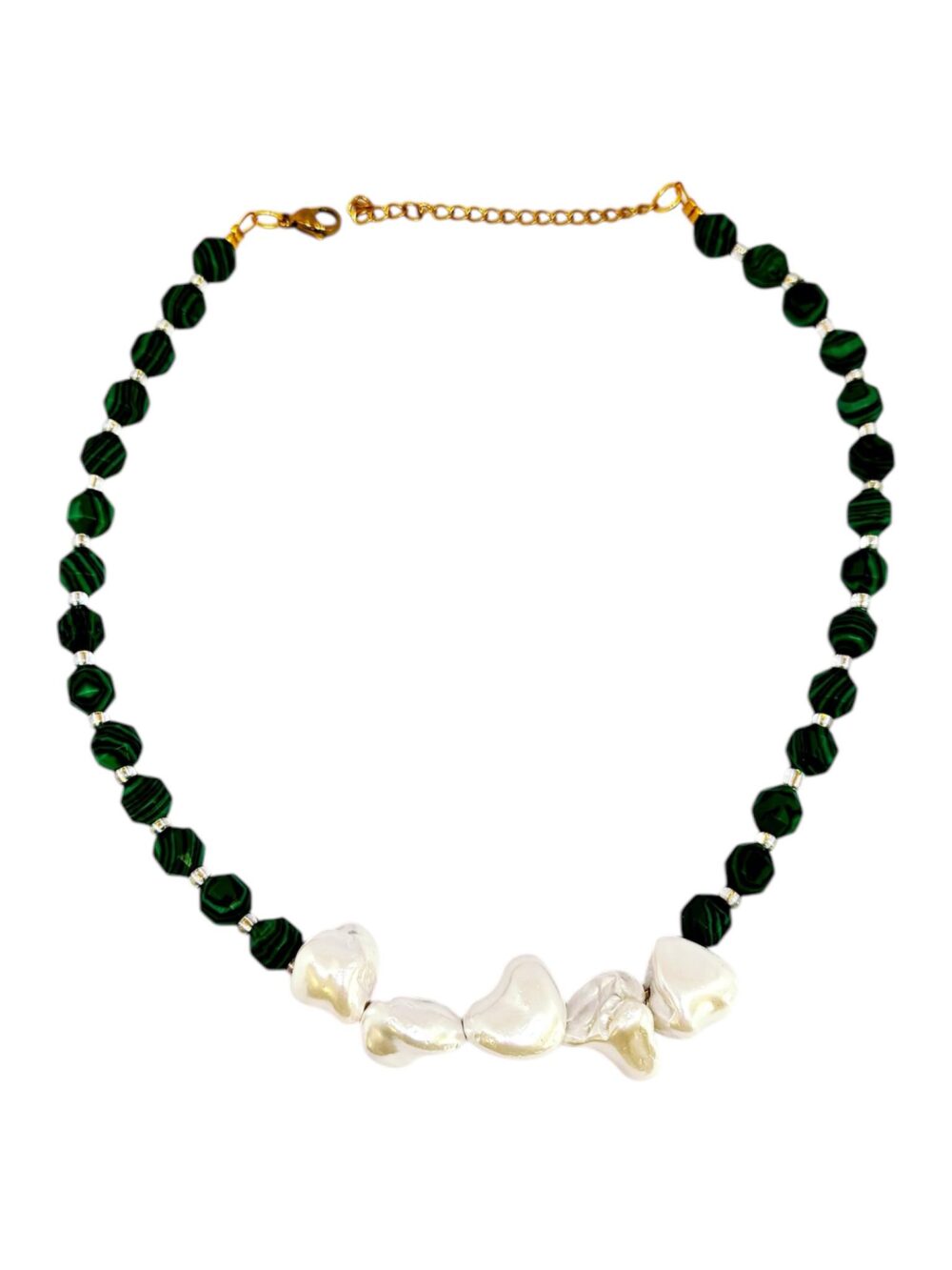 Χειροποιήτο κολιέ με ορυκτό μαλαχίτη και πέρλες. Δεμένο σε ατσάλι.