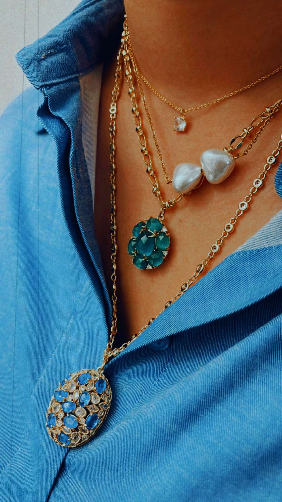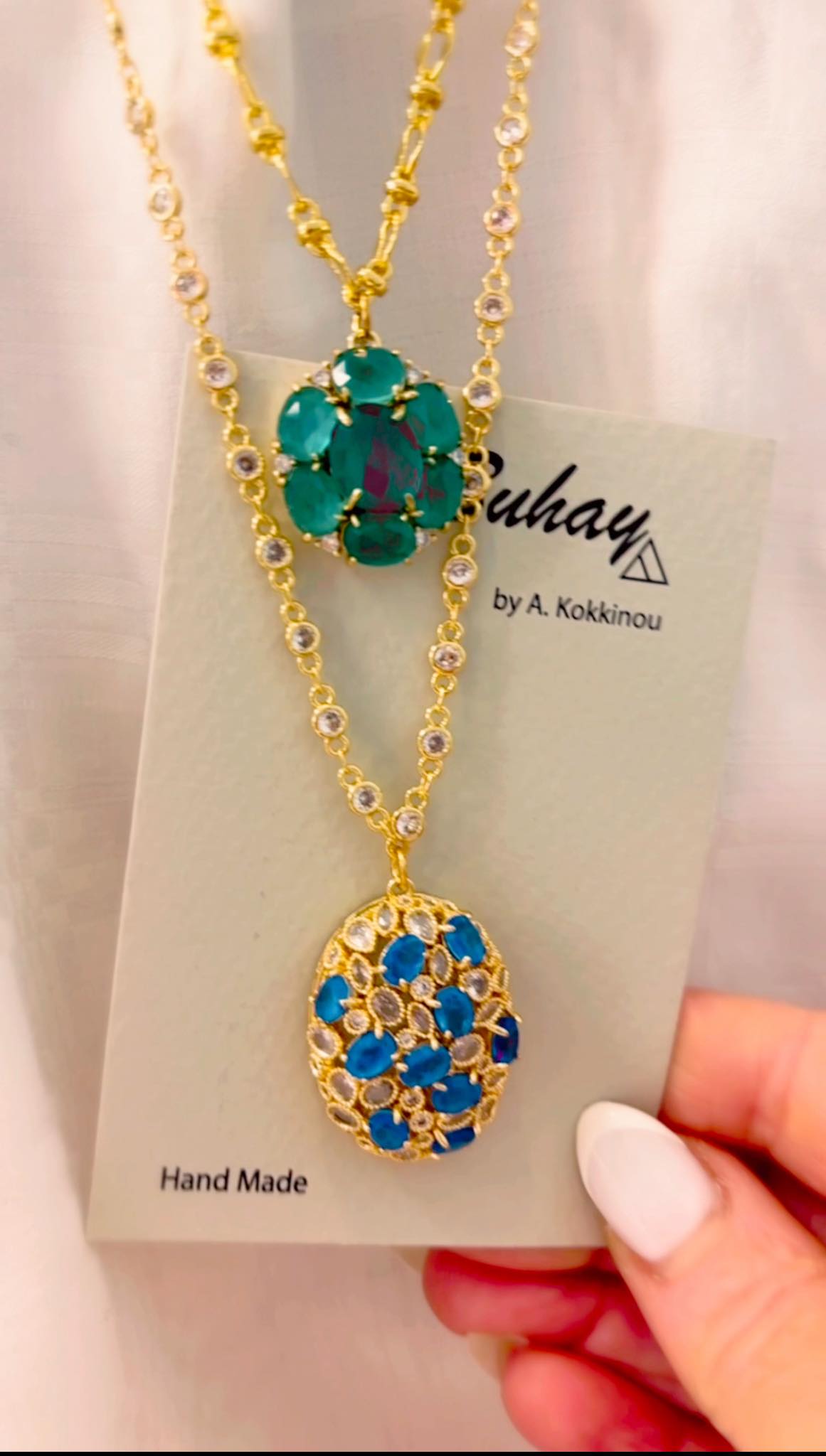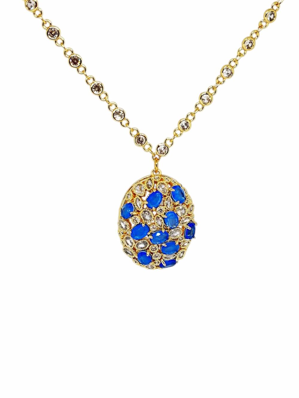 Χειροποιήτο κολιέ απο οικολογικό ορύχαλκο , επιχρυσωμένο. Οβάλ μοτίφ με καρφωμένα μπλέ και γκρί ζιργκόν. Κρεμασμένο σε αλυσίδα τύπου ριβιέρα με ζιργκόν.
