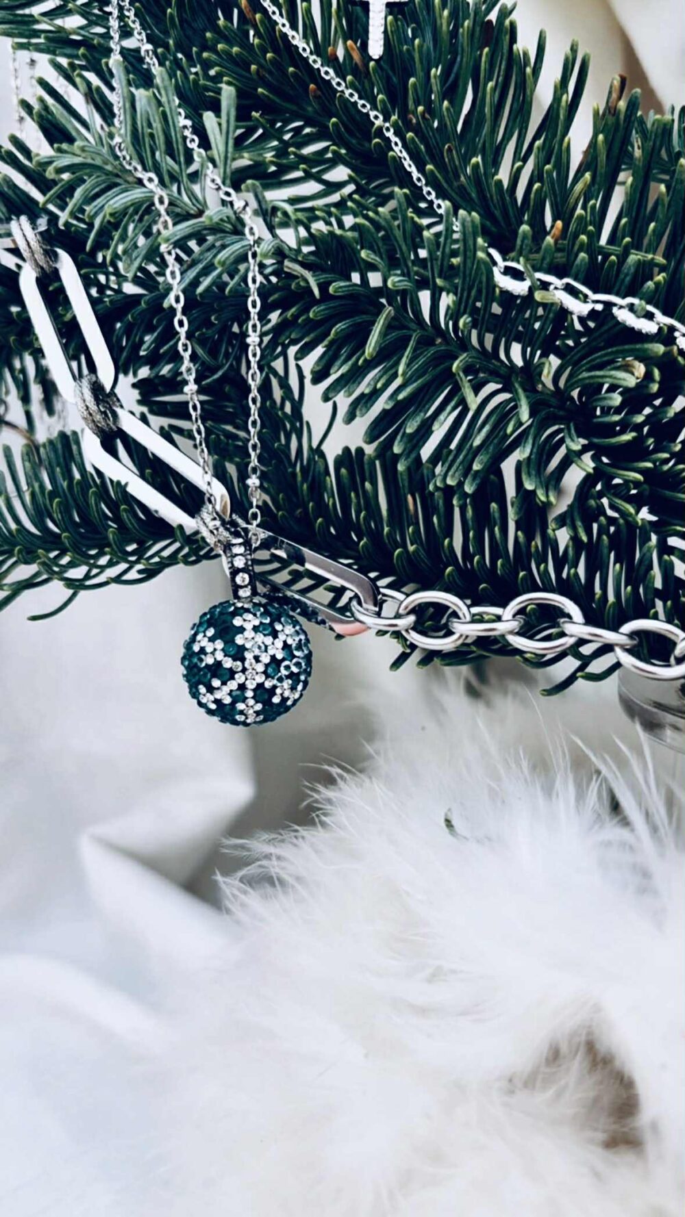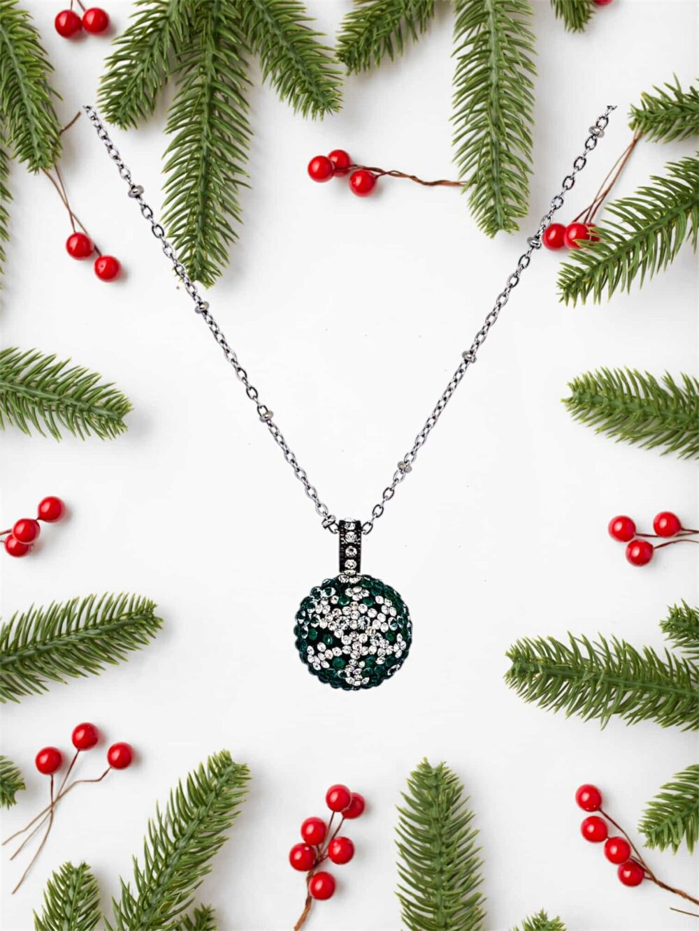 Χειροποιήτο Χρστουγεννιάτικο κολιέ απο ανοξείδωτο ατσάλι. Ιδιαιτερη αλυσίδα , εχει περασμένο στρογγυλό μενταγιόν τύπου μπάλα , γεμάτο ζιργκόν που σχηματίζουν μια νιφάδα χιονιού.