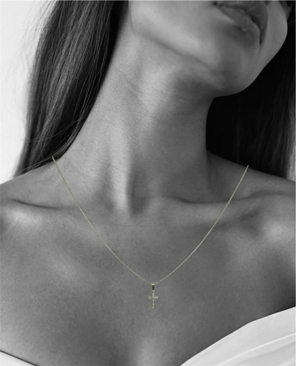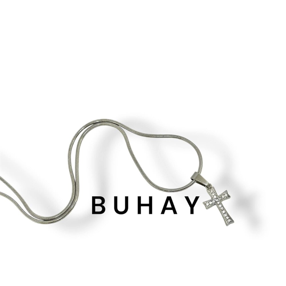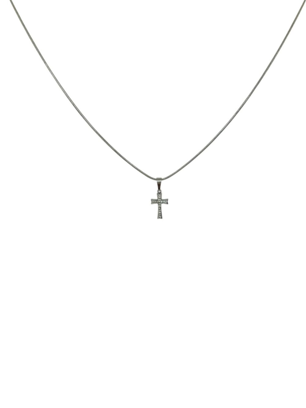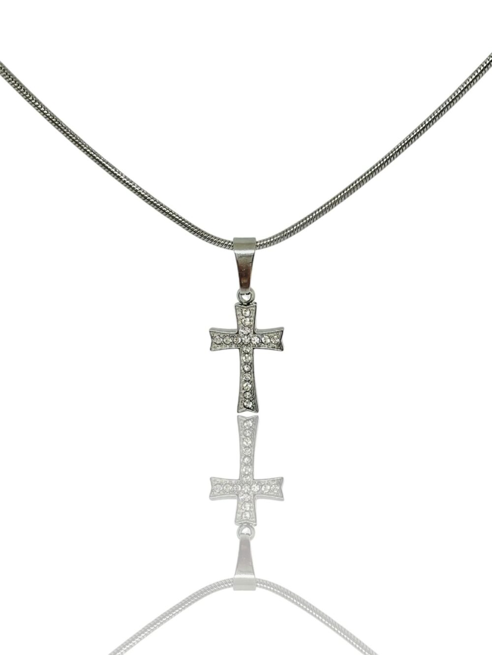 Χειροποιήτο κολιέ απο ανοξείδωτο ατσάλι. Ένας σταυρός με pave zirgon που κρέμεται απο snake chain – το κομμάτι που δένει εξίσου με απλό λευκό tshirt και με βραδινό look.