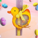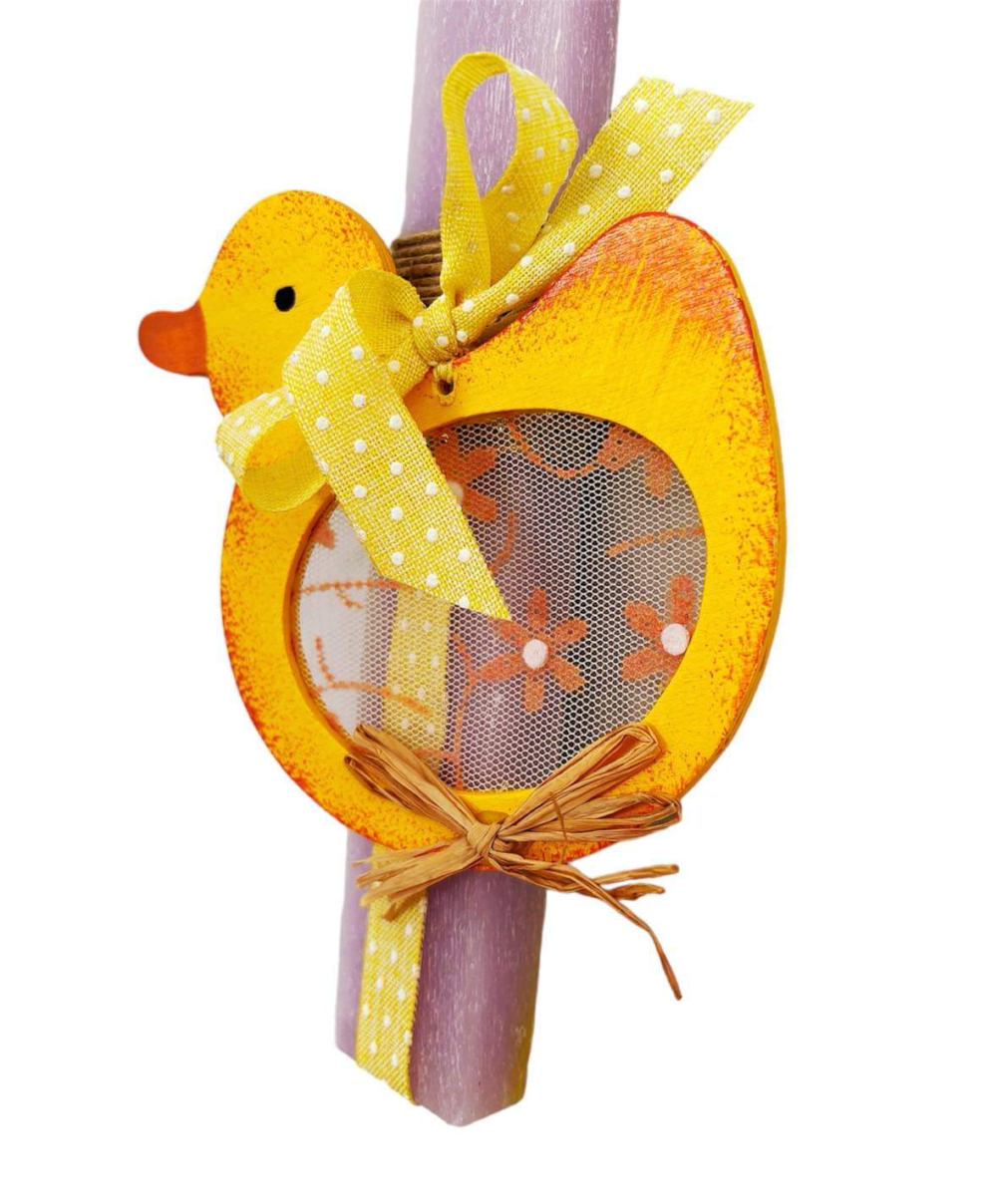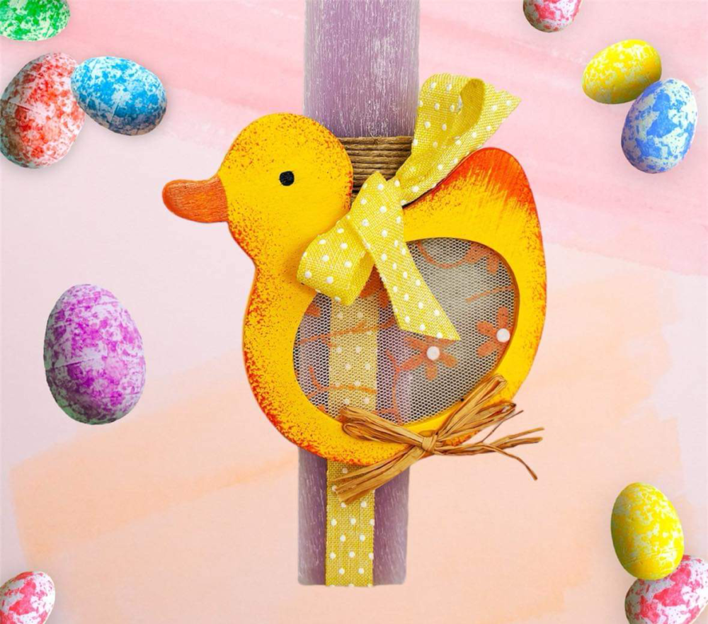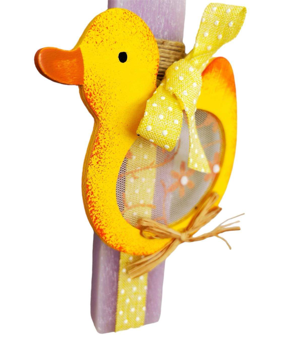 Χειροποιήτη Πασχαλινή πλακέ σαγρέ λαμπάδα , με ξύλινο διακοσμητικό παπάκι .